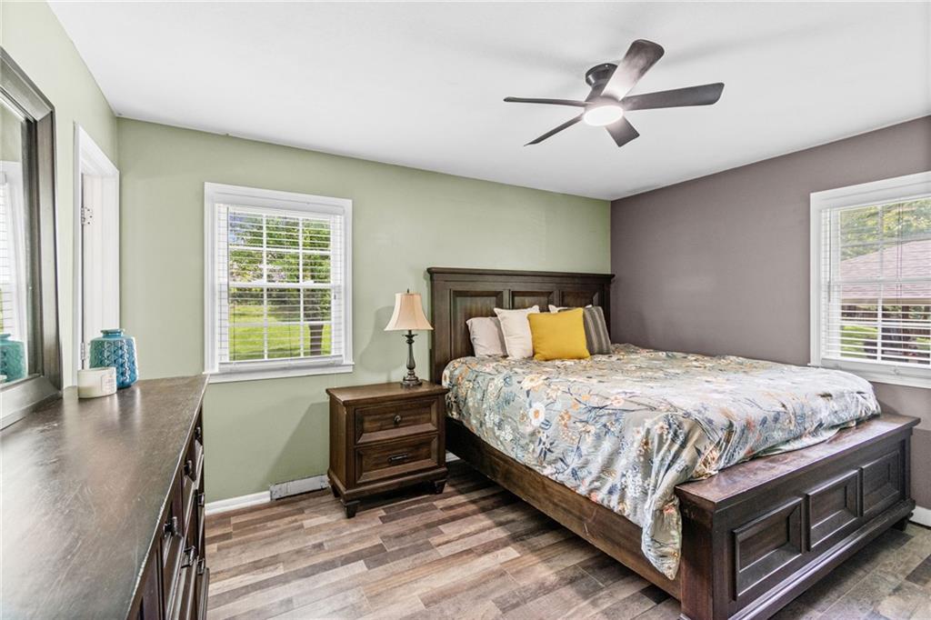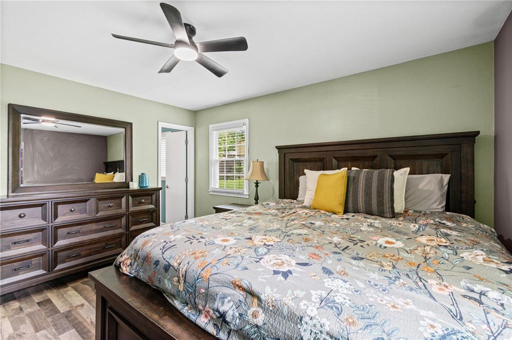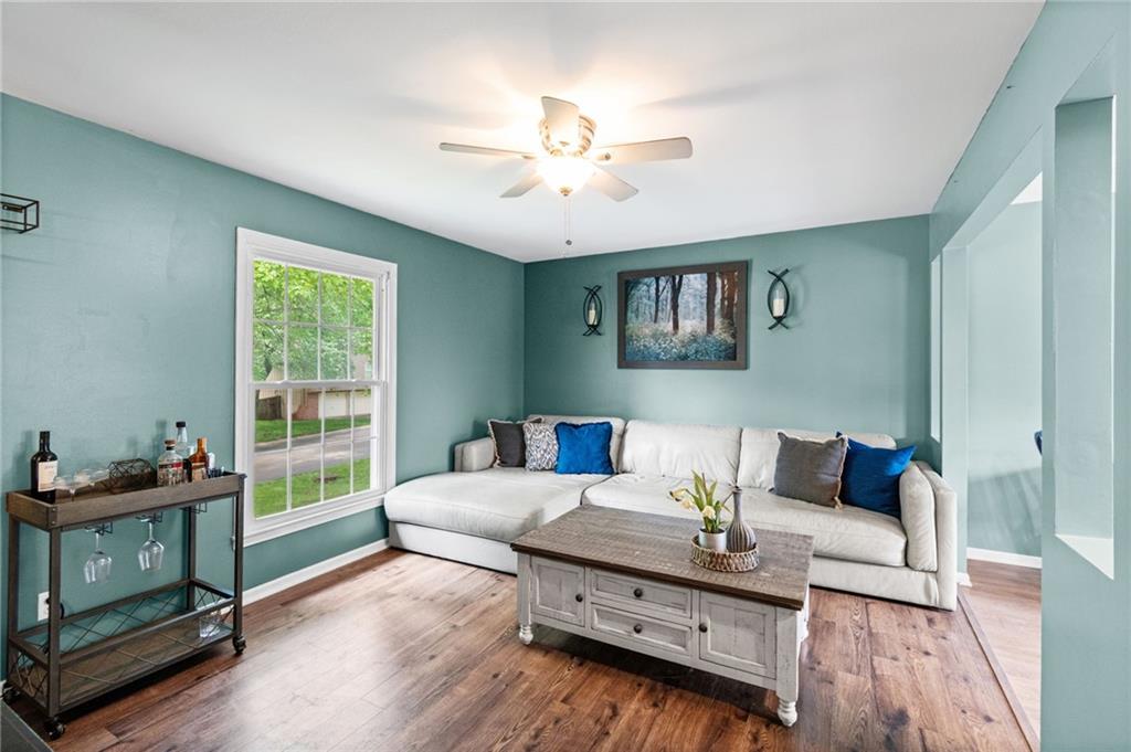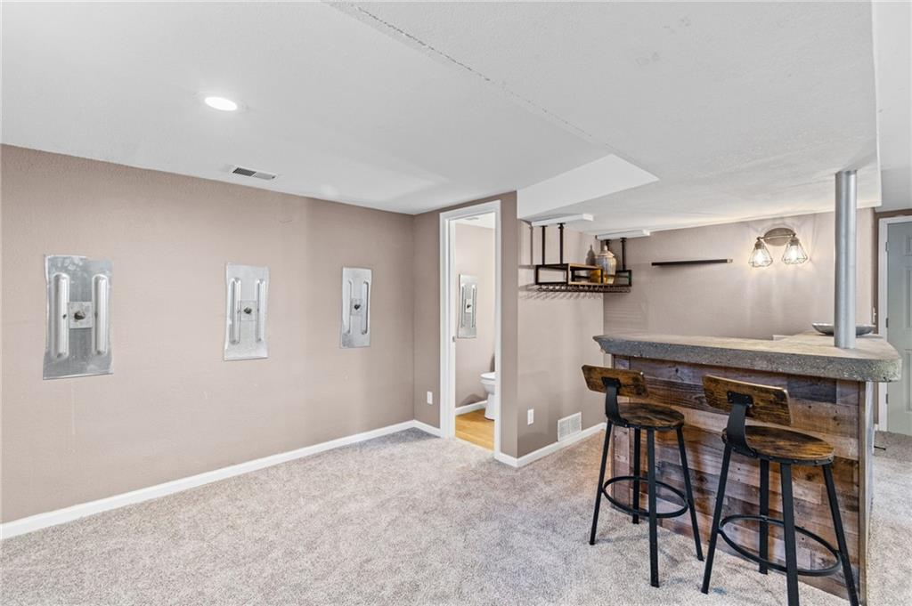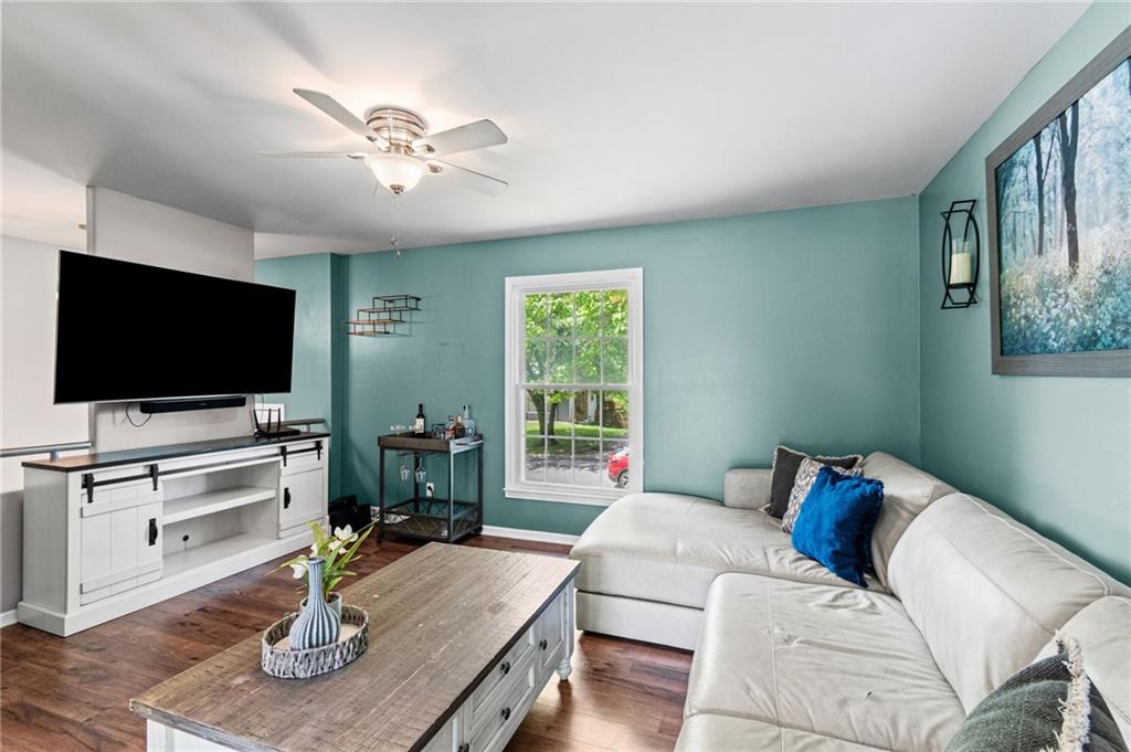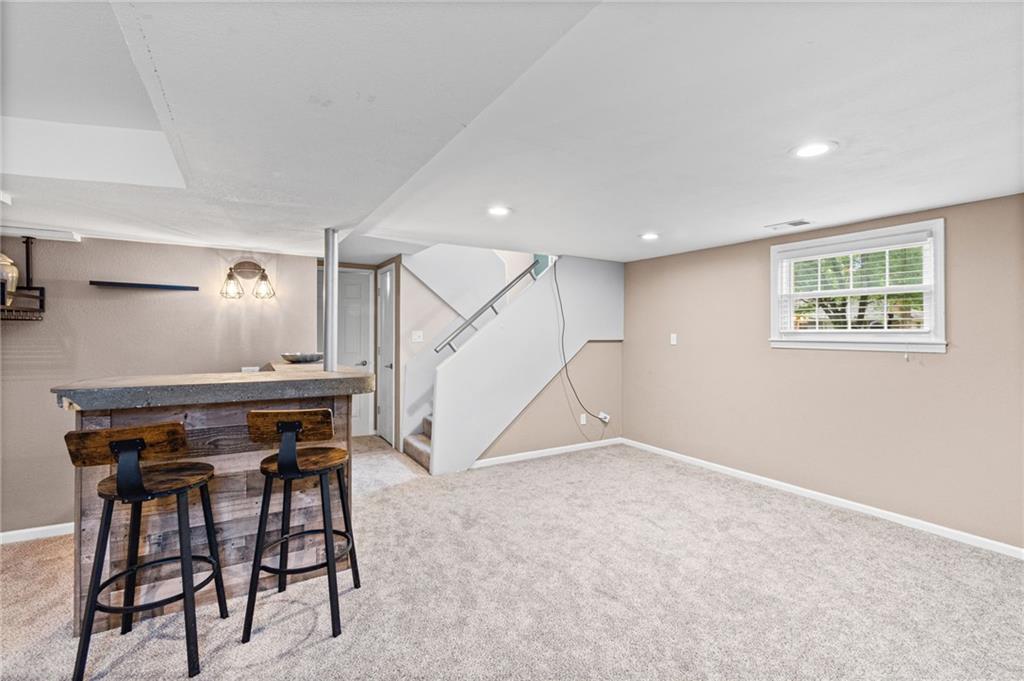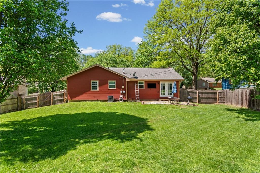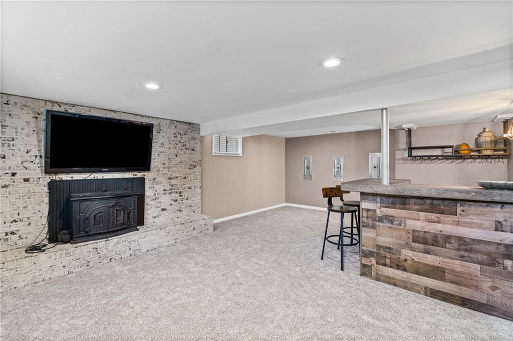 Tucked into a quiet, mature treed cul-de-sac, this inviting raised ranch offers comfort, style, and a highly functional layout. Step inside and head upstairs to find laminate wood flooring flowing seamlessly through the main living areas, hallway, and bedrooms. The light-filled living room sits just off the top of the stairs, featuring a ceiling fan and a large picture window overlooking the front yard, and opens easily to the breakfast area. French doors lead from the breakfast space to the fenced backyard, creating a natural flow for everyday living and entertaining. The kitchen is well-appointed with solid surface counters, a breakfast peninsula with built-in cooktop, modern dark-stained cabinetry, tile backsplash, and stainless appliances including a built-in oven. Down the hall, the owner’s suite offers wood blinds, ceiling fan, a long closet, and a private ensuite bath with tile flooring, solid surface vanity, and tiled shower. Two additional bedrooms with ceiling fans and wood blinds share a hall bath with tub/shower combination and extended vanity. The lower level expands your living space with a daylight family room featuring a wood-burning masonry fireplace and walkout access to the garage. An adjoining recreation area includes an L-shaped rustic wood bar with sink—perfect for gatherings. A convenient half bath and laundry room complete the lower level. Enjoy the privacy of a fenced backyard and a location just minutes from The National Golf Club, Highway 45, shopping, dining, and everyday amenities.