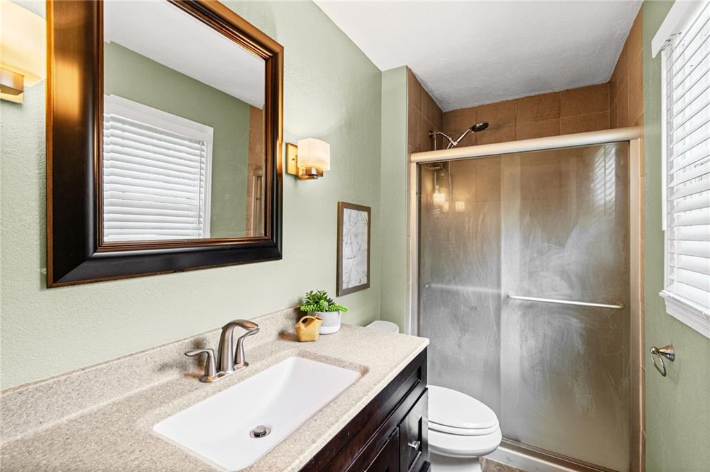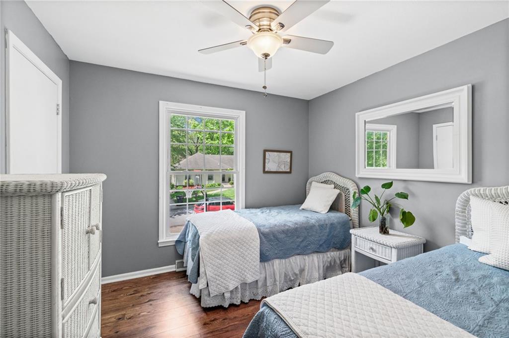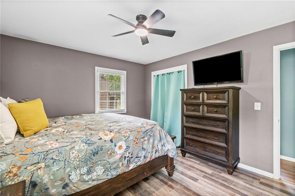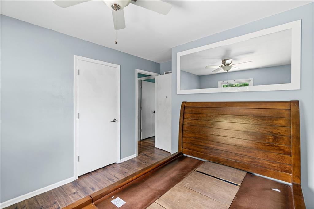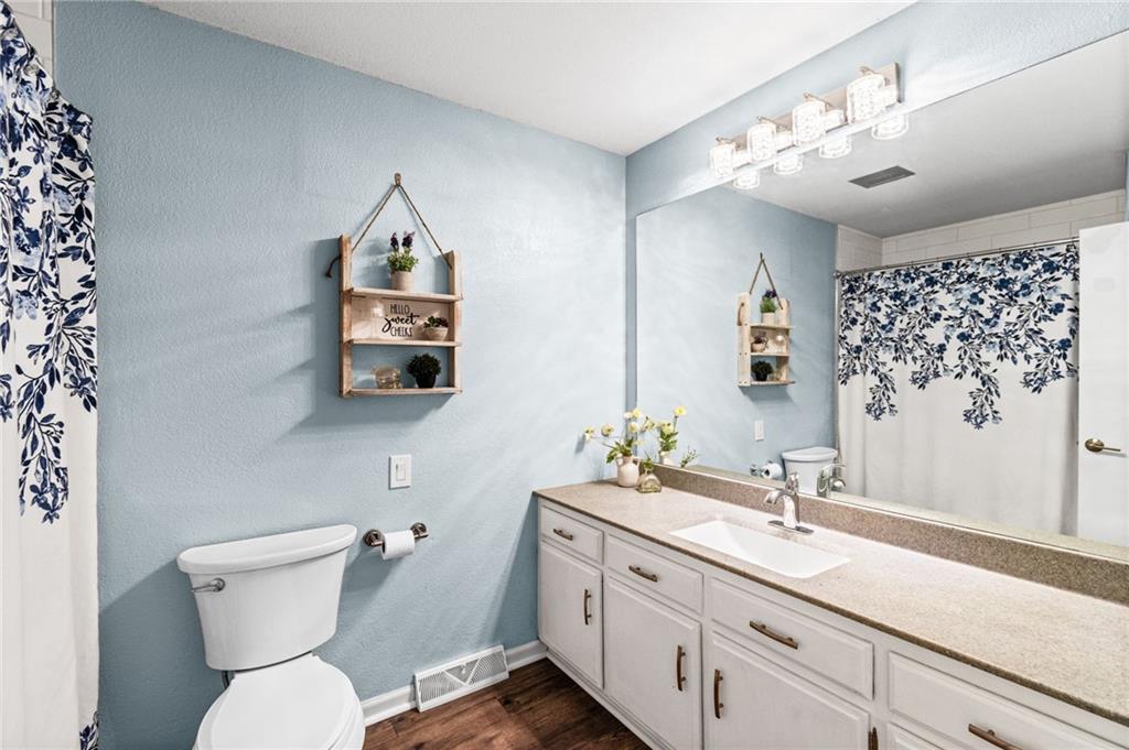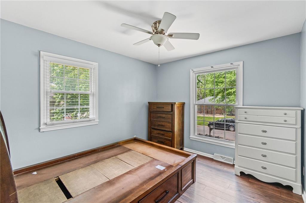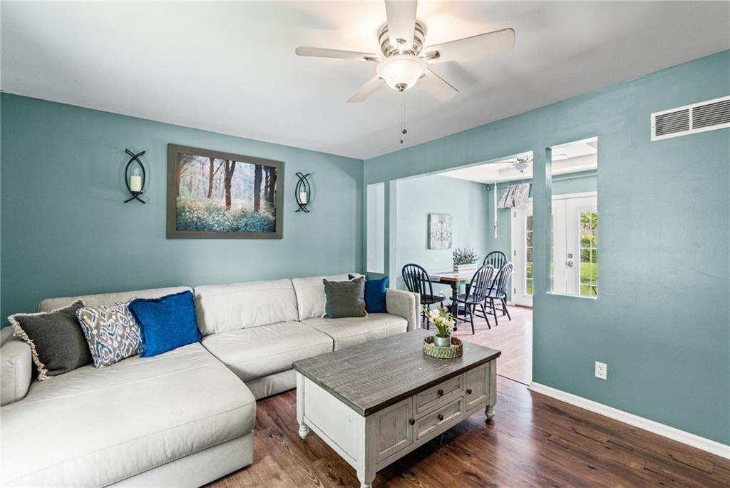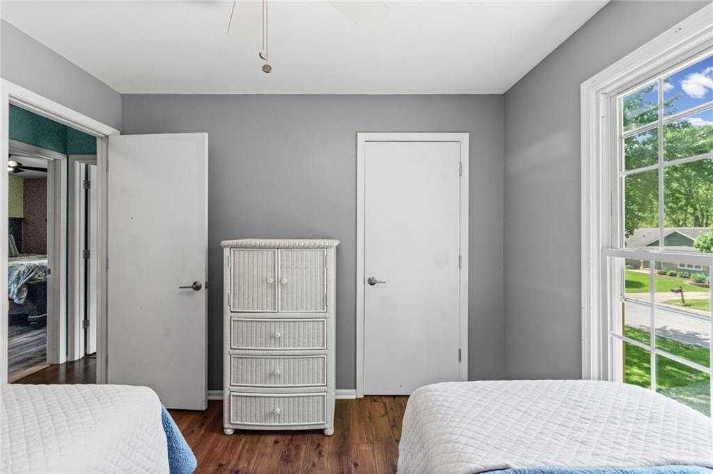 Tucked into a quiet, mature treed cul-de-sac, this inviting raised ranch offers comfort, style, and a highly functional layout. Step inside and head upstairs to find laminate wood flooring flowing seamlessly through the main living areas, hallway, and bedrooms. The light-filled living room sits just off the top of the stairs, featuring a ceiling fan and a large picture window overlooking the front yard, and opens easily to the breakfast area. French doors lead from the breakfast space to the fenced backyard, creating a natural flow for everyday living and entertaining. The kitchen is well-appointed with solid surface counters, a breakfast peninsula with built-in cooktop, modern dark-stained cabinetry, tile backsplash, and stainless appliances including a built-in oven. Down the hall, the owner’s suite offers wood blinds, ceiling fan, a long closet, and a private ensuite bath with tile flooring, solid surface vanity, and tiled shower. Two additional bedrooms with ceiling fans and wood blinds share a hall bath with tub/shower combination and extended vanity. The lower level expands your living space with a daylight family room featuring a wood-burning masonry fireplace and walkout access to the garage. An adjoining recreation area includes an L-shaped rustic wood bar with sink—perfect for gatherings. A convenient half bath and laundry room complete the lower level. Enjoy the privacy of a fenced backyard and a location just minutes from The National Golf Club, Highway 45, shopping, dining, and everyday amenities.