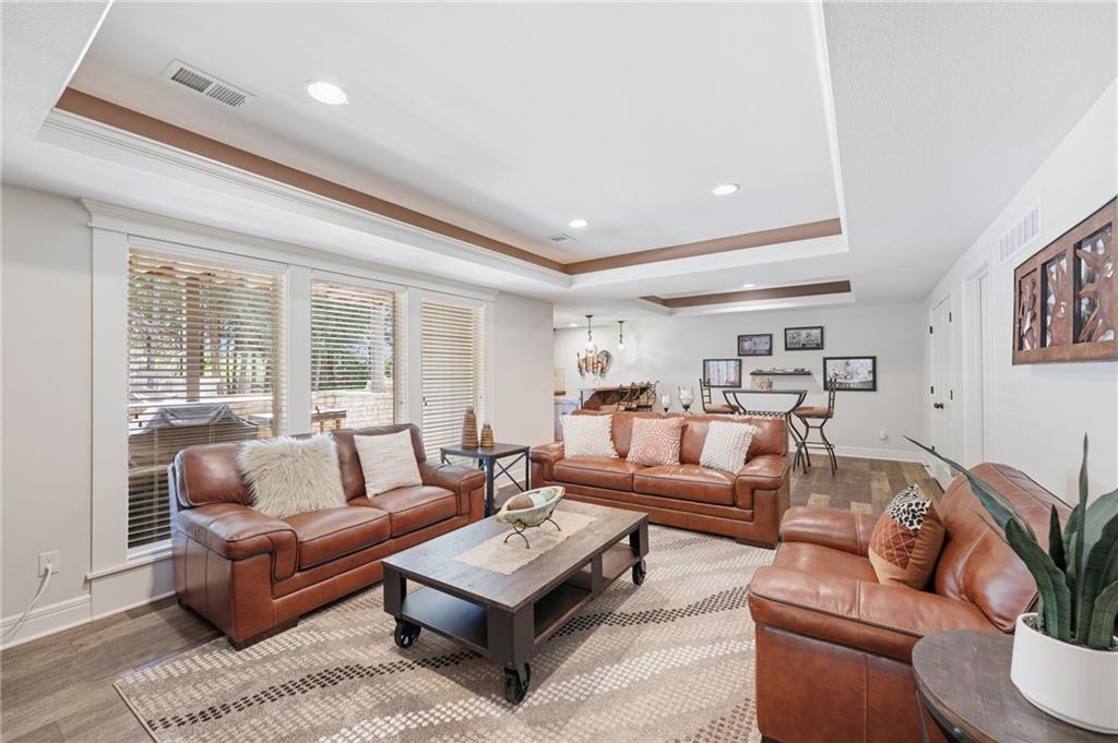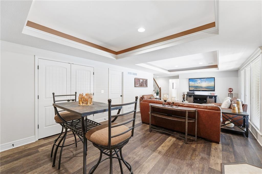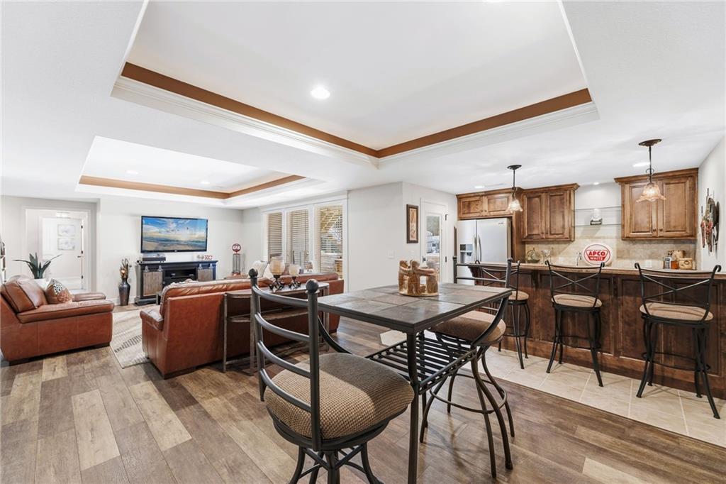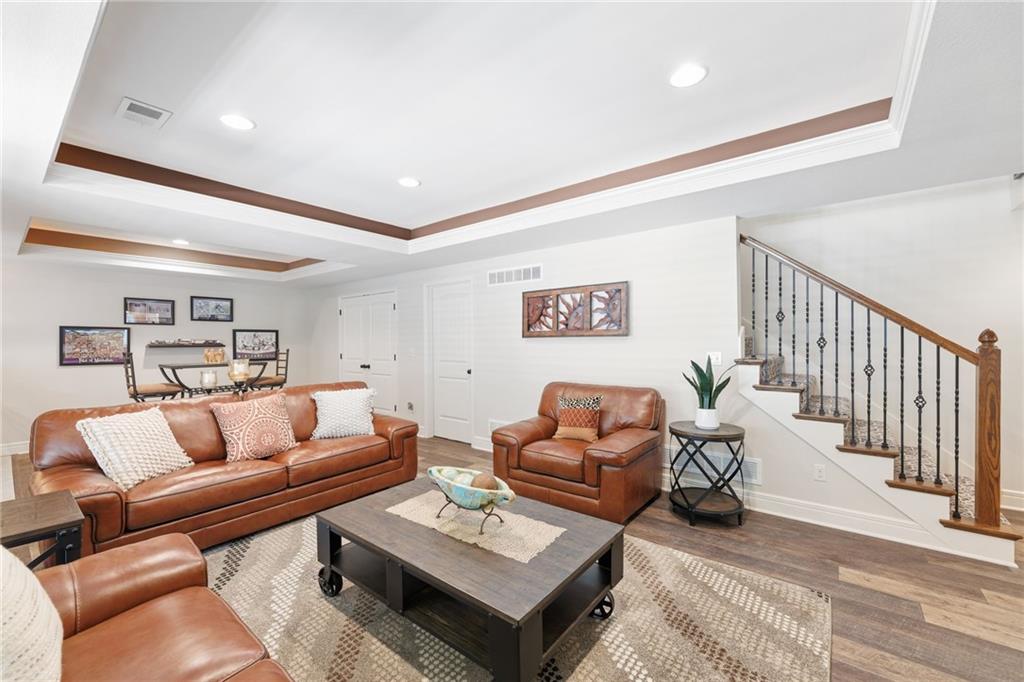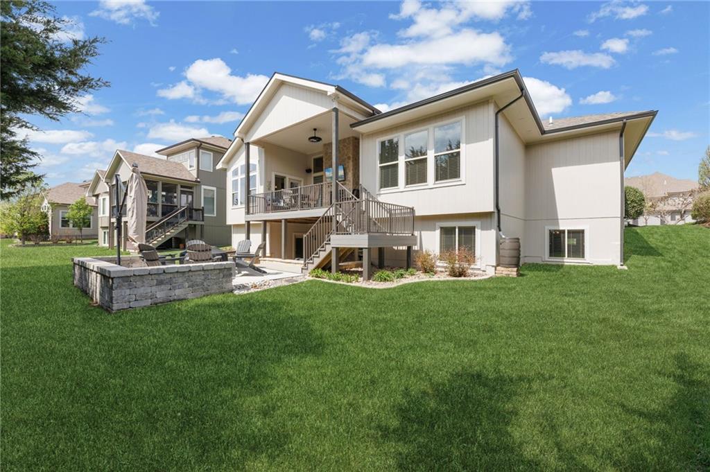 Welcome to this stunning former model home by James Engle Homes, showcasing the highly sought-after Emery reverse floor plan and loaded with gorgeous upgrades throughout. This beautifully designed 4-bedroom home offers the perfect blend of luxury and functionality. The main level features a spacious, light-filled great room with rich wood flooring and a striking see-through stone fireplace that extends to the covered, maintenance-free deck—creating a warm and inviting atmosphere both indoors and out. The gourmet kitchen is equally impressive, complete with granite countertops, double ovens, and a generous walk-in pantry, making it perfect for everyday living and entertaining. The luxurious primary suite offers a private retreat with dual vanities and a custom-tiled walk-in shower. The finished walkout/walkup lower level expands your living space with a large rec room, wet bar, two additional bedrooms, and a full bath—ideal for guests or entertaining. Step outside to enjoy exceptional outdoor living, including the covered deck with fireplace access and a beautifully designed stone patio with a fire pit, all backing to a serene tree line for added privacy. Additional highlights include a newer roof (just 2 years old) and access to fantastic neighborhood amenities, including a community pool. This home truly offers comfort, style, and convenience—don’t miss your opportunity to make it yours!