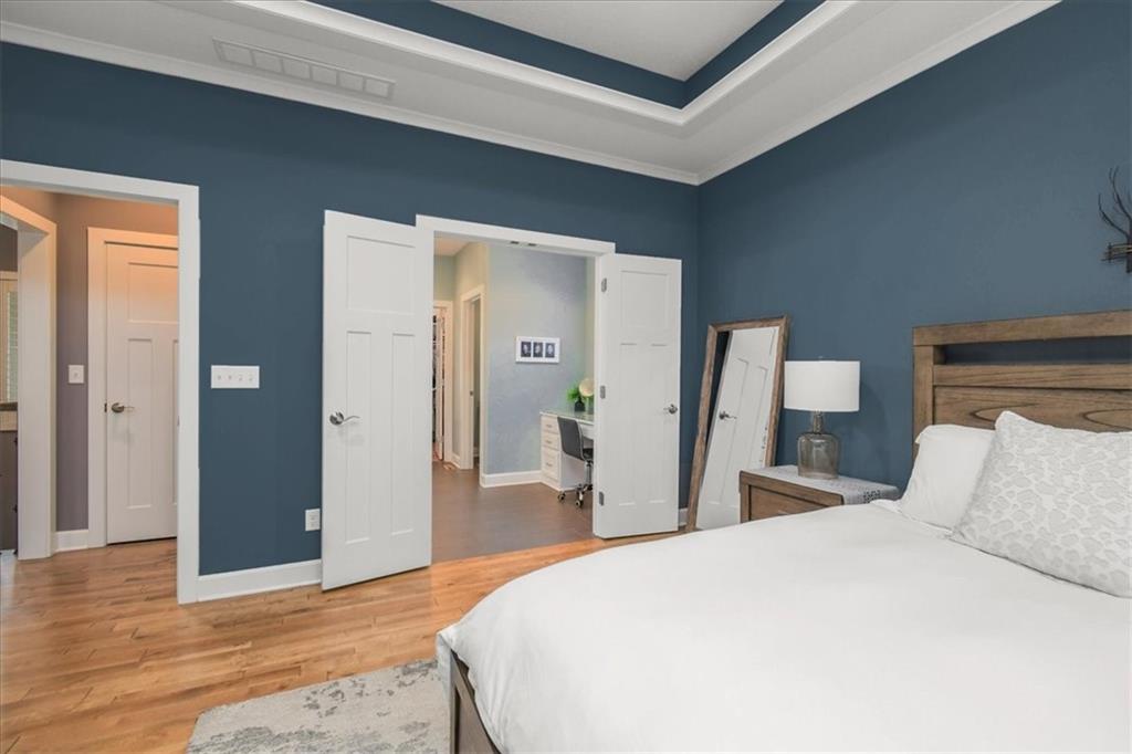 Prepare to be absolutely wowed by this ranch-style architectural masterpiece, a turnkey property where contemporary design meets luxurious, comfortable living. The home immediately impresses with its stunning façade of textured stucco and stacked stone accents, setting a sophisticated tone from the curb. Step inside onto gleaming hardwood floors that guide you through the expansive, open-concept design, flooded with natural light from oversized windows, most accented with custom plantation shutters. The heart of the home is the gourmet kitchen, a true chef's dream, showcasing rich, dark wood cabinetry equipped with soft close cabinets throughout, sleek granite countertops, and a show-stopping dark gray center island with seating—perfect for hosting and entertaining. Transition from the kitchen to the bright dining area and the spacious living room, anchored by a magnificent corner stone fireplace for cozy evenings. Retreat to the main floor private sanctuary in the primary suite, an oasis of calm with a stylish blue accent wall and an elegant tray ceiling that adds grandeur. The spa-like en-suite boasts a sleek double vanity with crisp white cabinetry, a glass-enclosed walk-in shower, and leads into a custom walk-in closet with ample built-in organization. Adding to the home's impressive functionality is a main-floor laundry room with gorgeous dark wood cabinetry, offering maximum convenience, complemented by a central vacuum system. For outdoor enjoyment, step onto the covered back patio, ideal for al-fresco dining or relaxing with a ceiling fan overhead. Below, the vast, unfinished basement presents a phenomenal opportunity to customize and expand—a blank canvas for adding a future home gym, theater, or additional living space to create your ultimate dream home. This is more than a home; it's an uncompromising quality lifestyle awaiting its new owner in a coveted community with excellent highway access for a convenient commute.