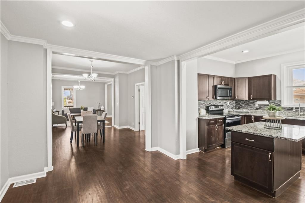 Welcome home to this charming 1920's home, centrally located gem just 10 minutes from downtown Kansas City—perfectly situated within walking distance to the shops and restaurants of Strawberry Hill. Start your day on the spacious front deck—perfect for morning coffee or unwinding in the evening. Step inside to a warm and welcoming living room featuring durable LVP flooring, flowing seamlessly into the formal dining area and open kitchen. Here, you’ll find granite countertops, a center island, ample cabinet space, and all appliances included—making it as functional as it is inviting. Out back, a second deck creates the perfect setting for relaxing evenings or entertaining guests. The main level offers flexibility with a bedroom that can also serve as a home office, along with a full bathroom for added convenience. Upstairs, you’ll find three additional bedrooms, including a comfortable primary suite with dual vanities, a stand-up shower, and your own private balcony—your own quiet escape at the end of the day. A laundry closet is conveniently located just off the hallway. The home continues to impress with neutral finishes throughout, a newer HVAC system (approximately 5 years old), and a walkout basement offering plenty of storage space. A carport located just behind the home adds extra convenience.