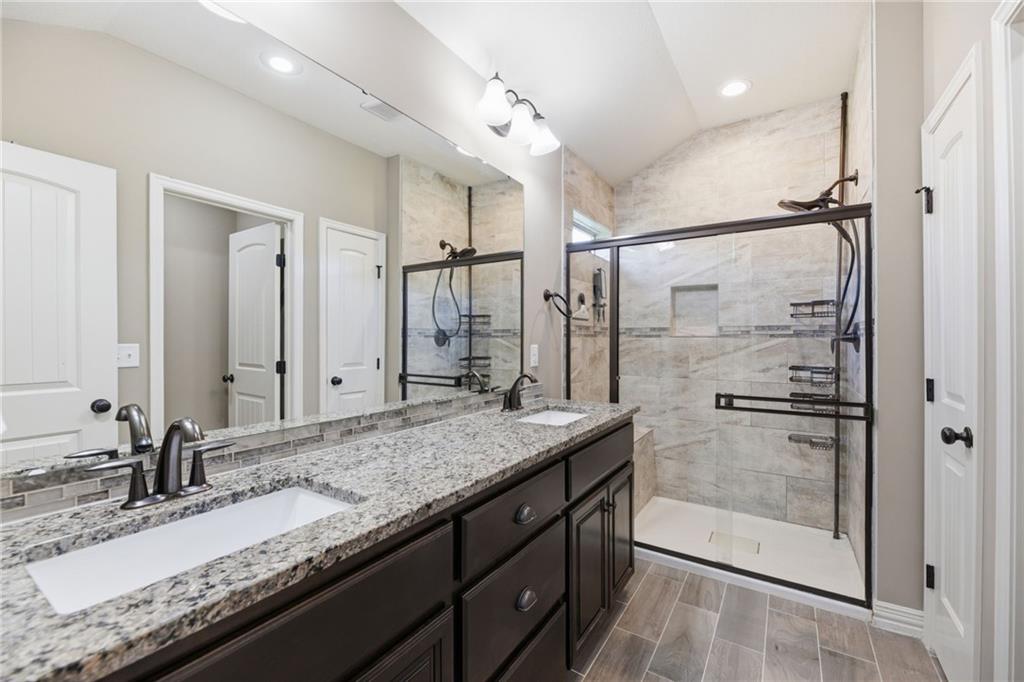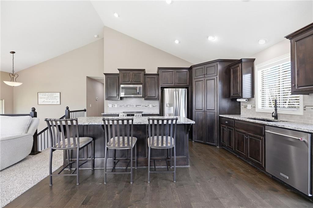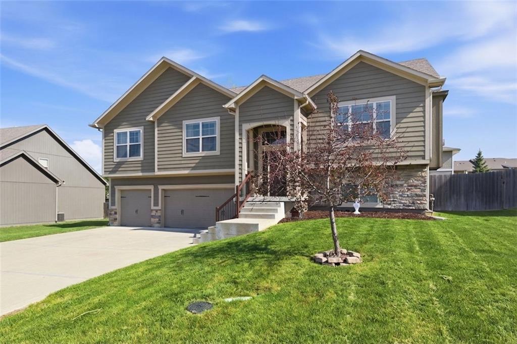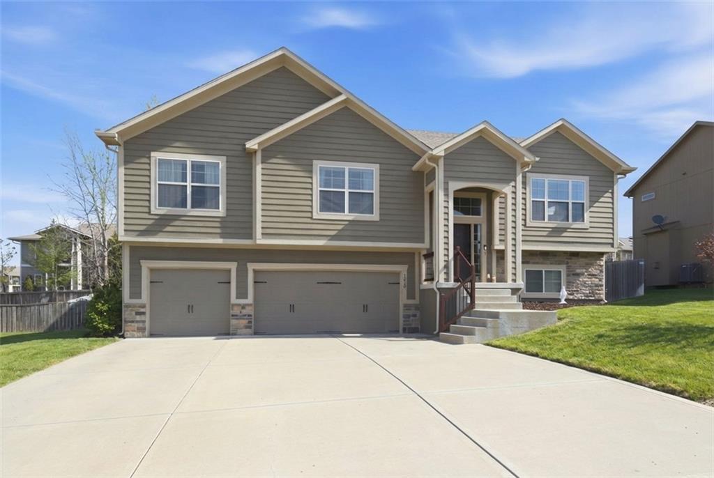 STUNNING OPEN FLOOR PLAN WITH ALL THE EXTRAS! This spacious home delivers the space, features, and functionality —plus a fully finished basement and a 3-car garage for added flexibility and storage. Designed with entertaining in mind, featuring a seamless flow between living spaces and plenty of room to gather. Family room showcases vaulted ceilings and a cozy fireplace—perfect for relaxing evenings at home. Kitchen is a true centerpiece, complete with granite countertops, stainless steel appliances, timeless cabinetry, large center eat-in island and a walk-in pantry. Access the deck from the dining area for seamless outdoor cooking. Retreat to the expansive primary suite featuring a large walk-in closet, dual vanity and walk-in shower. Conveniently located just off the primary suite, the walk-in laundry room adds ease to your daily routine. Two additional bedrooms, each with walk-in closets and second full bath completes the main level. Lower level (garage entry) features a rec room and half bath. Step outside to enjoy the fenced backyard with a spacious deck—ideal for hosting guests or enjoying your morning coffee. Fantastic location just minutes to parks, shopping and major highway access to enjoy all the KC Area has to offer. WELCOME HOME!
