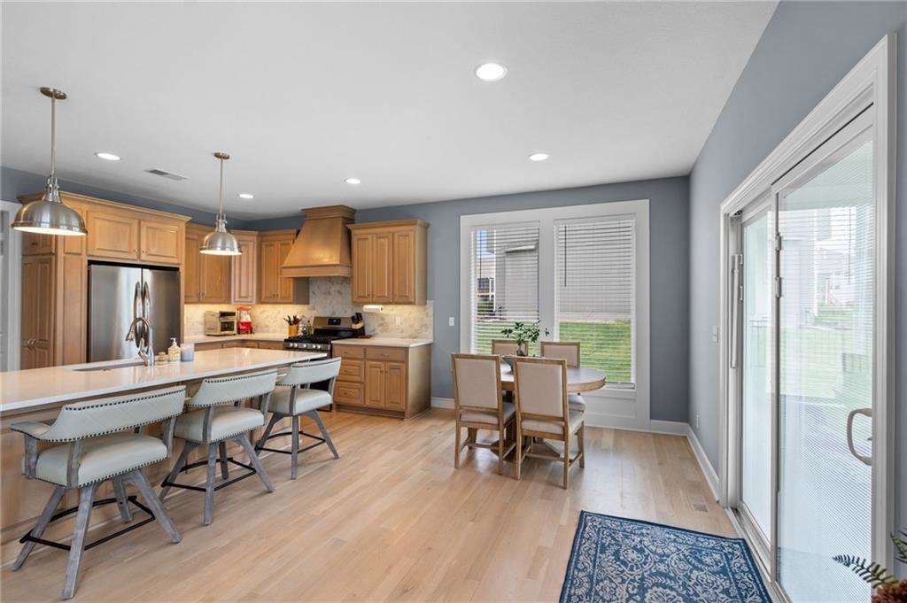 Stunning Ranch/Reverse home that features beautiful wood floors on the main level, open floor plan and kitchen with granite countertops, kitchen island, stainless appliances including a gas cook top that all remain with the home, white cabinets and pantry. Spacious primary suite that provides a wonderful walk in closet with lots of space, adjoining bathroom that features a double vanity, multi-headed shower and tiled floors. Finished basement with large rec room with wet bar and two additional bedrooms. Enjoy your fenced in backyard with a large patio space that is great for entertaining and includes a fire pit. Hurry this one will not last long!!!