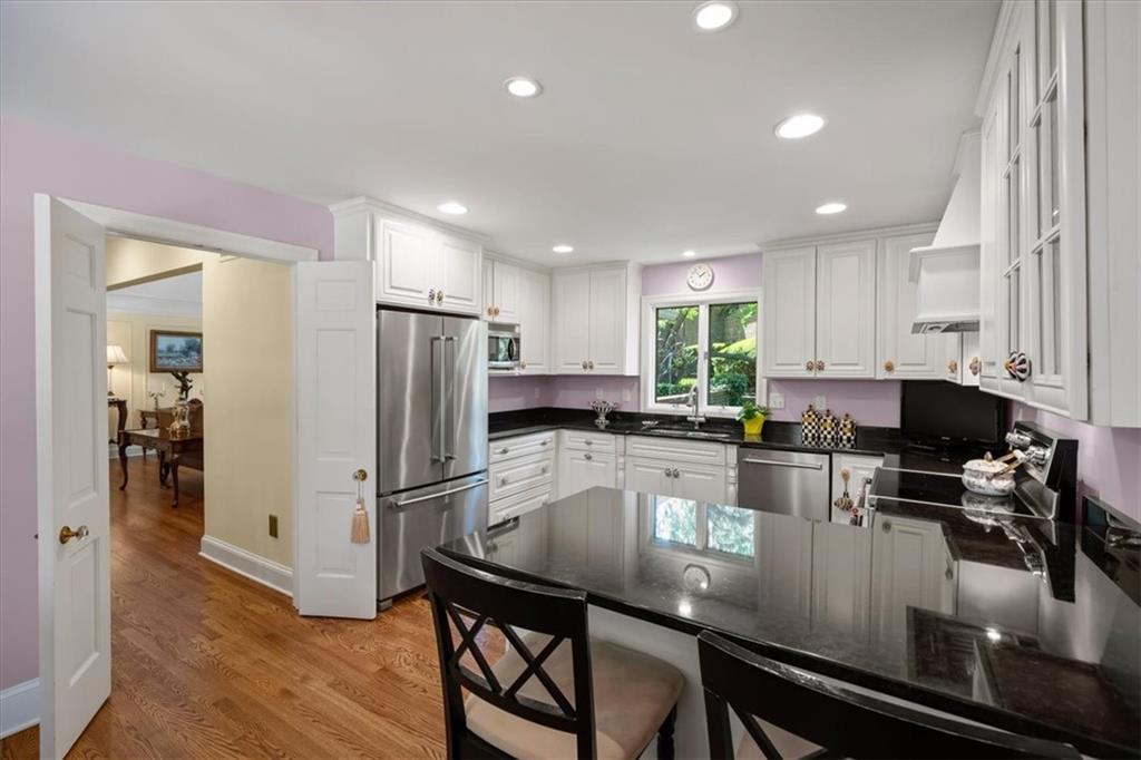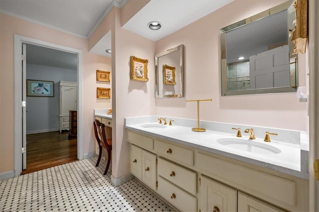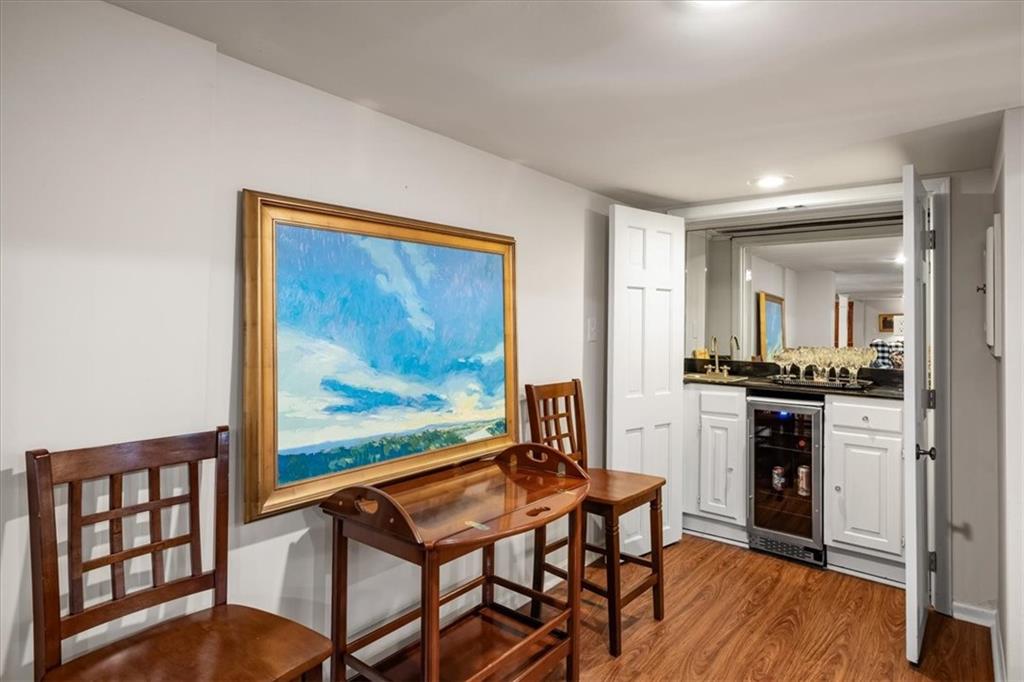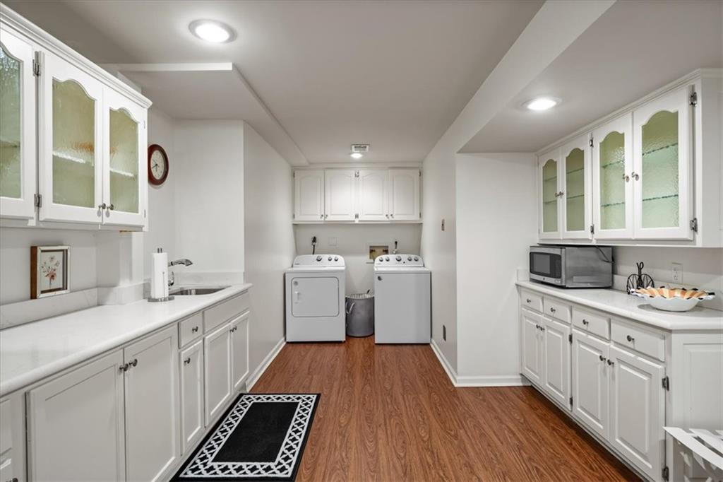 Experience maintenance-provided luxury in this fabulous 1.5-story home located in Corinth Downs. Boasting over 3,200 sqft of refined living space, a brand-new DaVinci roof, and zoned heating and cooling, this 3-bedroom, 3.5-bath home perfectly balances traditional elegance with a spacious, airy floor plan. The main level greets you with a grand foyer and a formal dining room featuring a tray ceiling and classic wainscoting. The soaring, vaulted living room, anchored by a stately fireplace and wet bar, is bathed in natural light, offering a seamless flow for entertaining. The kitchen is a chef's delight, featuring crisp white cabinetry, sleek black granite countertops, new stainless steel appliances, and a charming breakfast nook. Retreat to the main-floor primary suite, complete with a generous walk-in closet and a spa-like ensuite bath finished in exquisite floor-to-ceiling marble, featuring a glass-enclosed shower and a deep soaking tub. Main floor laundry is also available for your convenience. The upper level offers two additional bedrooms and a full bath, perfect for guests, a playroom, or a quiet home office. The expansive lower level significantly increases the home's footprint, offering a large recreation room with a second wet bar and dedicated dining area, an office, and a fourth non-conforming bedroom with a full bath. You will also find a secondary kitchen with an additional laundry room, offering unmatched storage and utility space. Step outside to a private, lushly landscaped brick enclosed patio, ideal for alfresco dining under the shade of mature trees. This home offers the perfect "lock-and-leave" lifestyle without sacrificing the scale and comfort of a traditional home.