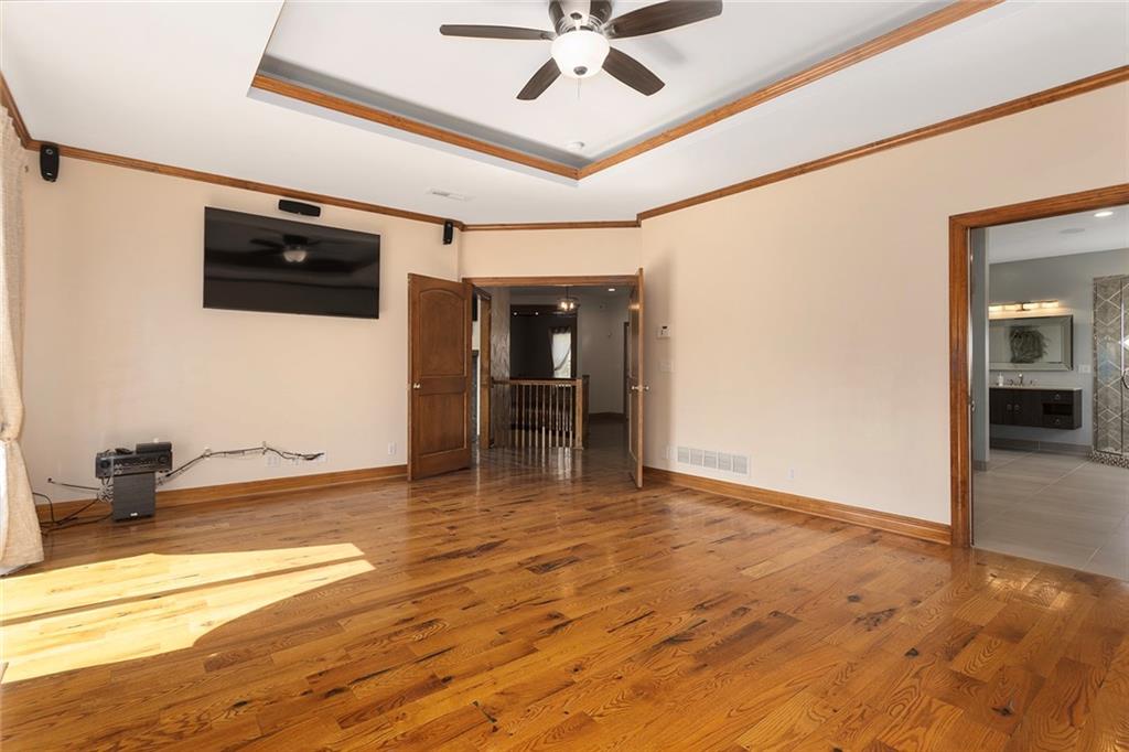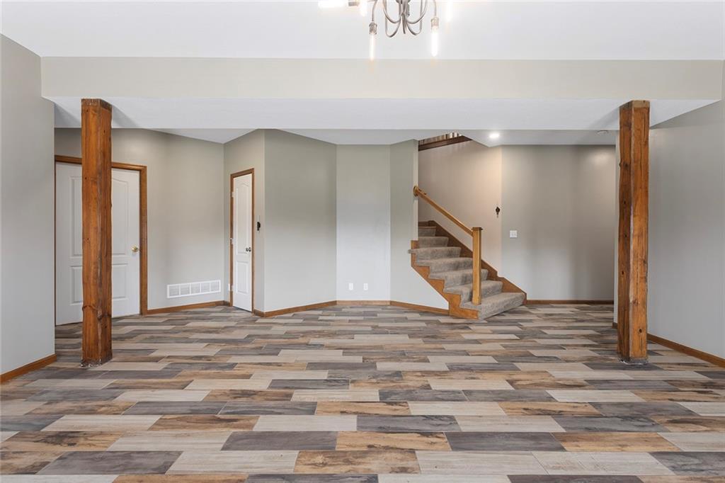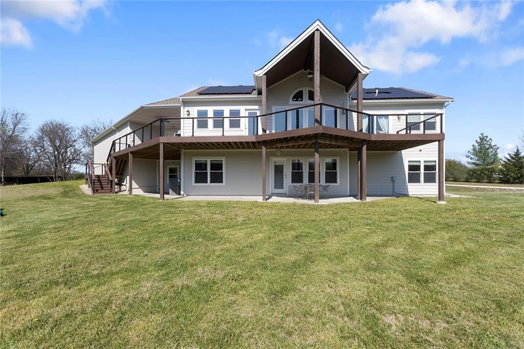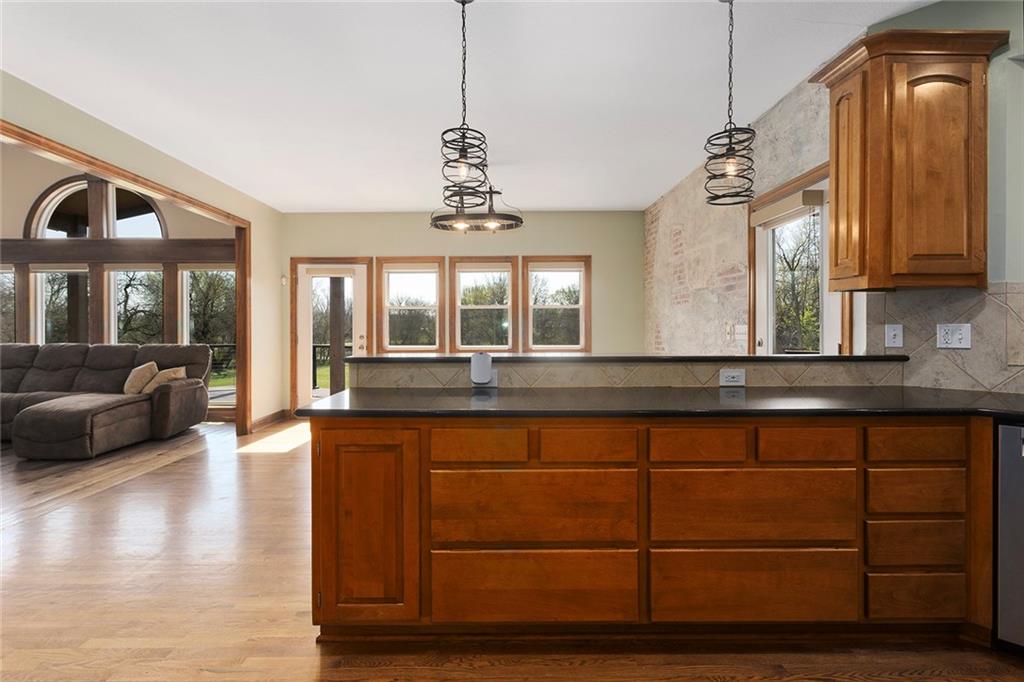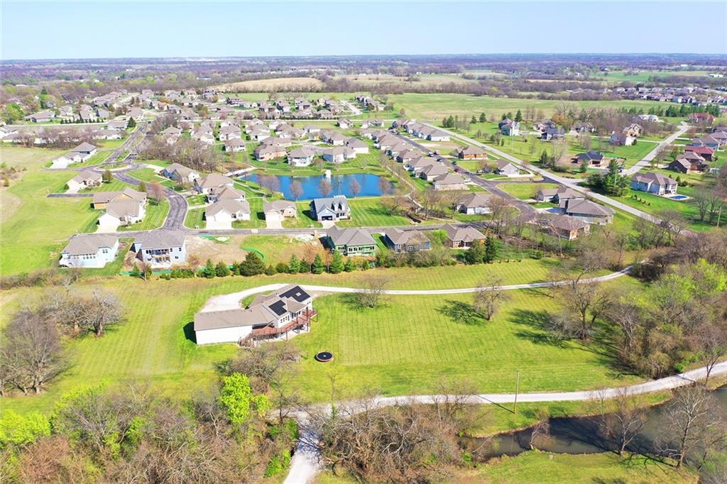 RARE 4-ACRE RETREAT JUST MINUTES FROM KANSAS CITY! Discover the perfect balance of privacy, space, and convenience with this exceptional reverse 1.5-story home tucked away in a picturesque, tree-lined setting. Offering nearly 4 acres of serene landscape, this property delivers a true country-living experience without sacrificing access to top-rated schools, shopping, and city amenities. Designed for both comfort and functionality, this home showcases vaulted ceilings, expansive living spaces, and an abundance of natural light. The main level provides effortless living, while the walkout lower level expands your options with a private 4th bedroom featuring its own exterior entrance—ideal for guests, multi-generational living, or a private office suite. Outdoor living shines with a wraparound deck, perfect for entertaining or simply enjoying the peaceful surroundings under a canopy of mature trees. Car collectors, hobbyists, or those needing extra space will love the oversized 3-car garage with extended bays and doors, plus a rare 4th garage on the lower level—offering unmatched flexibility. Thoughtfully updated throughout, with major improvements in the past 2–3 years including new hardwood floors, custom plank tile, updated lighting and fans, exterior stone accents, upgraded stair finishes, deck enhancements, and a fully finished lower level. Additional updates in progress add even more value. Opportunities like this—with acreage, upgrades, and location—are few and far between. This is the one buyers have been waiting for.