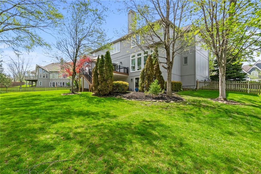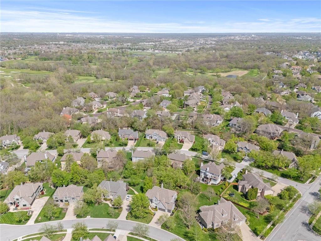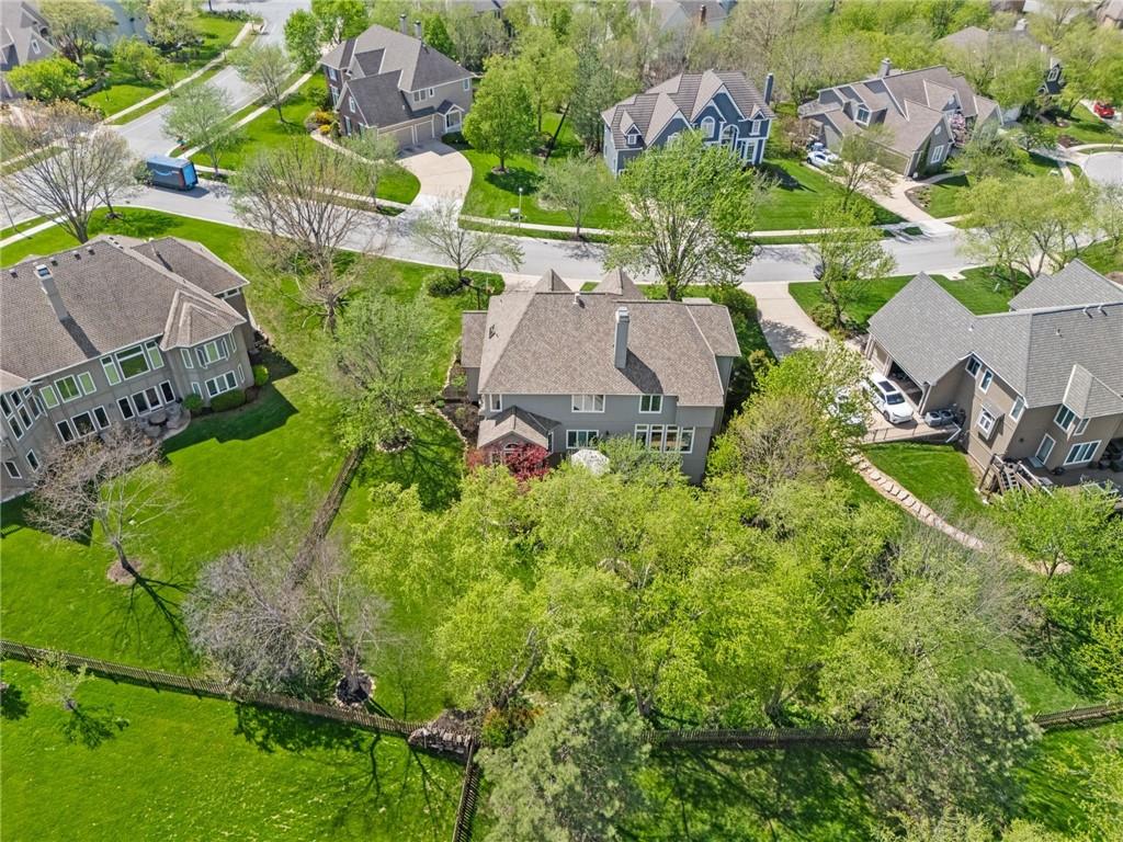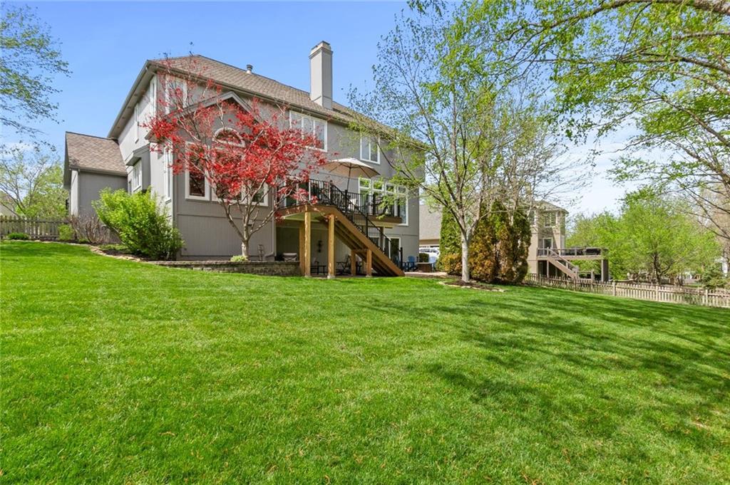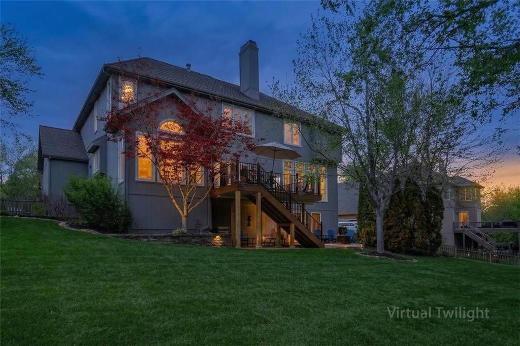 Prestigious neighborhood, quality built Lambie Geer 2 story, with finished walkout lower level, to wood fenced, treed, yard in a cul de sac. New maintenance free deck and new triple pane windows. Double stairs, zoned HVAC. Formal living, formal dining, main floor office. Beautiful powder room. Formal living room has tons of natural light and a charming wet bar. Large kitchen with center island, breakfast room and hearth room with stone fireplace. Granite, Bosch stainless steel appliances. Gorgeous primary bath and large primary with walk in closet. Look close & see the quality, pride, & SPACE!! Award winning Blue Valley schools. AWESOME LOCATION Awesome home in prestigious neighborhood. New Roof coming soon.