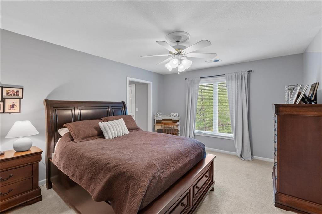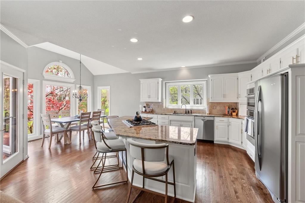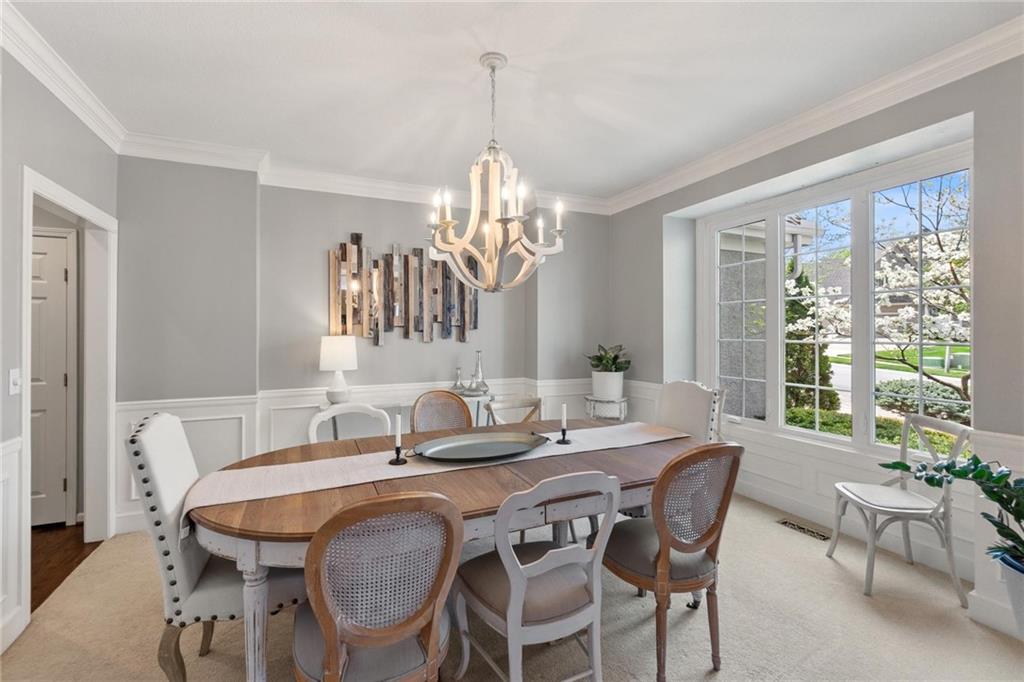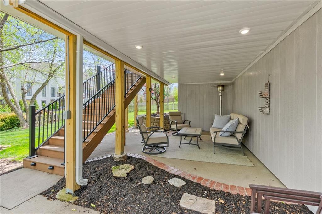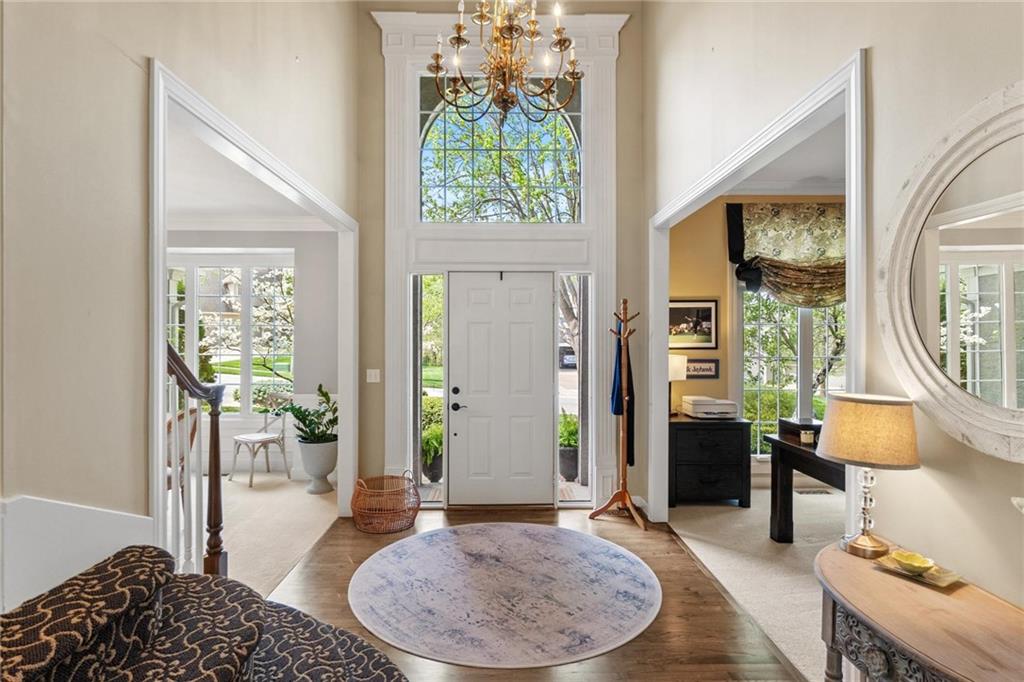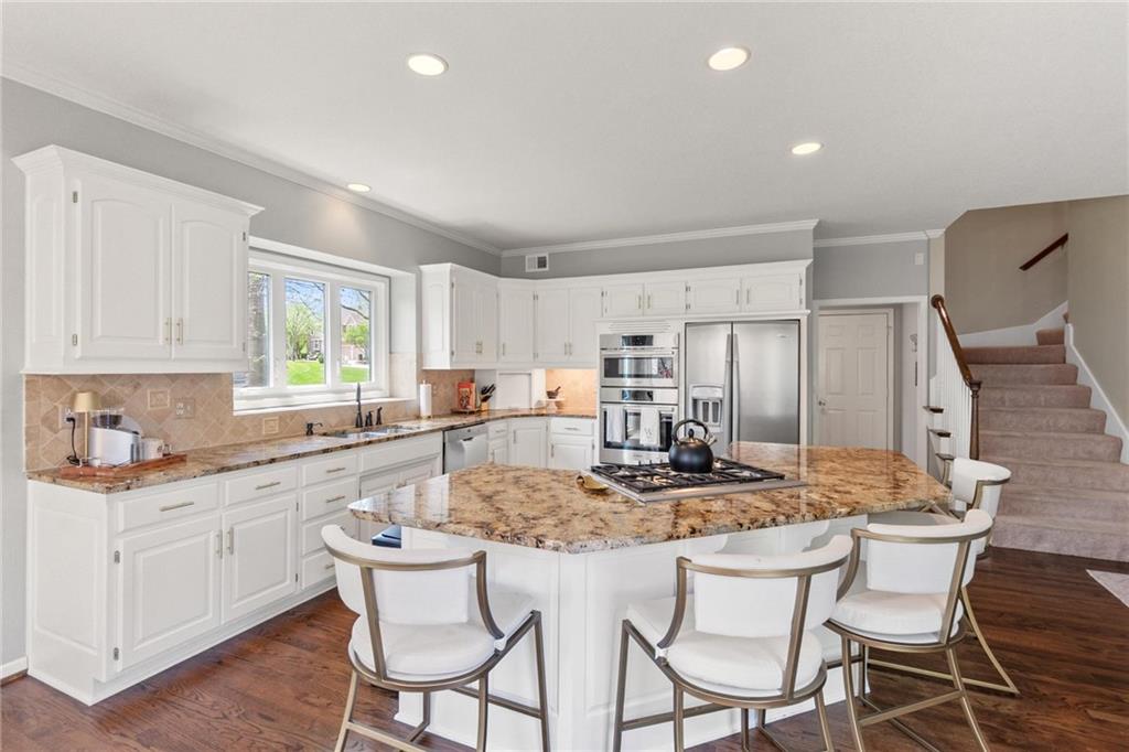 Prestigious neighborhood, quality built Lambie Geer 2 story, with finished walkout lower level, to wood fenced, treed, yard in a cul de sac. New maintenance free deck and new triple pane windows. Double stairs, zoned HVAC. Formal living, formal dining, main floor office. Beautiful powder room. Formal living room has tons of natural light and a charming wet bar. Large kitchen with center island, breakfast room and hearth room with stone fireplace. Granite, Bosch stainless steel appliances. Gorgeous primary bath and large primary with walk in closet. Look close & see the quality, pride, & SPACE!! Award winning Blue Valley schools. AWESOME LOCATION Awesome home in prestigious neighborhood. New Roof coming soon.