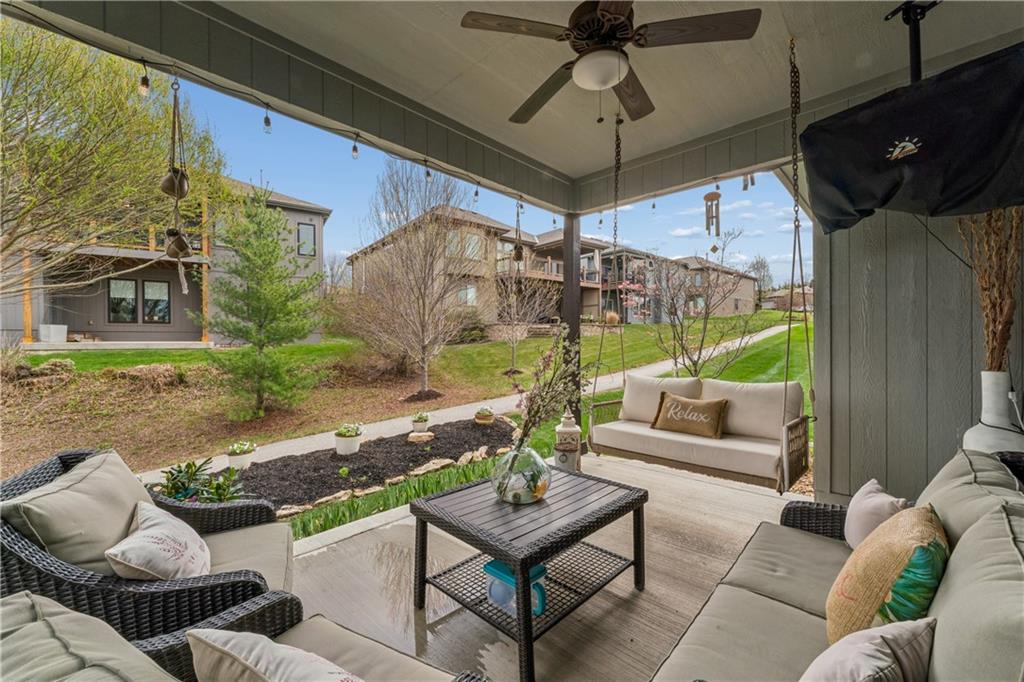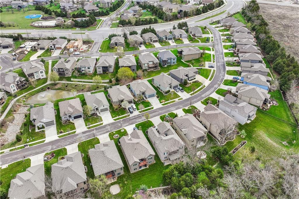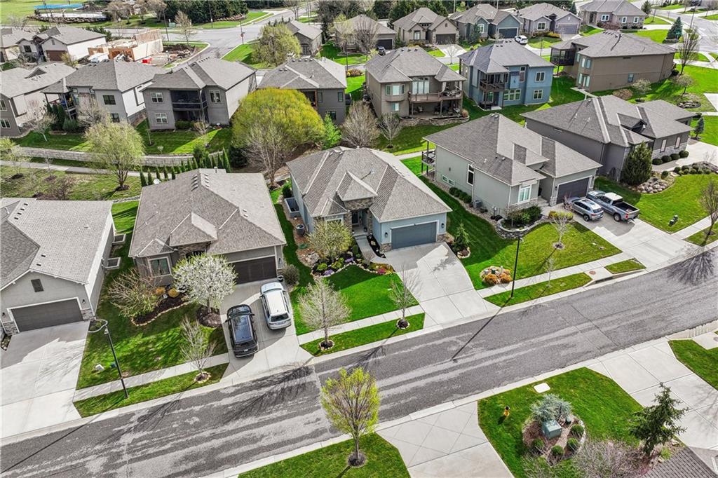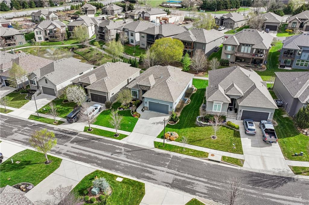 Welcome to this stunning Sorrento model 1.5-story located in the highly sought-after Canyon Ridge subdivision in Lenexa. This "Pauli Homes" beautifully designed 4-bedroom, 3 full bath, 2-car garage home offers a rare combination of architectural character, thoughtful design, and an exceptional setting. A stunning example of modern Craftsman-inspired architecture, offering the perfect balance of warmth, character, and contemporary design. Perfectly positioned on a daylight lot with some green space and a peaceful pond view. This home provides both privacy and picturesque surroundings. Built in 2016, this home stands apart with a timeless sense of style and warmth that is often missing in today’s newer construction—offering a more inviting, refined feel with custom finishes and distinctive design elements throughout. The open-concept main level is filled with natural light and features a main-floor primary suite for everyday convenience. Unique architectural details create lasting impressions, including a gorgeous circular ceiling light display and a beautifully crafted custom curved bar in the finished lower level, perfect for entertaining. The daylight basement expands your living space and includes two additional spacious bedrooms, a full bath, and generous room for gatherings, recreation, or guests—all with a bright, open feel. The unfinished basement space is already outfitted with a fully equipped home gym, offering an example setup for health-conscious buyers who value convenience and consistency in their fitness routine. This home truly showcases a level of character, craftsmanship, and individuality that sets it apart, offering a more classic, comfortable, and elevated feel compared to many newer builds. Ideally located near shopping, dining, and major highways, this exceptional home blends location, lifestyle, and timeless design into one remarkable opportunity.