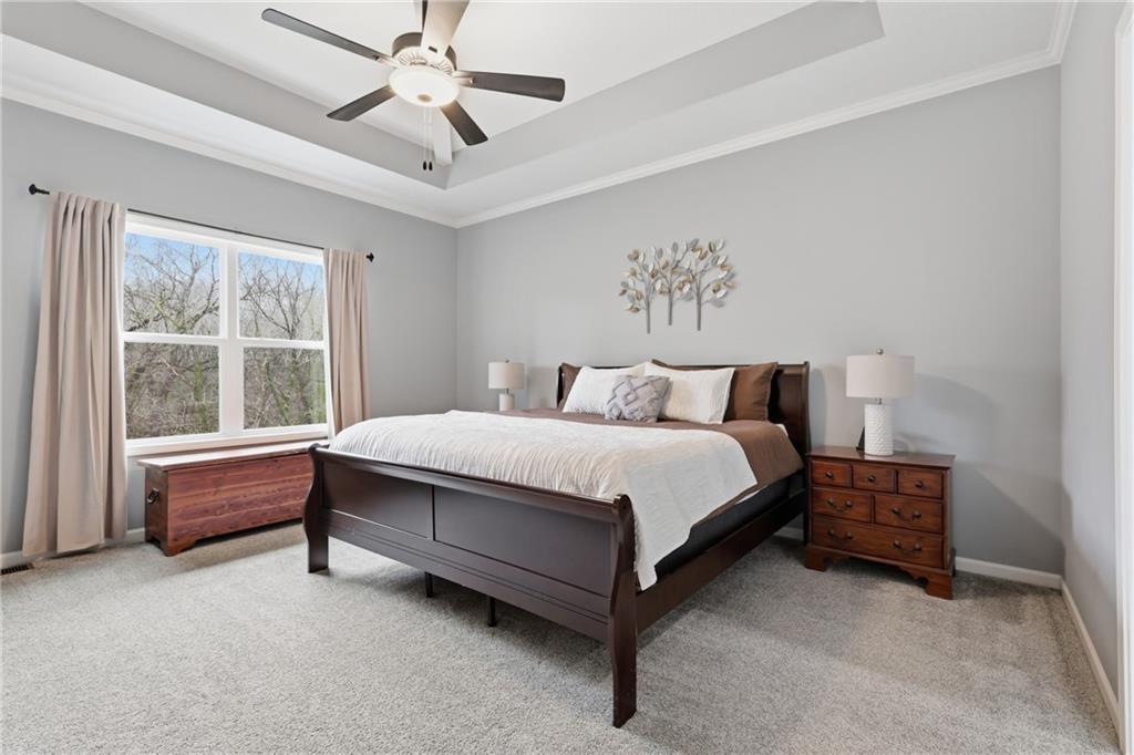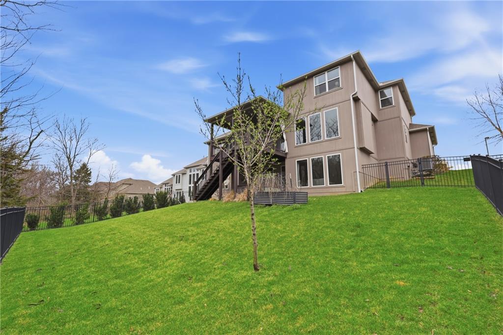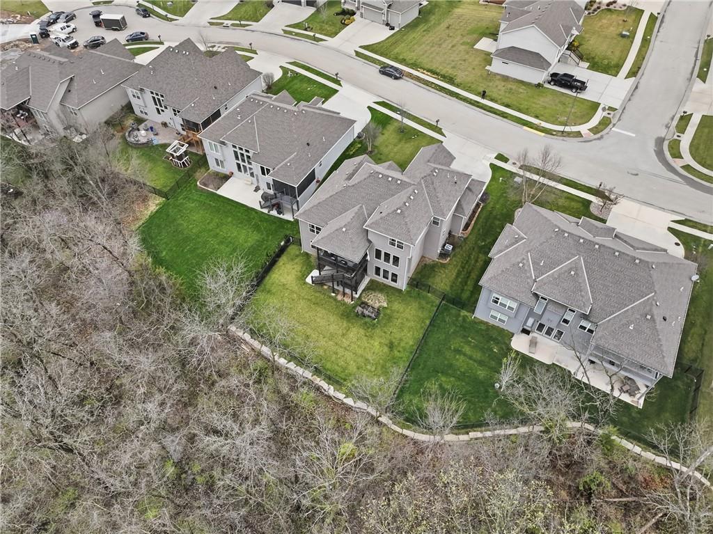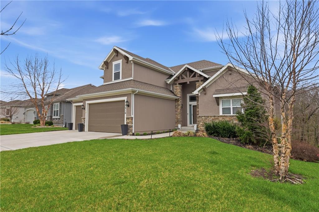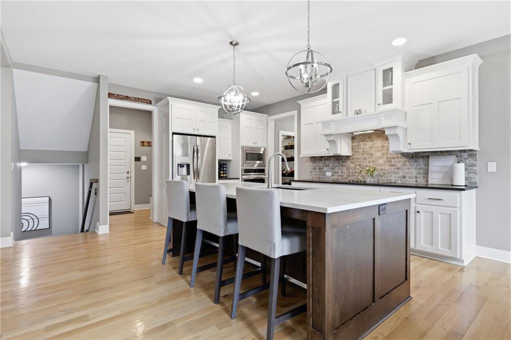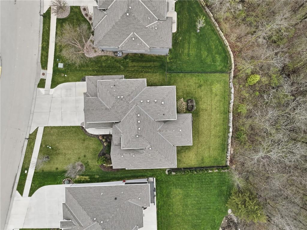 RARE 1.5 story, 5 br, 4 1/2 bath home in Chapel Ridge! Walk into soaring ceilings and windows with beautiful wooded views, light oak hardwood flooring, upgraded lighting, large stained island, upgraded vented hood, quartz and honed granite countertops, see-through gas fireplace from living to large outdoor covered deck, large pantry with pocket desk, large dining/eat-in kitchen. Primary suite with double vanity with tower storage, upgraded shower, and huge closet with conveniently attached laundry room. Upstairs has 3 large bedrooms all with walk-in closets, guest room with ensuite bath, and jack and jill bathroom with separate vanities. Beautifully finished walkout basement with huge rec room, 5th bedroom, full bathroom, wet bar with live edge wood/beverage fridge, ample unfinished storage, and under deck patio. Pristine 3 car garage, upgraded landscaping/retaining walls, metal fence. Come make it your dream home in highly sought after Chapel Ridge and Park Hill schools!