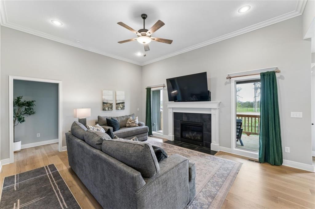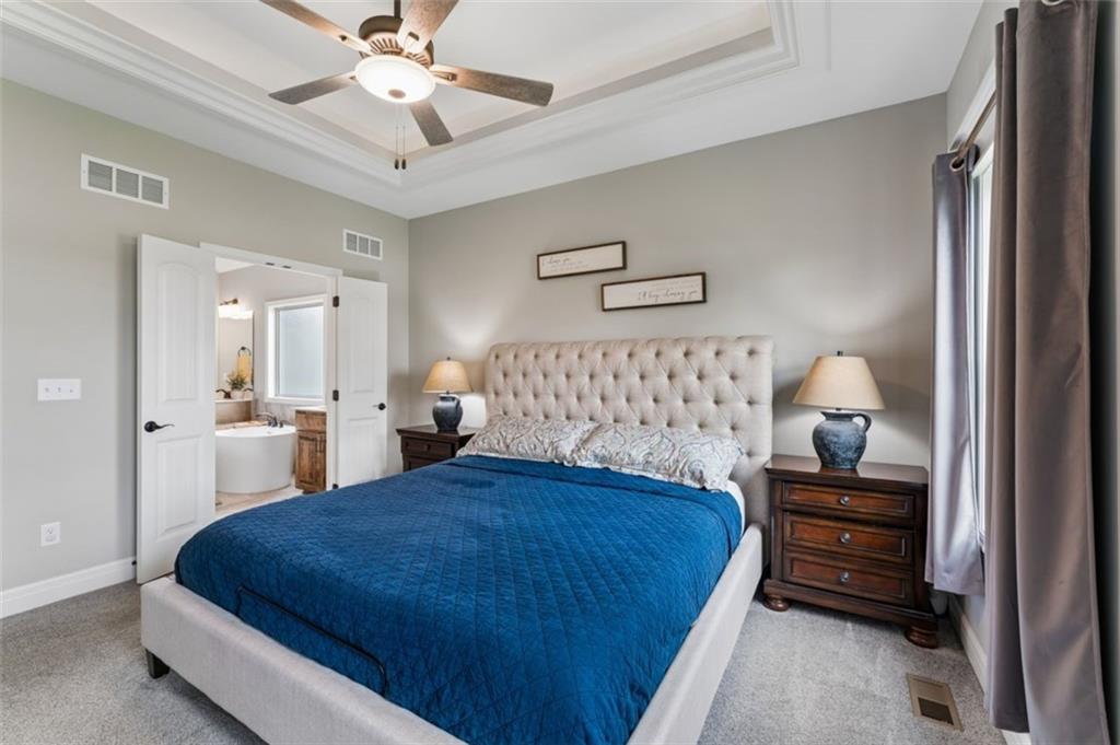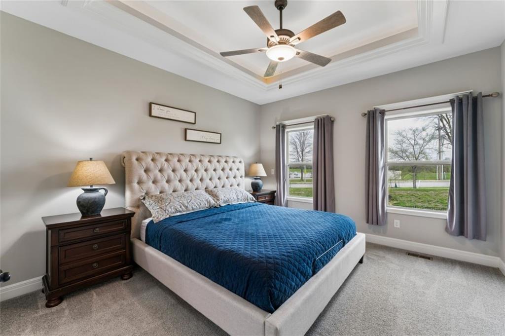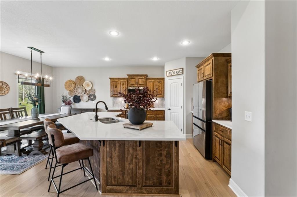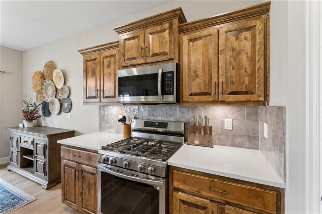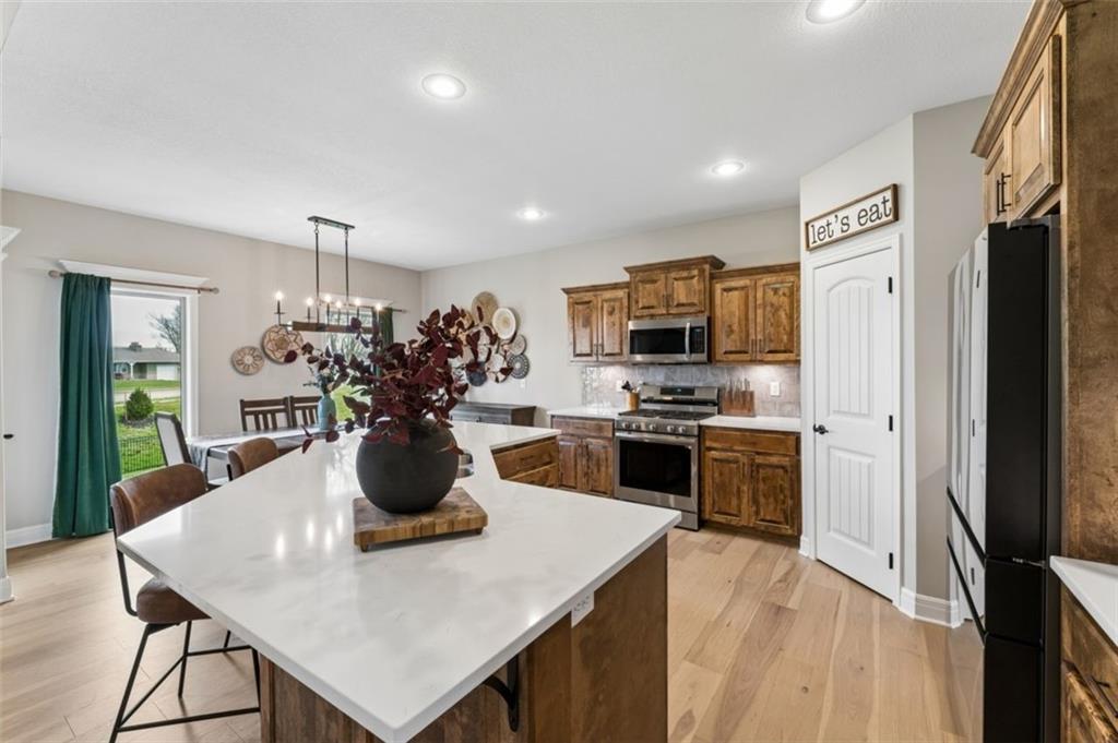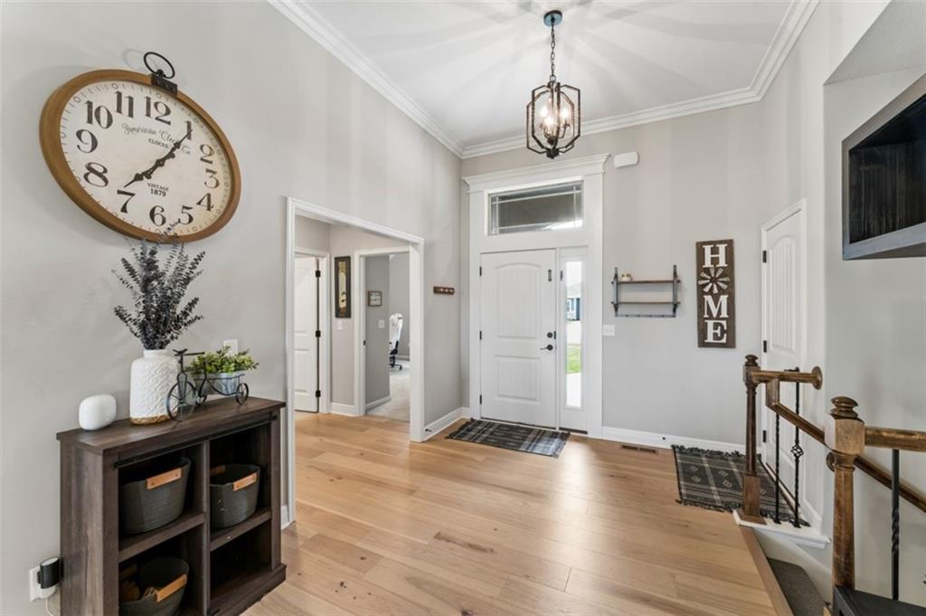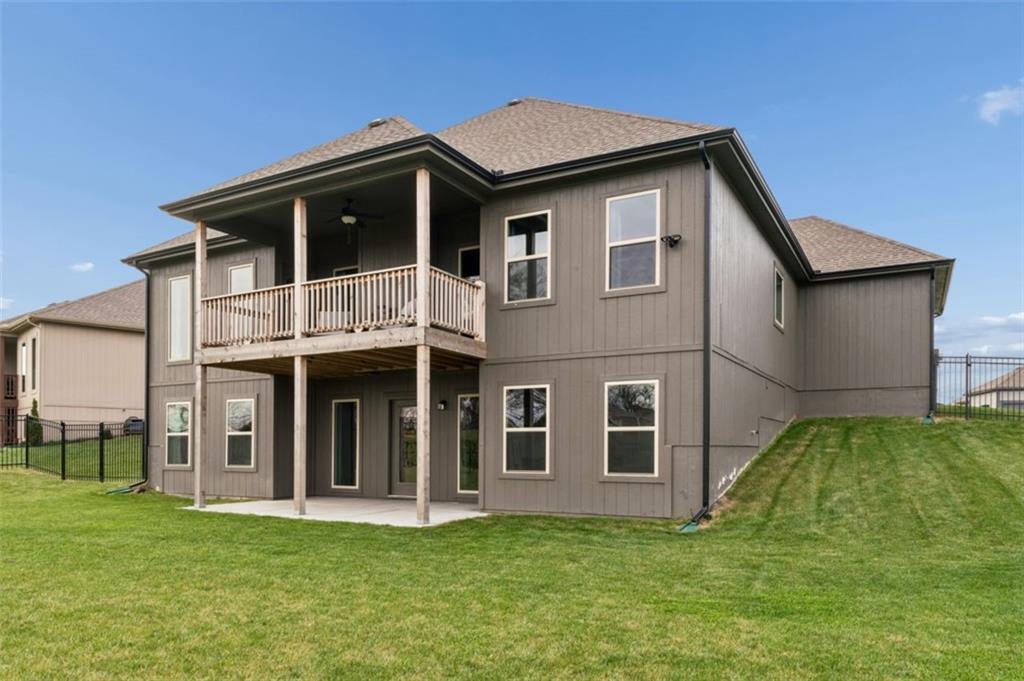 Welcome to "The Fairway" by Hoffmann Custom Homes, nestled in the highly desirable Waterford subdivision! Built in 2024, this beautifully designed reverse ranch offers 4 bedrooms and 3 full baths with comfortable, modern living. Step inside to an open main floor with soaring vaulted ceilings, a warm and inviting great room with a zero clearance gas fireplace, and a stylish kitchen featuring a spacious island, pantry, stained cabinetry, and stainless steel appliances, perfect for both everyday living and entertaining. The main level primary suite provides a relaxing retreat with a walk in closet, and you will appreciate the convenience of main floor laundry. Downstairs, the finished walk out basement offers additional living space along with a wet bar, making it ideal for hosting or unwinding. Enjoy peaceful outdoor moments on the covered deck or patio, and take advantage of the 3 car garage and in ground sprinkler system for added ease. Located in the North Kansas City School District and part of a community with a pool included in the HOA, this home truly has it all. Come see what makes this one so special!