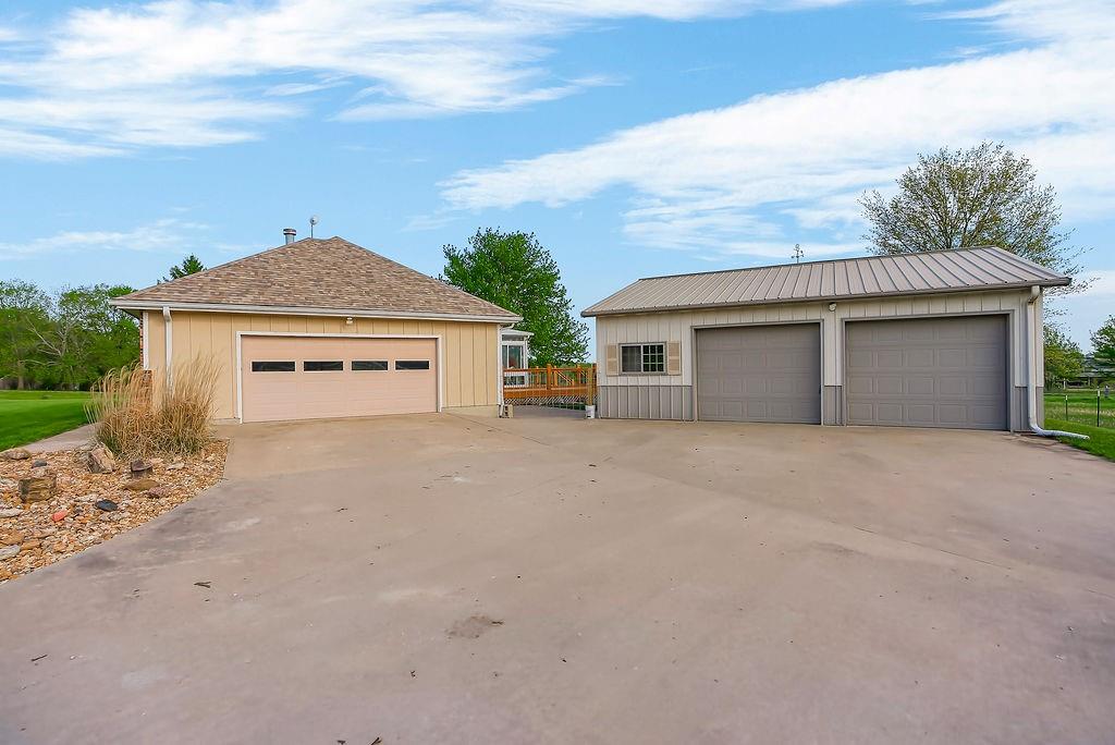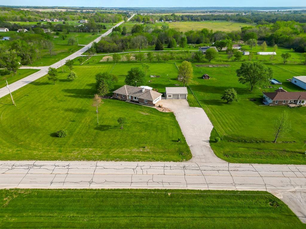 South on 169 Hwy to 255 Street Exit, west on 255th through Hillsdale and over Hillsdale Lake dam. Turn west on 271st, home is at the corner of 271st & Weaverly RD.