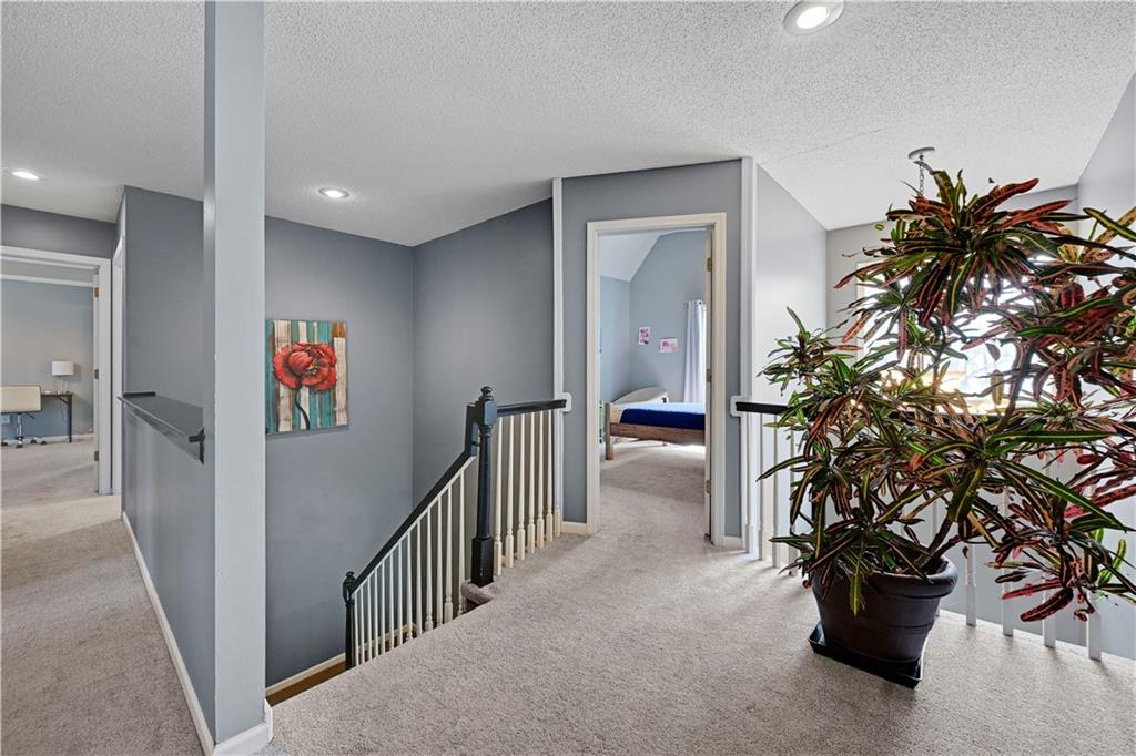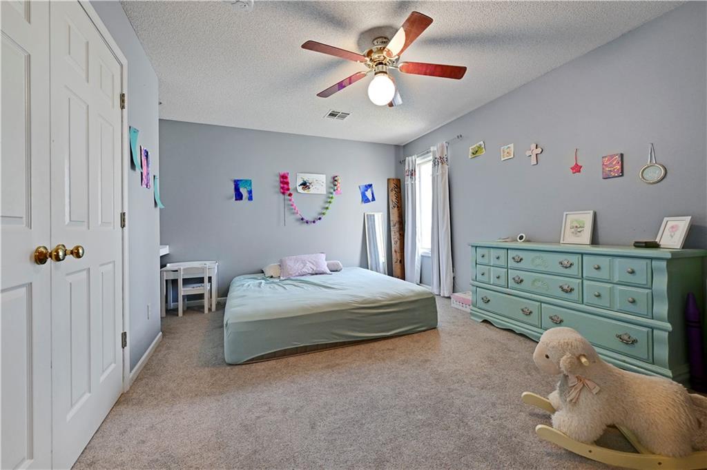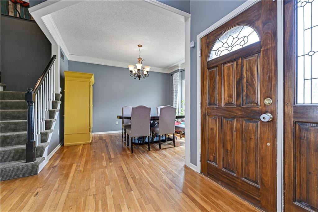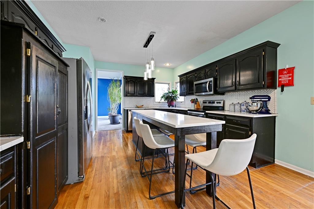 This spacious 4 bedroom, 3.1 bath home in Lenexa is ready for its next owner! Upon entry, you are welcomed by hardwood floors, a formal dining room, and a striking staircase that sets the tone for the space throughout. Just off the entry, the large front living room offers soaring ceilings, abundant natural light, and a beautiful fireplace with dramatic molding detail. Head into the kitchen and hearth room, where you will find painted cabinetry, quartz countertops, updated backsplash, stainless steel appliances, a large island with seating, and a second fireplace that creates a warm and inviting gathering space. The main level also features a half bath and easy access to the covered patio and backyard. Upstairs, the home offers generous bedroom space, including a spacious primary suite and well-sized secondary bedrooms. Head to the finished lower level for even more room to spread out, complete with a large rec room, kitchenette/bar area, full bath, and flexible space for movies, games, workouts, guests, or hobbies. Enjoy the outdoors from the covered paver patio overlooking the fenced backyard with mature trees and plenty of room to relax or entertain. Other features you will love include the distinctive front elevation, multiple living areas, hardwood floors through much of the main level, and a layout that offers both everyday comfort and great entertaining space.