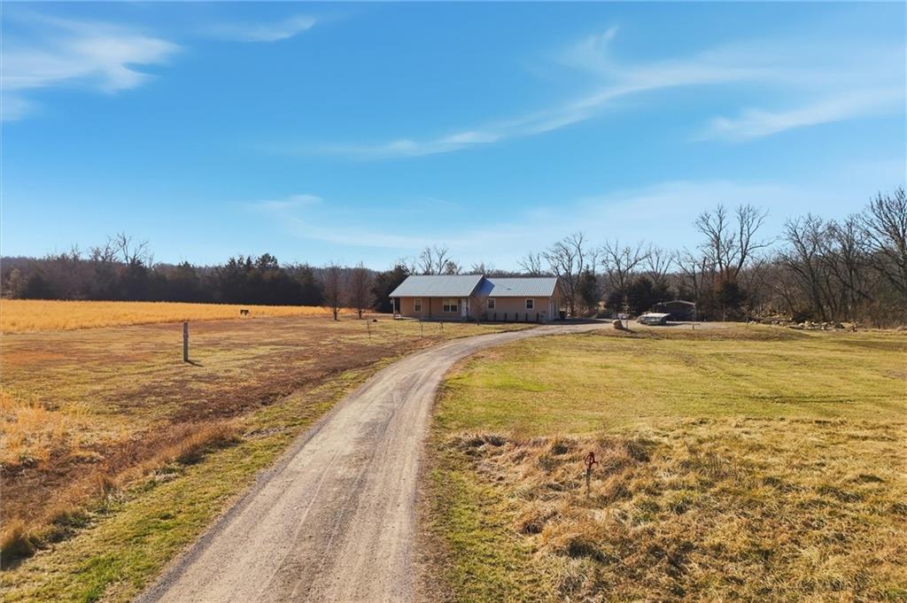 Welcome to tranquil country living on approximately 7± acres. Tucked toward the rear of the property, this spacious ranch-style home offers exceptional privacy and peaceful surroundings, accessed by a long private driveway. Boasting 2,400 square feet of well-planned living space, this 3-bedroom, 2-bath residence blends comfort, functionality, and quality craftsmanship throughout. Inside, you’ll find custom-built cabinetry and detailed baseboards that add warmth and character. The main level includes two generously sized bedrooms, a full bath, and a conveniently located laundry area designed for everyday ease. The finished basement extends the living space with an additional bedroom, full bath, and a large family room—ideal for entertaining, accommodating guests, or creating a cozy retreat. It also features a spacious storm shelter and a second laundry hookup for added convenience and flexibility. Constructed with durable metal siding and a metal roof, this home is built for longevity and low-maintenance living. The oversized, insulated attached garage offers an impressive 1,200 square feet—perfect for multiple vehicles, a workshop, hobbies, or additional storage. Enjoy relaxing on the covered front porch overlooking the expansive yard, or unwind on the composite back deck with scenic views of a mature tree line. Near the back of the property, a pond has already been excavated and is ready to be filled, providing a unique opportunity to create your own private water feature. Whether you’re looking for space to spread out, room to grow, or a peaceful place to call home, this remarkable property offers the perfect balance of privacy, comfort, and potential.