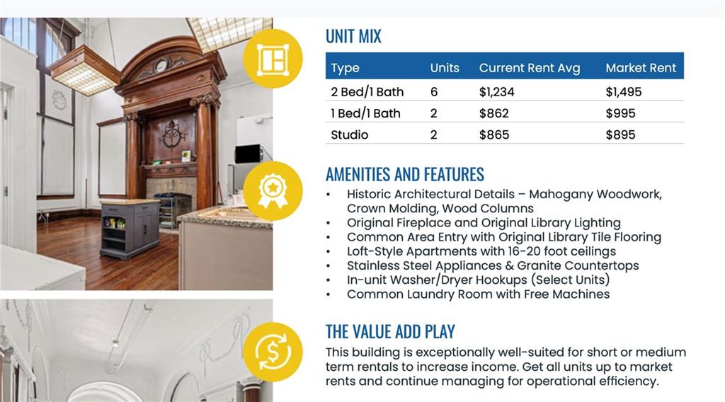 Carnegie Lofts presents a once in a lifetime opportunity to acquire a historic Carnegie Library converted to ten of the most incredible multifamily units in Leavenworth, Kansas. After Andrew Carnegie became the richest man in the world in 1901, he devoted his life to philanthropy including funding the construction of 1,689 libraries across the United States. Originally constructed in 1902, the building was thoughtfully converted into loft-style apartments in 2017 while preserving its architectural character, including original woodwork, mosaic tile flooring, and restored lighting fixtures. One of the units features the original ornate fireplace and all units have restored original windows, ample natural light, and blend modern amenities with timeless character. Interiors feature soaring ceilings (16–20 feet), creating a unique and rare living experience with strong tenant demand. Laundry is either in unit (4 units with hookups) or in a shared common laundry on the main floor. The all electric building is located in the thriving Leavenworth market and combines historic charm with rental appeal and income upside. Information deemed reliable but not guaranteed. No seller or creative financing, please do not ask.