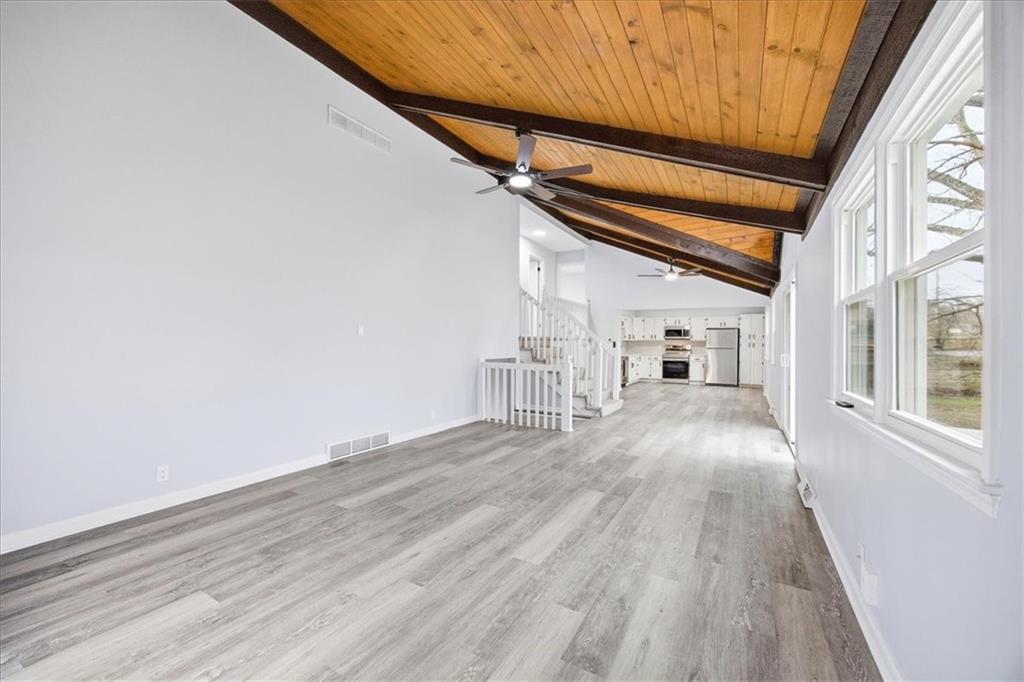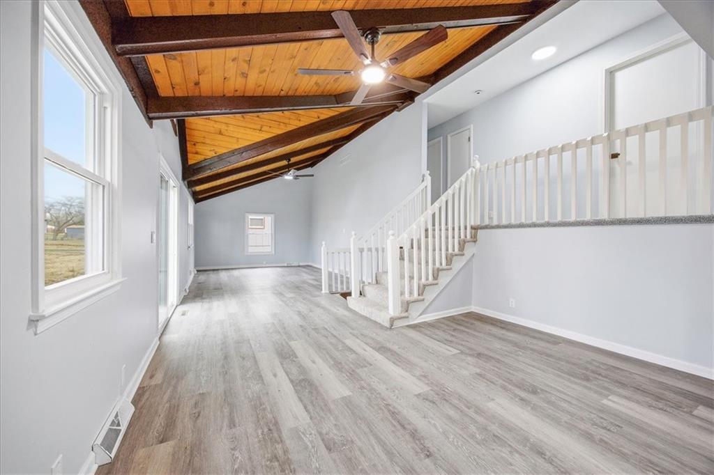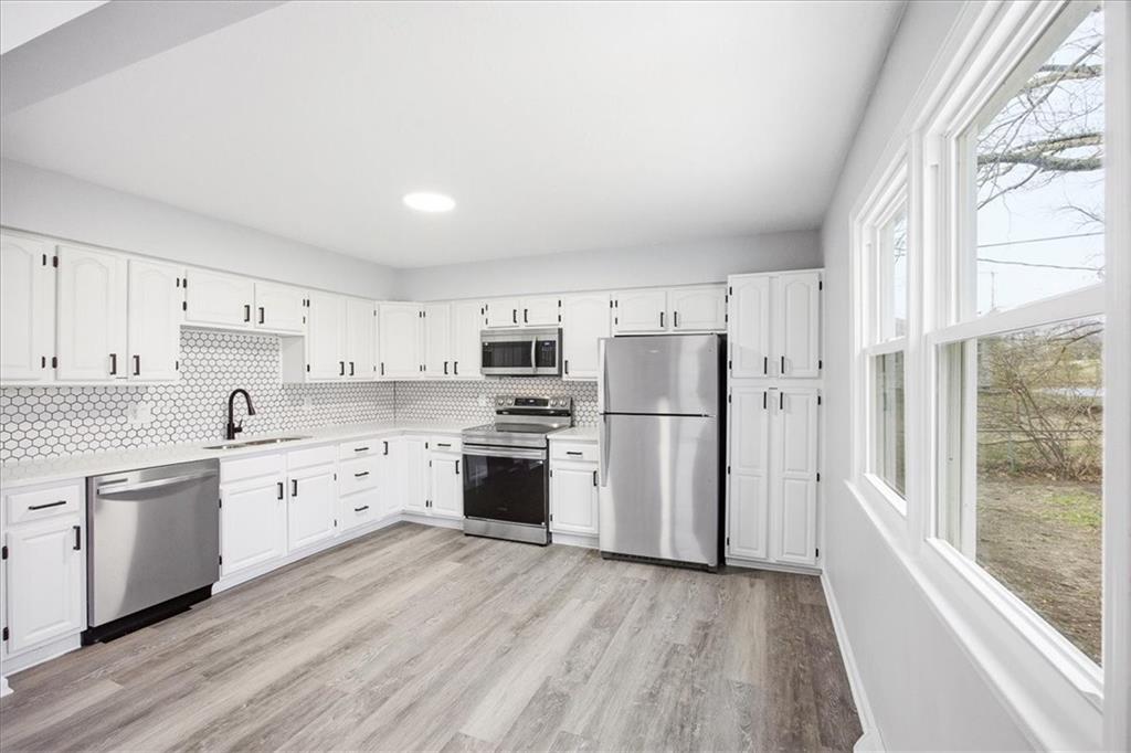 Welcome home to 13012 Bristol Ave — where timeless character meets modern, move-in ready living. Step inside this beautifully refreshed 4-bedroom, 2.5-bath home in Grandview and prepare to be impressed. This home offers the space, style, and quality updates— without any of the work. The moment you walk through the front door, soaring vaulted ceilings with stunning exposed wood beams set the tone, an architectural feature that instantly makes this home stand out from the crowd. The expansive open-concept living and dining area flows seamlessly to a fully updated kitchen featuring crisp white cabinetry, tile backsplash, quartz countertops, and a full suite of brand new stainless steel appliances. Whether you're cooking for one or hosting a crowd, this kitchen delivers. A dramatic floor-to-ceiling brick wood-burning fireplace anchors the lower-level flex room. New luxury vinyl plank flooring, fresh carpet, and a neutral paint palette throughout give every room a clean, contemporary feel. The flexible floor plan includes 4 bedrooms — one of which makes an ideal home office, playroom, or flex space and 2.5 updated bathrooms, with quartz countertops and matte black hardware. Every detail has been thoughtfully refreshed. Additional highlights include newer windows and exterior doors for improved energy efficiency, a freshly painted exterior, an attached 2-car garage, and a spacious lot with room to create your own outdoor oasis. Located in Grandview, MO - just minutes from highways, shopping, dining, and employment centers throughout the Kansas City metro this home delivers exceptional value in a convenient location. All the updates are done. All you need to do is move in. Come see it before it's gone!