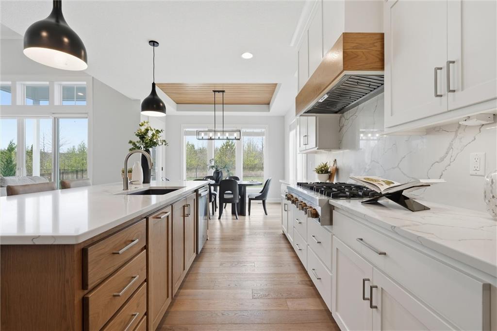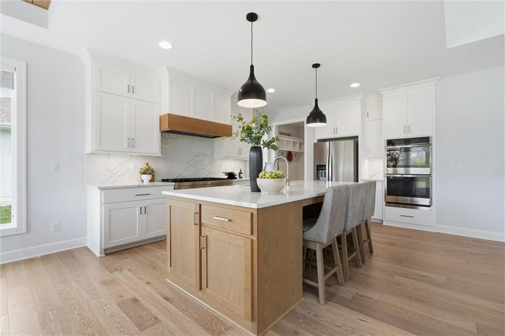 Meticulously maintained, like-new home that outshines new construction, offering a thoughtful open floor plan and seamless indoor-outdoor flow on a premium lot with a large private backyard and wooded views. The main level features a grand two-story entry, spacious living room, private office, and a gourmet kitchen with floor-to-ceiling white oak cabinetry and upgraded gas range. The main-level primary suite offers a spacious layout with convenient access to the laundry room. The upper level includes three generously sized bedrooms, each with walk-in closets and en suite baths. The finished lower level features a guest bedroom, full bath, wet bar, flex room/home gym, and ample storage. Enjoy abundant natural light throughout, along with beautiful sunset views from the backyard overlooking wooded green space. Move-in ready with convenient access to major commuting routes and located within the highly rated Blue Valley School District. Motivated sellers—come see this beautiful home and make an offer!