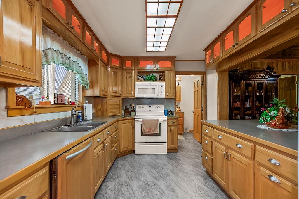 Situated on 1.6 acres, this beautifully maintained property is packed with upgrades and features an incredible shop loaded with all the bells and whistles. Pride of ownership shines throughout, with numerous updates including newer windows, roof, HVAC, furnace, water heater, and more. The 40x50 shop is a true standout—perfect for a business, hobby, or storage. Featuring three garage doors, full insulation, concrete floors, radiant floor heating, and a separate finished area, it offers endless possibilities. With excellent highway visibility, this space is ideal for anyone looking to run a business right from home. The home itself offers 3 bedrooms and 2 baths in excellent condition, highlighted by a fully remodeled kitchen that truly steals the show—stylish, functional, and ready to impress. Beautiful wood cabinetry, trim, and solid wood doors throughout add warmth, character, and a high-end feel. With expansive living space, exceptional updates, and a versatile shop with prime visibility, this property blends comfort, functionality, and opportunity in one must-see package.