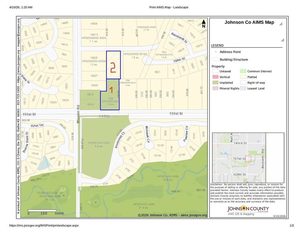 Rare Opportunity: 2.3+ Acre Estate Lot with No HOA Restrictions. Escape the rules of an HOA and build the home you want, with a builder you choose. This is a rare chance to own two estate-sized lots (sold together) totaling 2.32 acres of pure potential. Whether you envision a sprawling private manor or a multi-generational family compound with two custom homes, or you can also build your estate-sized home and sell the other lot, the choice is entirely yours. Unlike neighboring subdivisions where lots are selling for more and come with thick rulebooks, these lots have NO HOA. Forget the overnight parking bans, restrictions on boats or RVs, limited builder lists, and rules on when you can swim at the pool in a subdivision with an HOA. Bring your favorite architect and builder to create a lifestyle that fits your needs—not a committee’s. Situated east of Mission Road and 151st Street, you will find multi-million dollar estates and world-class amenities blocks away. The Views: The first lot features a gradual elevation perfect for a secluded homesite with sweeping views; the second lot sits way back off the road and is flat and very secluded. Across the street from our lot is a nationally ranked 18-hole public golf course. Go North to 147th and Mission Road and you will find a 115 acre Park with an Amplitheater, a lake, a playground, a shelter house, a lodge that can accommodate 300 people for dinner or up to 500 people for meetings, and that includes audio visual amenities and a full commercial kitchen, four rental cabins available to individuals or organized groups, 2 miles of hiking or biking trails, and a challenge course with climbing walls and so much more. The bottom line is you CAN build exactly what you want, where you want, and WHEN you want to build. Build this year, next year, or whenever. No HOA. No limits. No HOA committees. You earned it, so now live it.