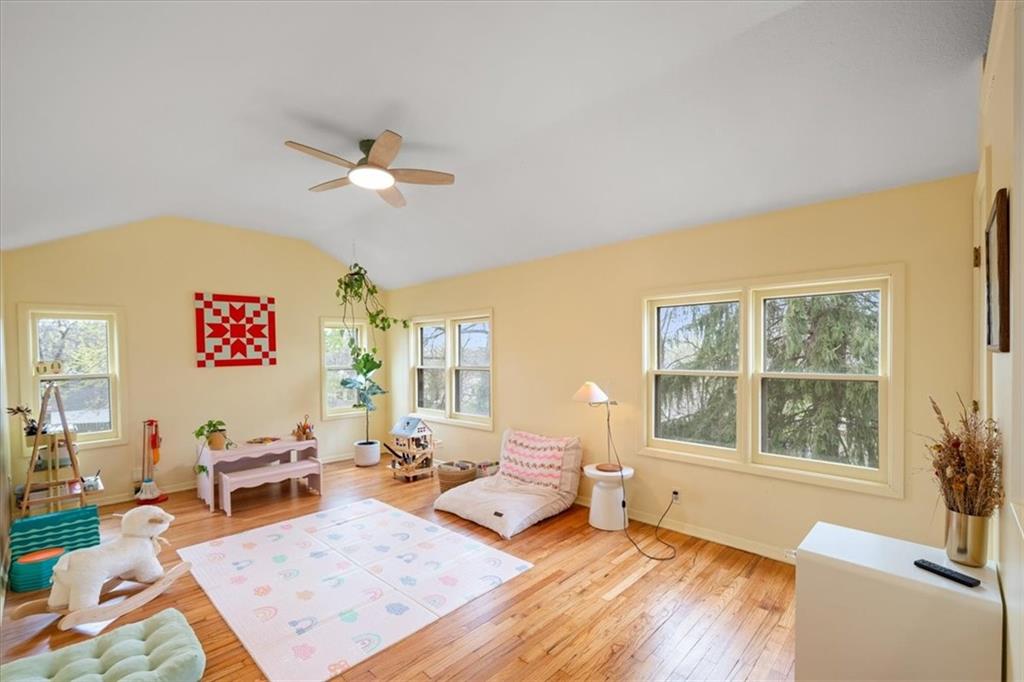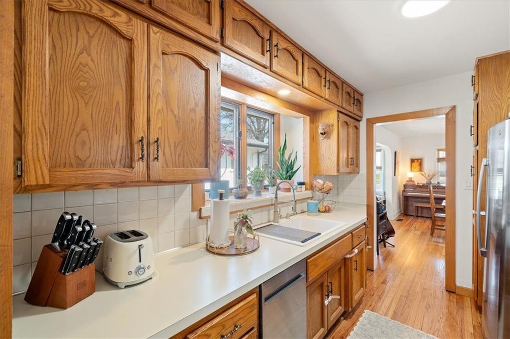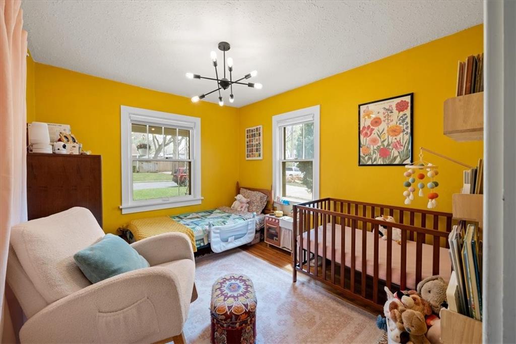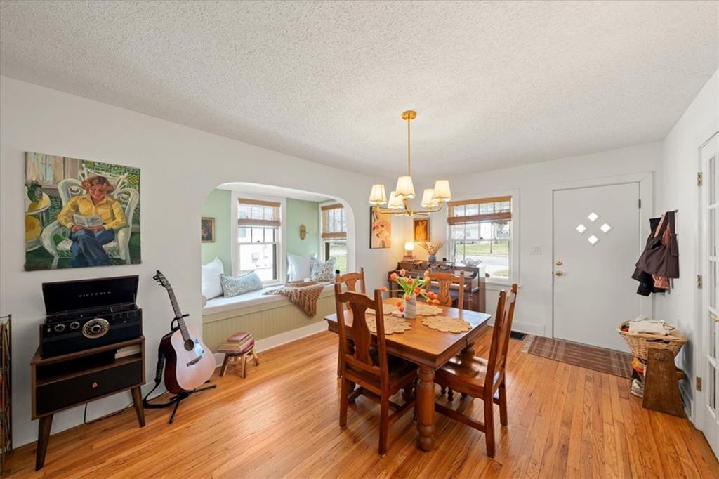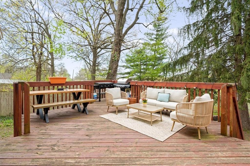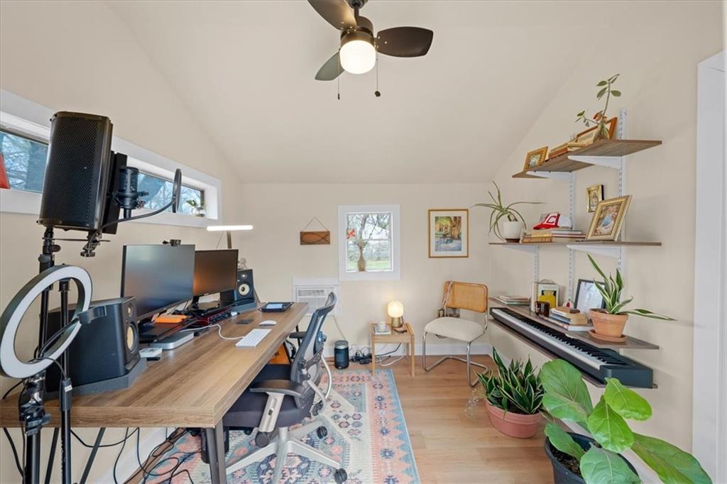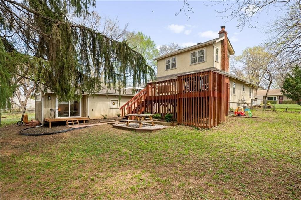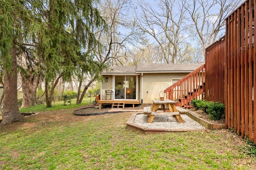 Tucked into a quiet Overland Park street, this beautifully styled bungalow blends original character with thoughtful updates and everyday livability, all just minutes from downtown Overland Park’s shops, restaurants, and the brand-new farmers market opening this summer. The inviting front porch sets the tone, while inside hardwood floors and natural light carry throughout the main living areas. The dining room flows into a comfortable living space with exposed beams, fireplace, and a built-in window seat that adds both charm and function. The kitchen offers solid wood cabinetry, updated appliances, and a practical layout with room to personalize over time. The home features three bedrooms, including two on the main level and a spacious upper-level retreat. One main-level bedroom sits behind glass French doors, offering flexibility to use as a bedroom, office, or additional living space. Major mechanical updates include a newer furnace and water heater. Out back is where this property truly stands out. A large elevated deck overlooks a deep, tree-lined yard with multiple areas for entertaining, relaxing, and enjoying the peaceful setting. A finished and insulated studio just off the garage creates an ideal space for a home office or creative workspace. Full unfinished basement provides excellent storage and hobbies space. Located in the highly regarded Shawnee Mission school district with quick access to parks, shopping, dining, and major highways, this home offers a rare combination of character, flexibility, and location. Homes with this level of outdoor space and functional flexibility rarely come available at this price point. You'll have to act fast!