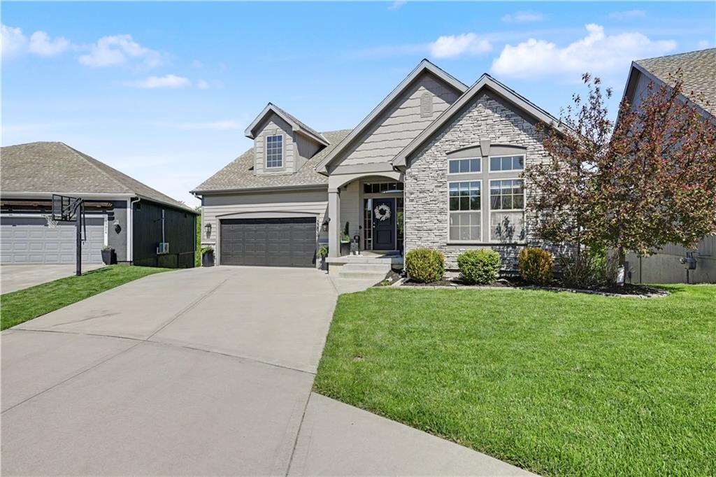 GORGEOUS reverse 1.5 story home on an amazing Cul De Sac in the heavily sought after Arbor Woods in Olathe with wonderful curb appeal! Beautiful gourmet kitchen with huge eat in granite island, with walk in pantry, hardwood floors, and stainless steel appliances. Lovely deck off conveniently located off kitchen - overlooking the beautiful treed view- great for grilling and entertaining! Spacious Master BR with ensuite with vaulted ceiling, carpet, shower, double vanities with granite tops, walk through closet, laundry and another bedroom/office all on main floor. Lower level has HUGE family room with wet bar, with third large bedroom with full bath, and large storage.