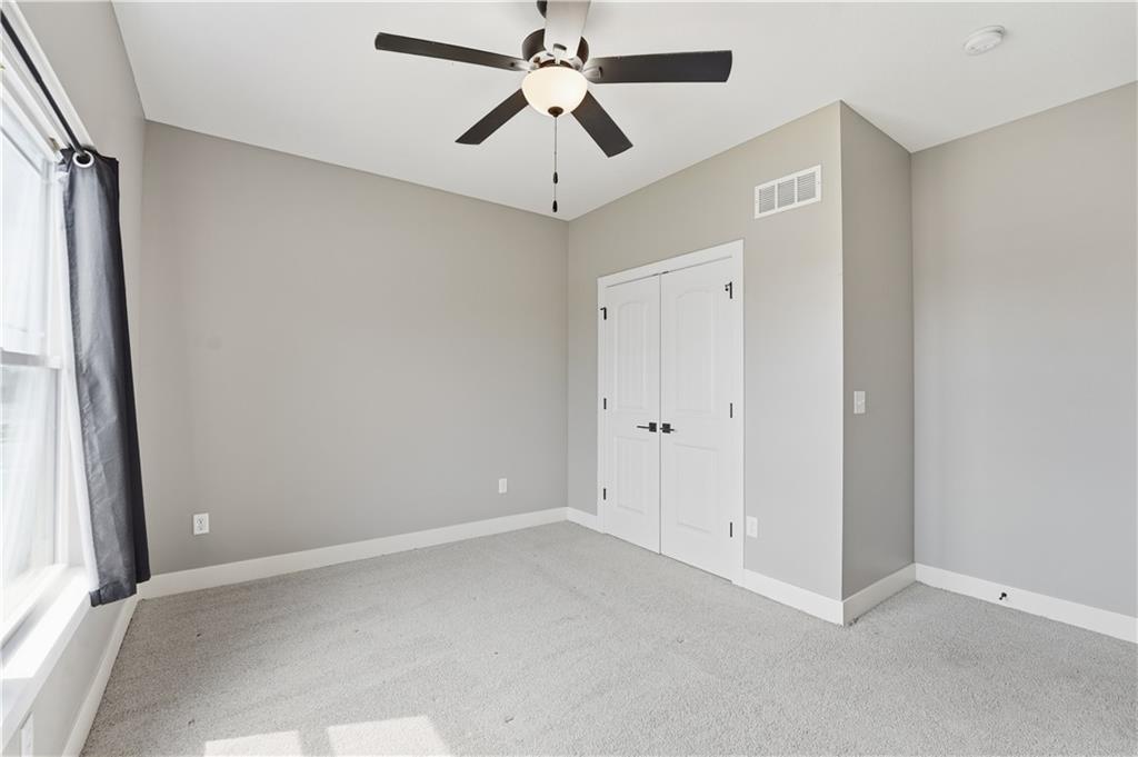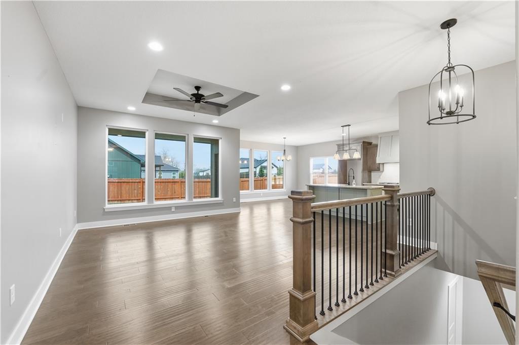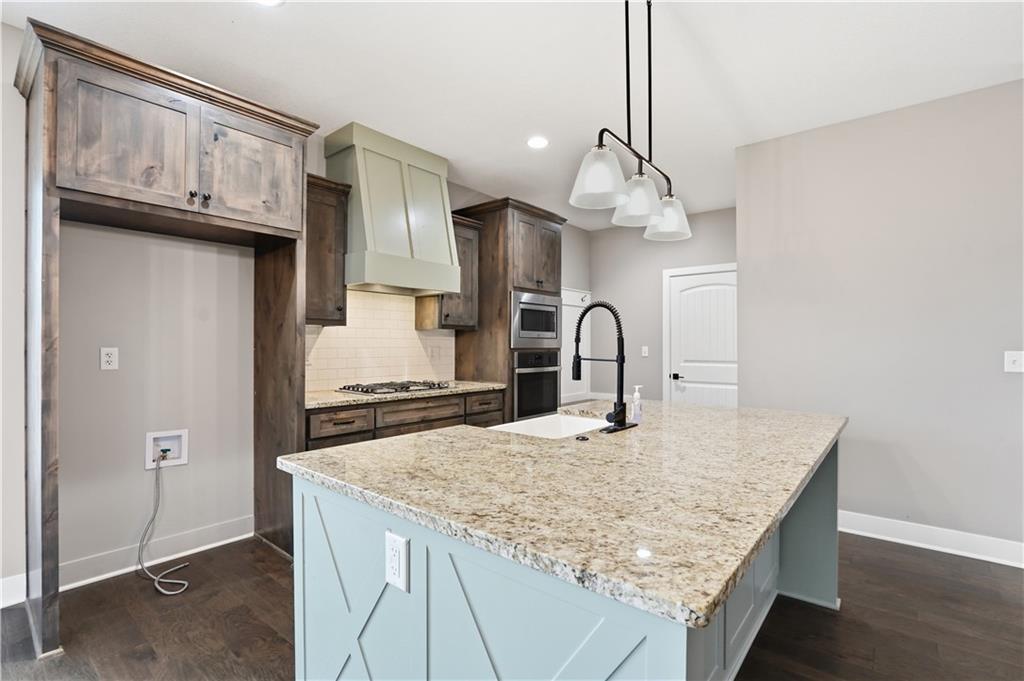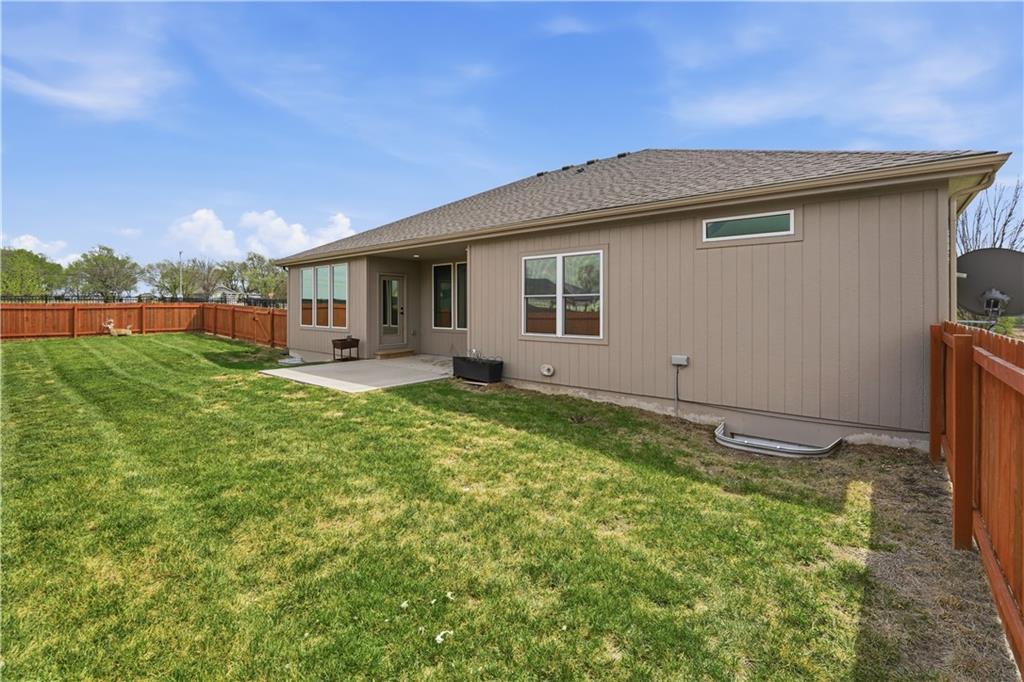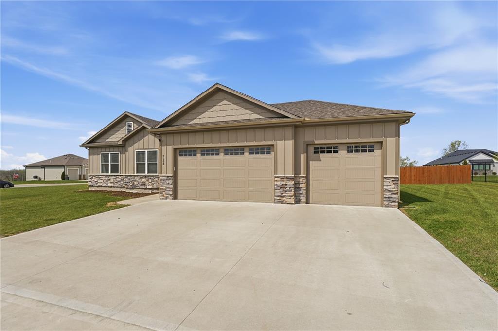 New construction ranch in Harrisonville’s premier neighborhood! This thoughtfully designed floor plan offers a country feel and sits on a large corner lot. Hardwood floors run throughout the kitchen, dining, living, hallways, and laundry room. The kitchen features a built-in oven and microwave, custom vent hood, large island with farmhouse sink, pull-out trash, soft-close cabinets, and bar seating. Walk-in pantry plus built-in shelving by the garage entry with bench, coat hooks, and shoe storage. Dining area includes floor-to-ceiling windows and access to covered patio. Living room offers 10’ ceilings with boxed detail and floor-to-ceiling windows for abundant natural light. Private primary suite features vaulted ceiling and patio access. Primary bathroom includes double vanities, walk-in shower, and large walk-in closet. Two additional bedrooms with ample closet space. Main-level laundry with linen storage. Ceiling fans in all bedrooms and living room. Oversized 3-car garage with openers. High-efficiency furnace and water heater, plus thermal tilt-in windows. Beautiful large yard with sidewalks along front and west side. Subdivision amenities include private lake and walking trails connecting to city park, lake, and golf course. A must see!