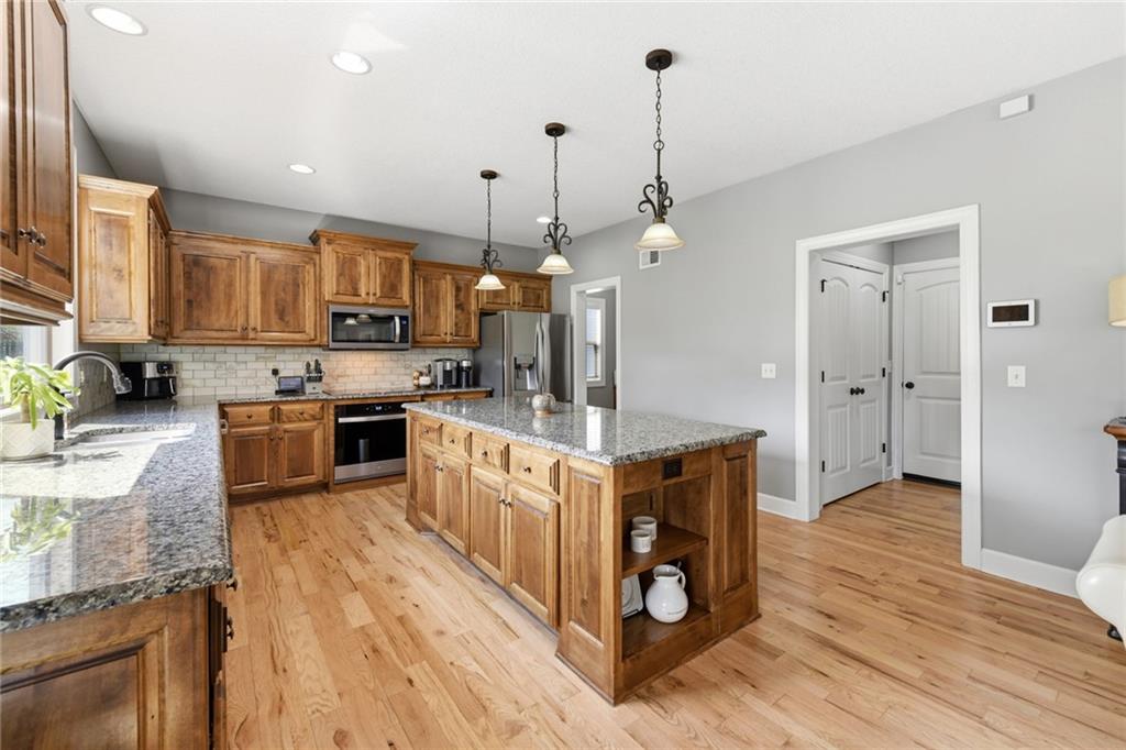Stunning 5+Bedroom Home in Lee's Summits Premier Lake Community – Raintree! Welcome to your dream home in the highly sought-after Lake community! This beautifully designed 5+bedroom, 4.5-bathroom, 2-story home offers almost 4,000 square feet of luxurious living space and is perfectly situated with views of the pristine Backyard Oasis. Step inside to find rich hardwood floors flowing throughout the main level and an open-concept floorplan filled with natural light. The gourmet kitchen features elegant cabinetry, granite countertops, a spacious island, and a walk-in pantry—ideal for both daily living and entertaining. The expansive lower-level recreation room is the ultimate gathering spot, complete with a stylish wet bar—perfect for game nights or hosting guests. After a long day, relax on the screened-in, covered deck while taking in the peaceful outdoor living area. You can continue to entertain and enjoy a wonderful day or evening in the oasis backyard with a firepit and outdoor kitchen. With 5+ spacious bedrooms, including a luxurious primary suite, and 4 full bathrooms plus a convenient half bath, there’s room for everyone to spread out and feel right at home. Raintree Lake isn't just a neighborhood—it’s a lifestyle. Enjoy access to top-notch amenities including a clubhouse, pool, lake, fitness center, and more. Don’t miss this rare opportunity to own an incredible home in one of Lee's Summits finest communities. Schedule your private showing today!
