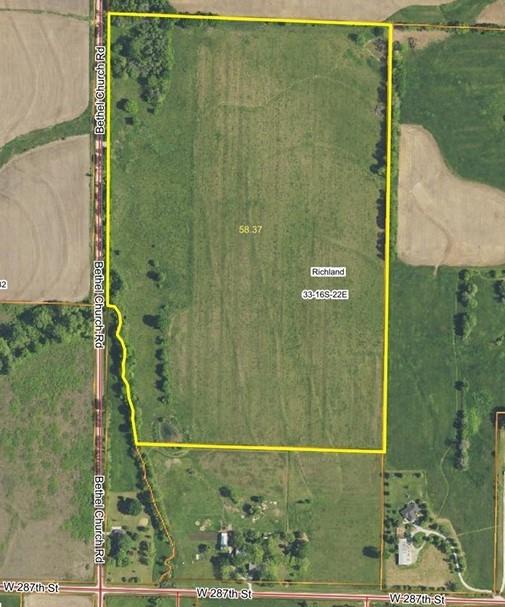 58 acre cattle pasture featuring natural beauty in an excellent location Northwest of Paola. This property is conveniently located just 1/2 of a mile South of K-68 Hwy and slightly North of the paved West 287th. Horizontal frontage situated in between both of these paved roads, and only 10 minutes from Hillsdale Lake and Kansas State Park! Enjoy the convenience of the beautiful Hillsdale fishing and wildlife area, horse trails and campgrounds, shooting range, and Jayhawk Marina. Tight, young 5-strand on perimeter, as well as cross-fenced in approximately half, for 2 pastures of roughly 29 acres each with a pond in each pasture. Steel pipe gates have been strategically placed in the center of all 4 sides of the perimeter fencing. Perfect for cattle grazing pasture land and/or a new homesite would sit well on the gentle elevation towards the West and center of the property. With Turkey Creek running along the road and the Northwestern corner of the property having just enough fresh water and cover, this property is also known for bringing in wildlife. Surrounding properties are mostly crop fields currently. You'll be proud to pull up to this extra wide entrance and open your steel pipe gate onto the property you just made yours!