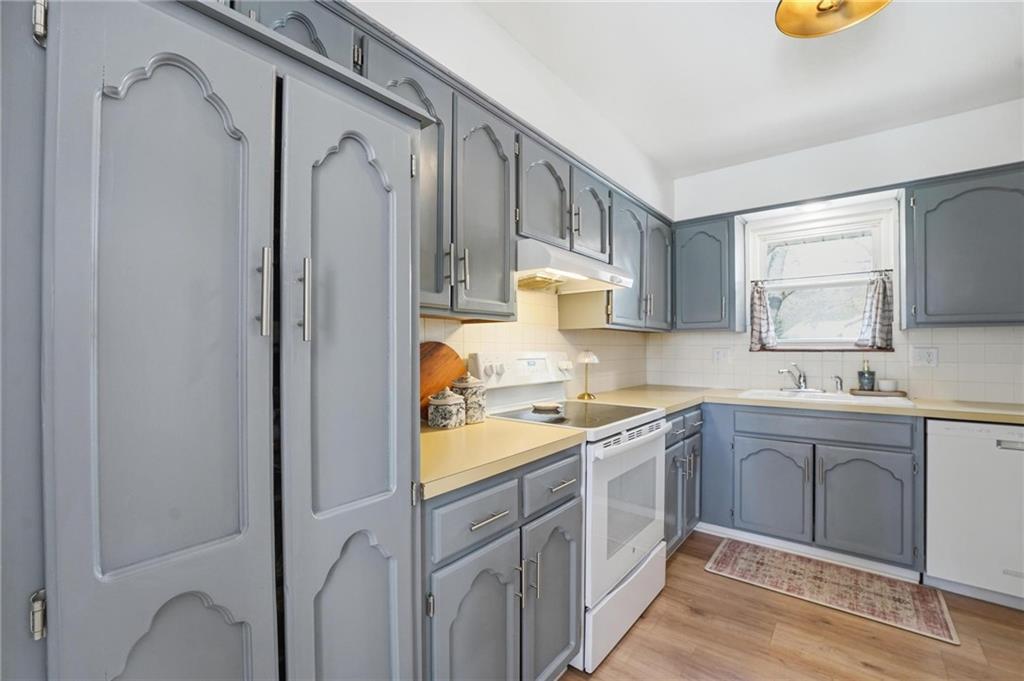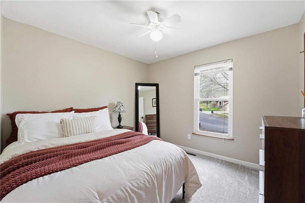 This stunning raised ranch home has been beautifully updated with modern luxury vinyl plank flooring, new carpeting, a new roof, a tiled primary bathroom shower, and fresh paint throughout. Upon entering, you'll notice the high ceilings and wooden beam accents that create a spacious atmosphere, warmly complemented by a charming stone fireplace. The layout seamlessly flows into a dining room featuring a back door that leads to the deck. The kitchen is equipped with ample cabinetry and smart counter space for all your culinary needs. Down the hallway, you will find a coat closet, linen closet, a full bathroom with a large vanity and a shower over the tub, and three cozy bedrooms at the end of the hall, each adorned with plush carpeting. The primary bedroom offers generous space and a stunning ensuite, complete with a new tiled shower, vanity, and mirror. The finished basement includes a recreation room and a laundry room with fantastic storage, including storage shelves that stay. The two car garage provides access to the basement, featuring space for a coat rack and additional storage behind the shutter doors in the recreation room. The back deck, accessible from the dining room via the back door, overlooks a fenced backyard that backs up to trees, creating a serene retreat. This home is situated in a quiet cul-de-sac within the North Kansas City School District, with Staley High School as the designated attendance school.