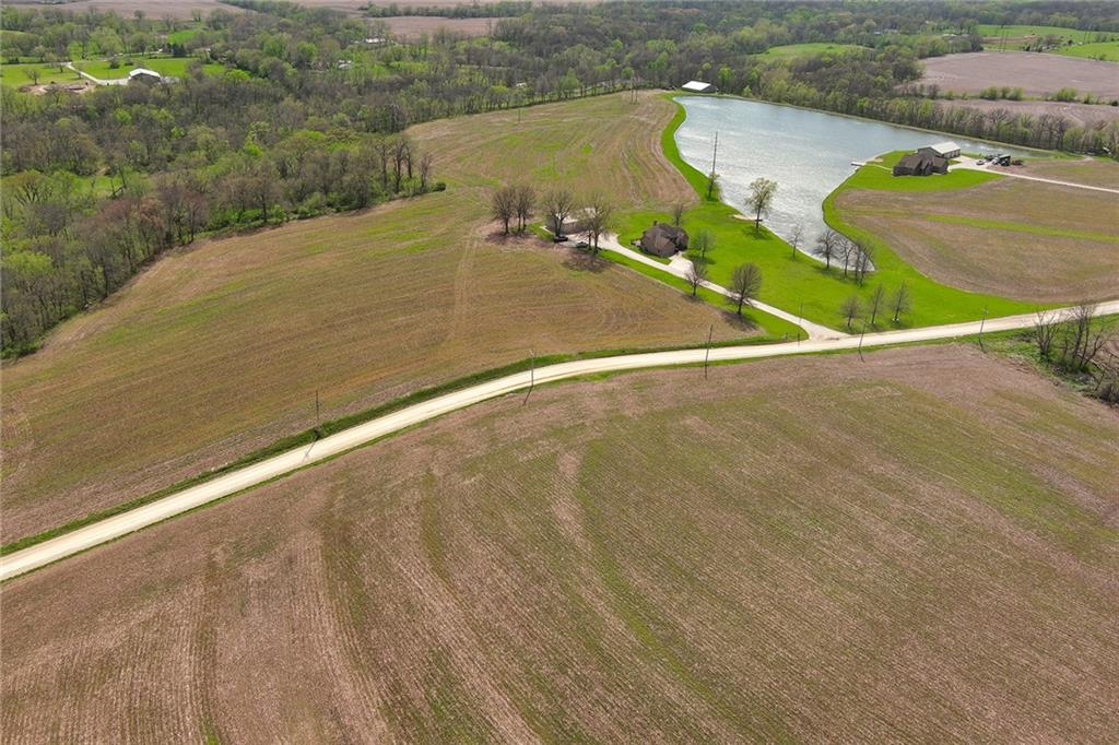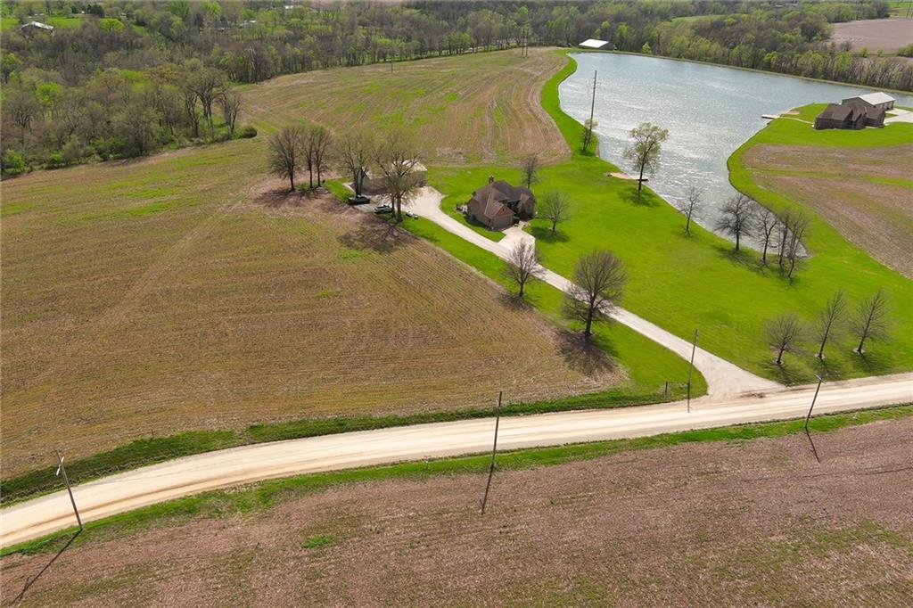 Escape to the peace of the countryside in this custom built home on 24 acres. A fully stocked pond with Bass, Crappies, Perch, Bluegill, and Catfish provides the perfect place to relax while watching the sun set. The entry opens to a large great room with heat circulating wood burning fireplace and 13' ceilings with beautiful crown moulding. There are two dining areas (one is currently being used as an office). The kitchen has many cabinets, pantry, island with cooktop, Granite countertops, tile backsplash, and wood floor. The primary suite is large and includes the following amenities - a double vanity, shower, whirlpool tub, linen closet, and walk-in closet. The two upstairs bedrooms are generous size with a shared bathroom. There is an office that could be converted into another bedroom/play area/craft room - the options are endless. There is a storage area above the garage off one of the bedrooms. The finished walk-out lower level has so much to offer with large family room, gym/exercise room (could be converted into a bedroom), full bath (with walk-in closet for guests), storage area (16.11x11.6), and 3rd car garage (14.3x11.2). The home was remodeled in 2008 with new vinyl siding, windows, roof, granite countertops, & refinished hardwood floors. The 60x40 outbuilding includes 100amp electrical service, insulated interior, concrete floor, water, radiant heat, pegboard/workbench, large overhead door for RV, & BONUS - 9,000 lb vehicle lift. There is a lean-to (40x12.6) on the back of the outbuilding. Located just a little under 10 minutes from I-70, this property offers the perfect balance of rural privacy and convenient access to town and Kansas City. Inspections welcome but selling "AS IS". The two gas tanks on the East side of the outbuilding are not staying.