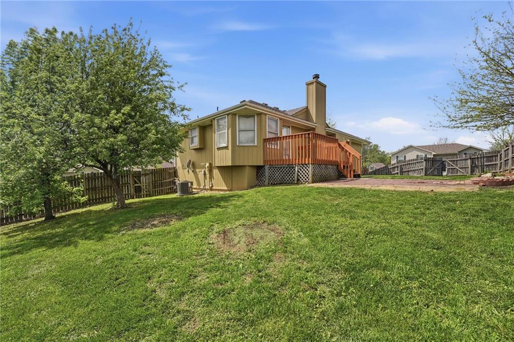 This well-maintained home offers a comfortable and functional layout with a mix of inviting living spaces and practical features. The kitchen is equipped with laminate countertops, luxury vinyl plank flooring, a pantry, and an eat-in area, creating a bright and efficient space for daily living. The main living area features carpeted flooring and a ceiling fan, providing a cozy setting to relax or entertain. The primary bedroom includes a walk-in closet, while additional bedrooms offer ample space and storage. Bathrooms are thoughtfully distributed, including a main floor full bath with a tub/shower combination and a jacuzzi feature, a private primary bath, and an additional full bath in the basement. The unfinished basement provides excellent potential for future expansion or storage and also includes the laundry area and utility space. Outside, the fenced backyard offers privacy and room to enjoy outdoor activities.