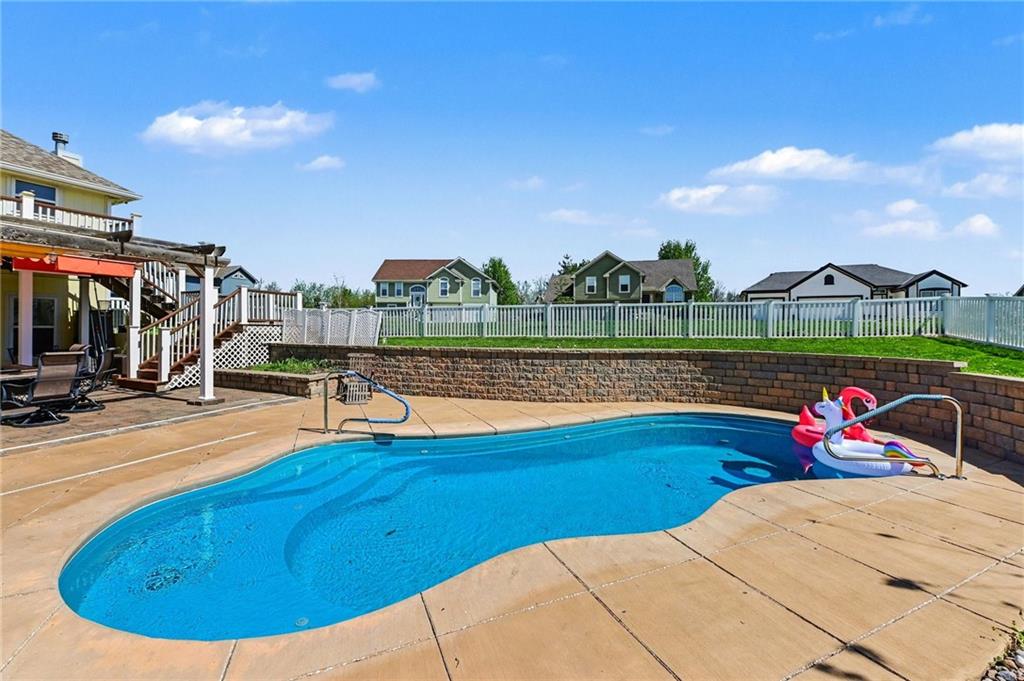 Welcome to your private outdoor entertainment retreat just minutes from Smithville Lake: every day feels like a vacation. Designed for year-round enjoyment, the backyard is the showstopper. Dive into the 30-foot heated saltwater pool, unwind on the spacious paver stone patio, or host unforgettable gatherings at the 14x10 gazebo, fully transformed into a Tiki bar. Relax under the pergola with retractable misting shades beside a fire pit table that comfortably seats six. The fully fenced yard, featuring maintenance-free white vinyl fencing: also includes an outdoor shower for added convenience. Inside, the living room features hardwood floors, a vaulted ceiling, and a cozy fireplace, creating a warm and inviting atmosphere. The kitchen & dining area flow seamlessly to a large deck with stairs leading directly to the pool. The kitchen is equipped with a pantry, refreshed white cabinetry, generous counter space, stainless steel appliances. The primary suite offers a vaulted ceiling, two walk-in closets, and a private ensuite bath complete with double vanities, a whirlpool tub, & a separate shower. Secondary bedrooms each include walk-in closets & ceiling fans. The finished lower level expands your living space with a versatile rec room featuring a second fireplace, built-in bookshelves, a half bath, & walkout access to the backyard. Updates include newer garage doors & openers, a sprinkler system, & refreshed pool landscaping. The HVAC system is just 3 years old, providing added comfort & peace of mind. The 3-car side-entry garage offers ample parking & storage. Enjoy neighborhood amenities including walking trails, a community pool, & a scenic fishing lake. Located near Smithville Lake, with over 175 miles of shoreline, you’ll have access to marinas, campgrounds, picnic shelters, golf courses, & endless outdoor recreation: boating, fishing, sailing, swimming, water skiing, plus hiking, biking, and equestrian trails. This isn’t just a home: it’s a lifestyle.
