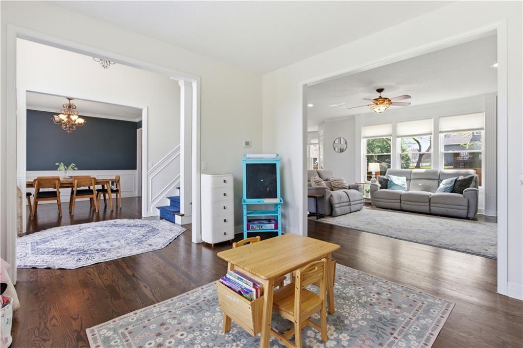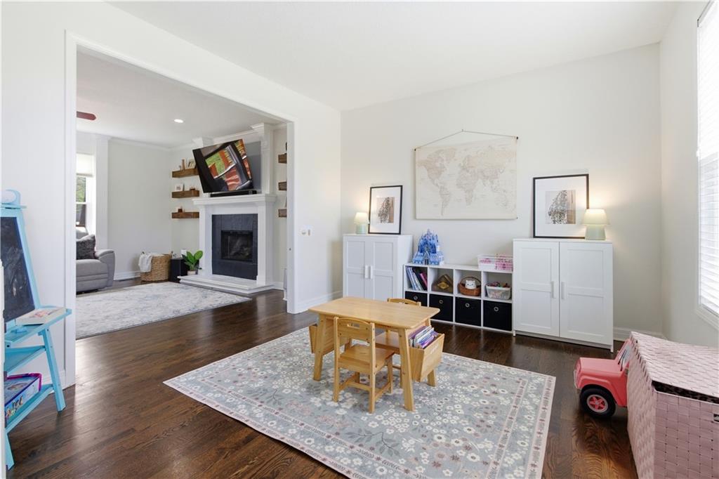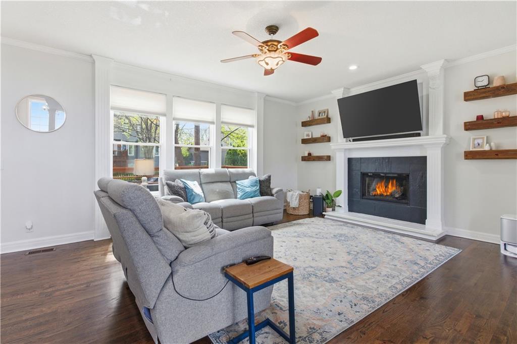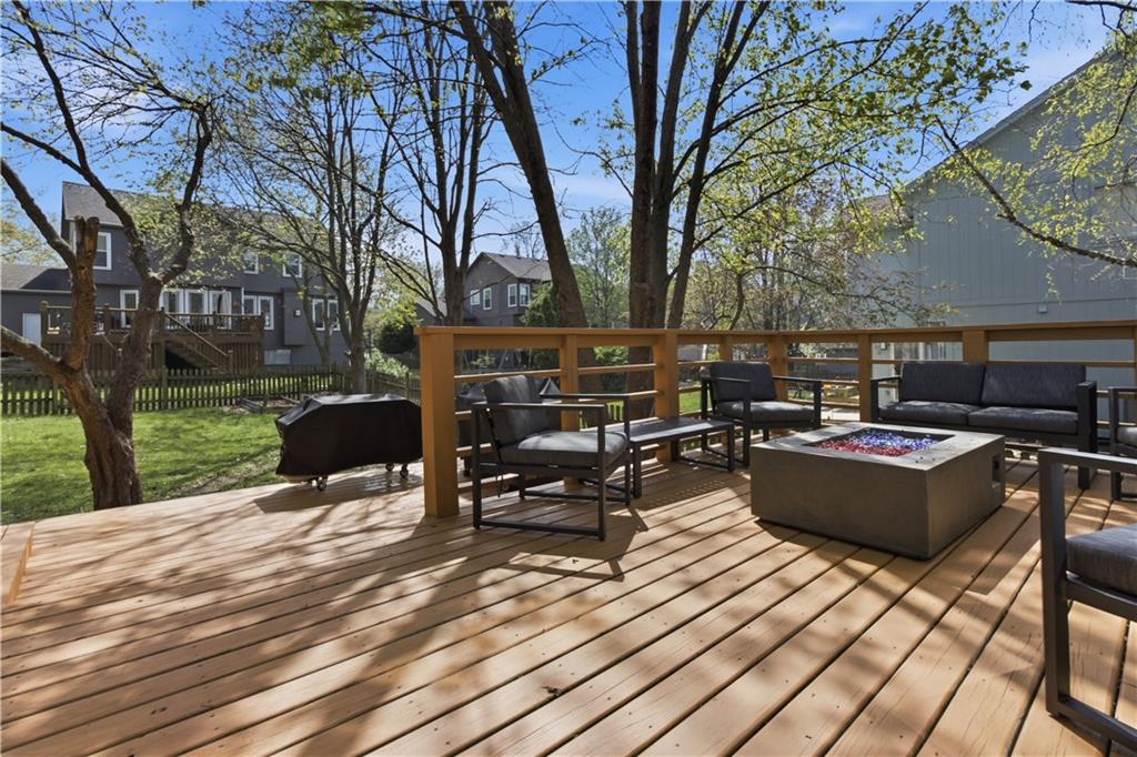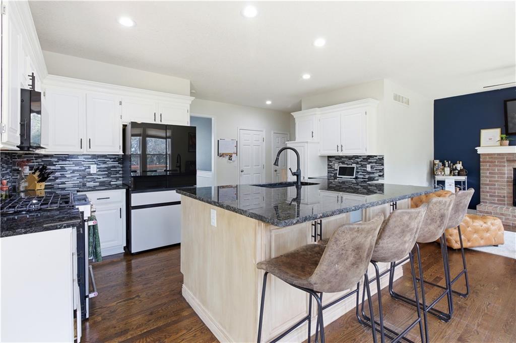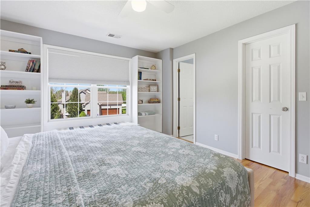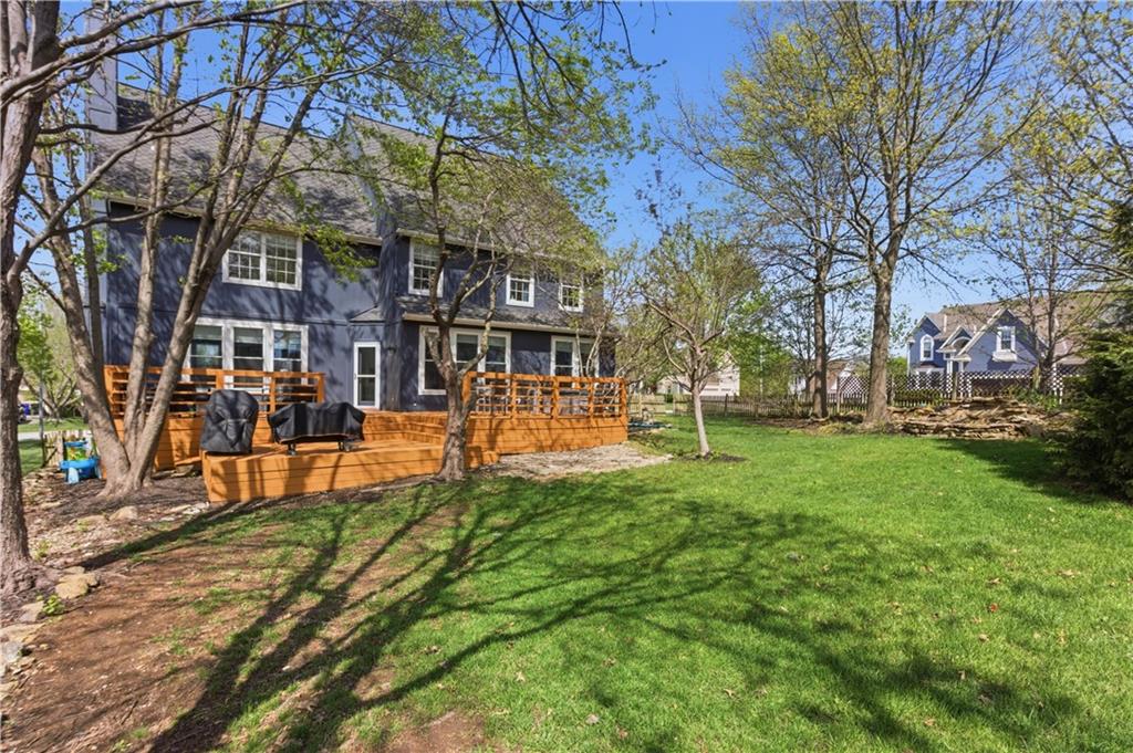 Move-in ready beauty! Spacious two-story home on a large cul-de-sac lot. Newer windows on main and basement levels. Grand main entrance opens to dining room and bonus sitting room. Bright, large windows throughout. Cozy living room with fireplace. Main floor boasts a HUGE kitchen with abundant counter and cabinet space, updated appliances, eat-at island, and breakfast nook overlooking backyard. Bonus hearth area perfect for entertaining or relaxing. No popcorn ceilings! Walk-in pantry with original laundry hookups plus second laundry hookup in primary bedroom closet for convenience. Half bath on main level. Upstairs features hardwood floors in most bedrooms, cozy carpet in primary, and each bedroom has its own attached bath—Jack and Jill for smaller rooms, private bath for guest room. Massive primary suite with office space, en-suite with oversized shower, ample counters, and walk-in closet. Finished basement with game/family room, full bath, and bonus workout/play space. Storage room doubles as golf practice area. Huge deck with built-in fire pit and direct gas hookup. Located in Blue Valley schools and very close to Black Bob Park, groceries, shops, dining and more!