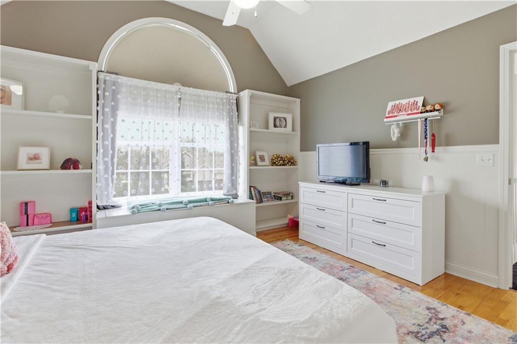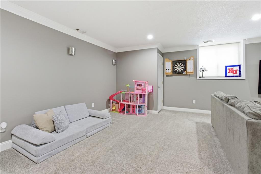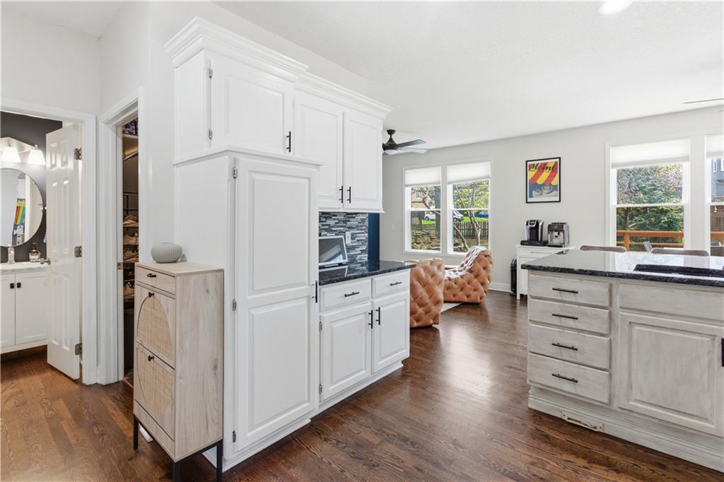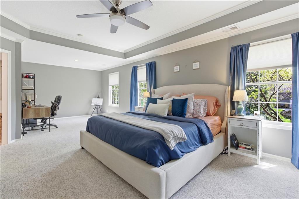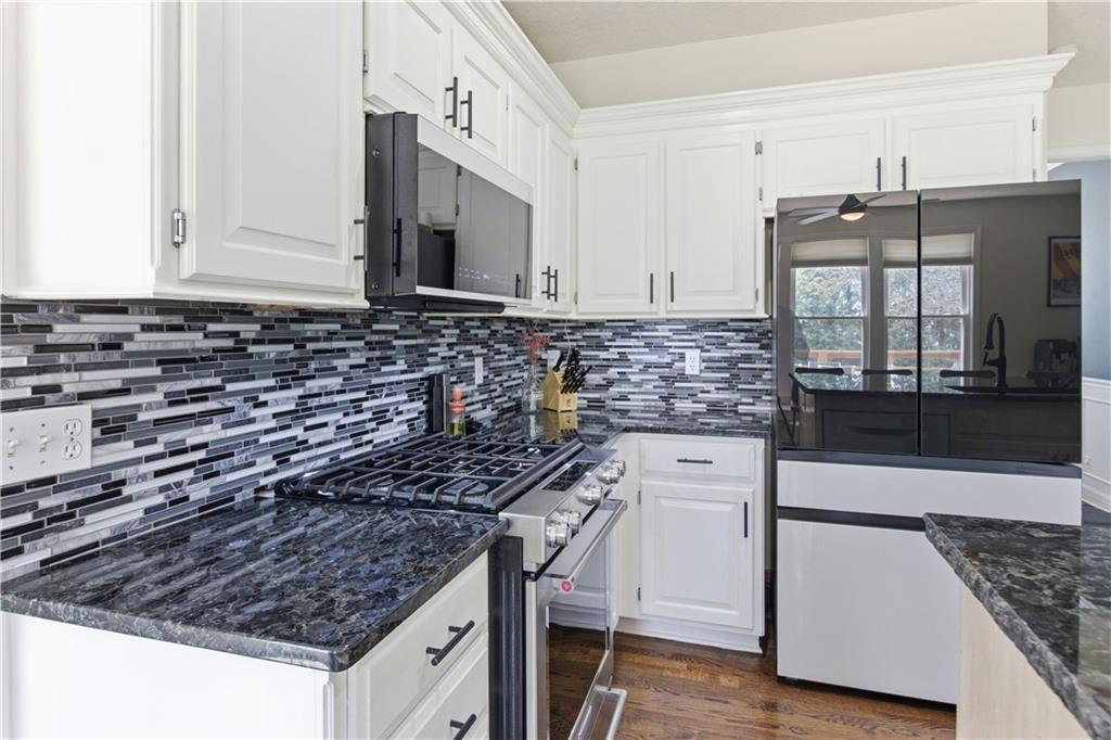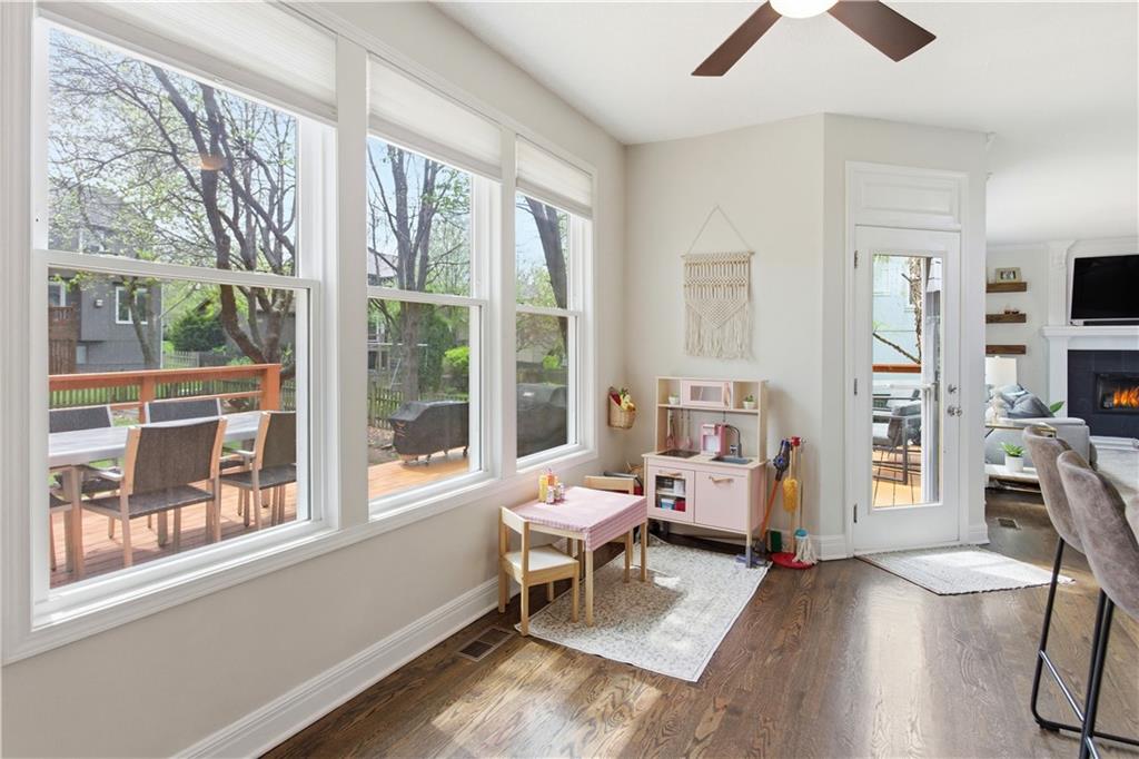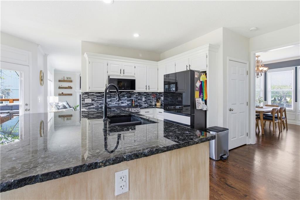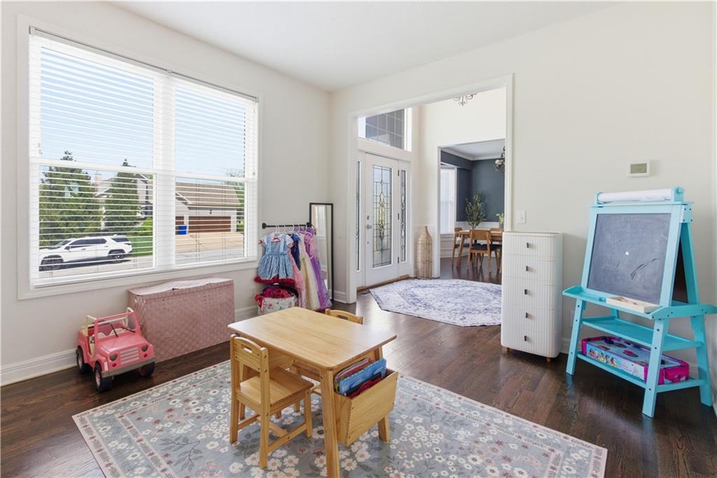 Move-in ready beauty! Spacious two-story home on a large cul-de-sac lot. Newer windows on main and basement levels. Grand main entrance opens to dining room and bonus sitting room. Bright, large windows throughout. Cozy living room with fireplace. Main floor boasts a HUGE kitchen with abundant counter and cabinet space, updated appliances, eat-at island, and breakfast nook overlooking backyard. Bonus hearth area perfect for entertaining or relaxing. No popcorn ceilings! Walk-in pantry with original laundry hookups plus second laundry hookup in primary bedroom closet for convenience. Half bath on main level. Upstairs features hardwood floors in most bedrooms, cozy carpet in primary, and each bedroom has its own attached bath—Jack and Jill for smaller rooms, private bath for guest room. Massive primary suite with office space, en-suite with oversized shower, ample counters, and walk-in closet. Finished basement with game/family room, full bath, and bonus workout/play space. Storage room doubles as golf practice area. Huge deck with built-in fire pit and direct gas hookup. Located in Blue Valley schools and very close to Black Bob Park, groceries, shops, dining and more!