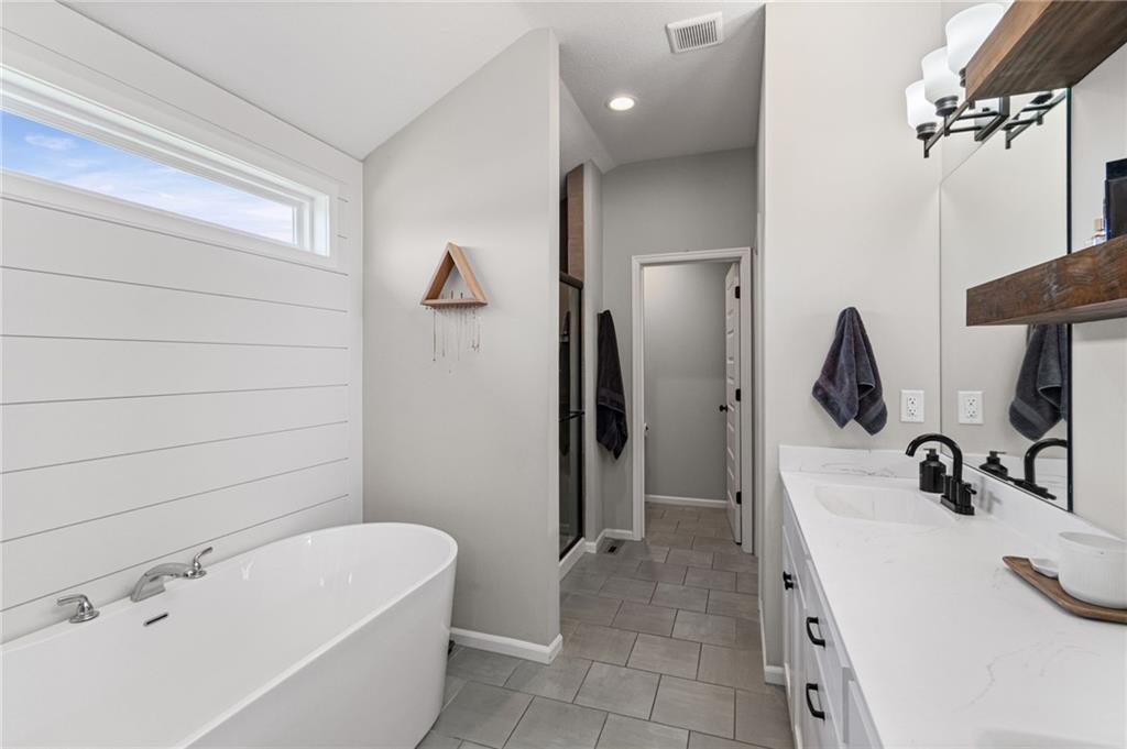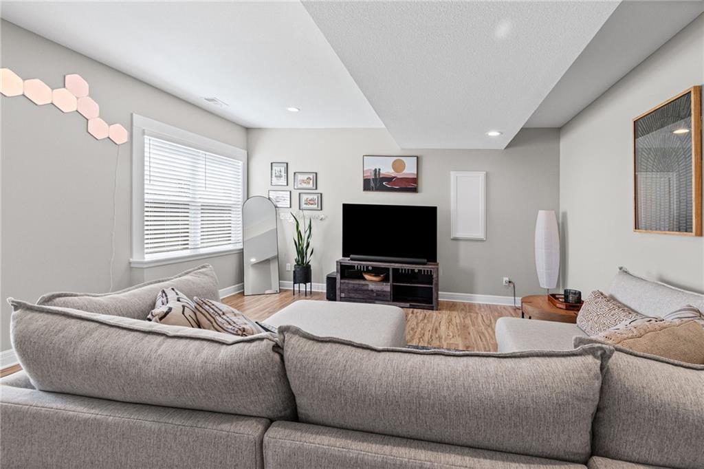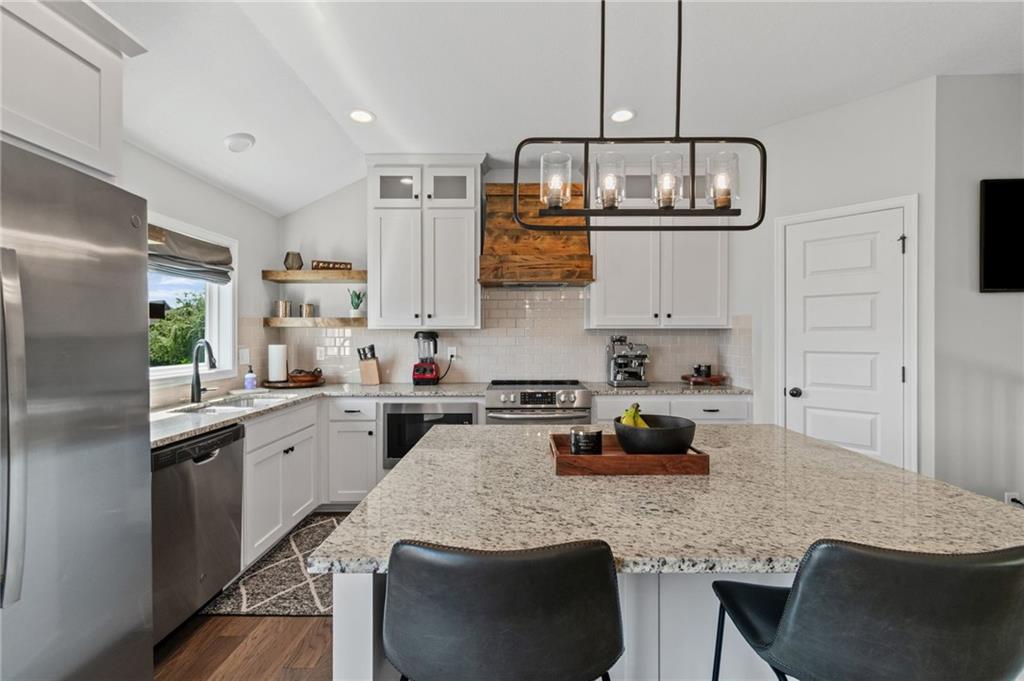 This beautifully updated home is truly move-in ready, featuring fresh interior paint, new flooring and carpet throughout, a newly epoxied garage floor, upgraded landscaping, lawn irrigation system, and a wrought iron fence—plus so much more! From the moment you arrive, you’ll be charmed by the inviting front sitting porch, cedar shutters, and striking architectural beams. Step inside to discover vaulted ceilings, rich hardwood floors, and a warm, welcoming living room complete with a gas fireplace, decorative shiplap, and a wood mantle. The staircase showcases sculptured carpet and elegant white spindles, leading you into a breathtaking kitchen and dining area. The kitchen is a true showstopper with custom white cabinetry (including glass-front accents), a custom stained hood, granite countertops, stainless steel appliances, wood shelving, a spacious pantry, and a brand-new stove highlighting the tiled backsplash. The dining area is generously sized—perfect for hosting large gatherings—and flows seamlessly with the hardwood flooring that extends throughout the kitchen, dining space, and hallway. Stylish light fixtures add a modern touch throughout the home. The spacious primary bedroom features decorative beams and leads into a luxurious ensuite bath complete with double sinks, cultured marble countertops, tiled backsplash, custom shelving, a relaxing soaking tub, walk-in closet, and tiled shower—all enhanced with charming shiplap details. Two additional bedrooms and a conveniently located laundry room complete the main level. Downstairs, enjoy a huge recreation room along with an additional half bath—ideal for entertaining or relaxing. The oversized, extra-deep garage offers exceptional storage space. Located in a fantastic neighborhood, this home truly has it all. Don’t miss your chance—schedule your showing today!