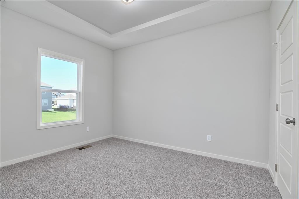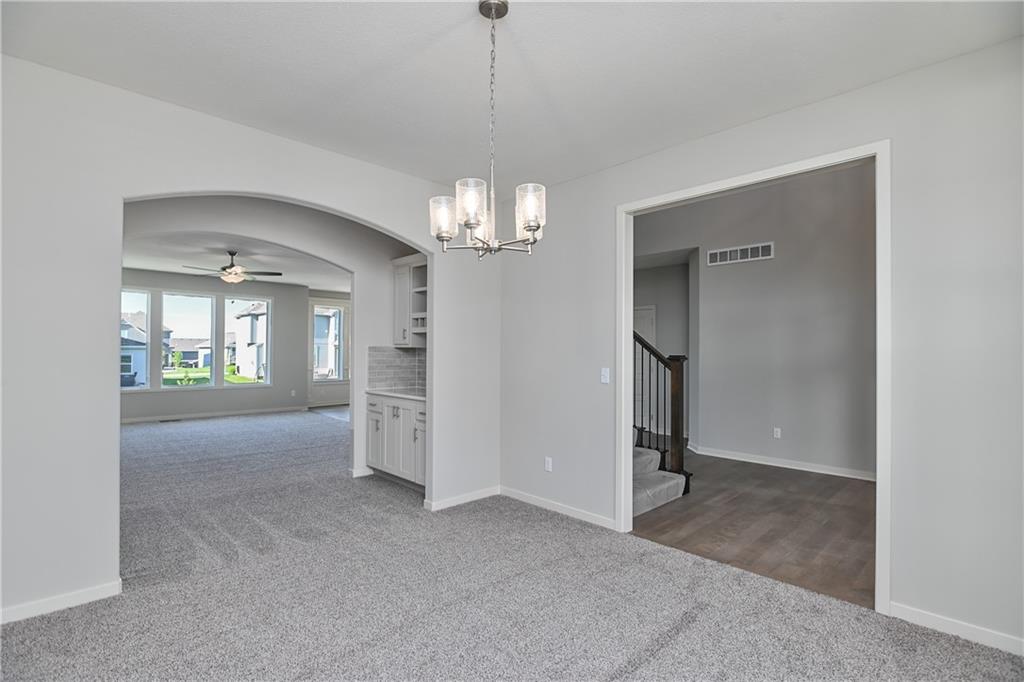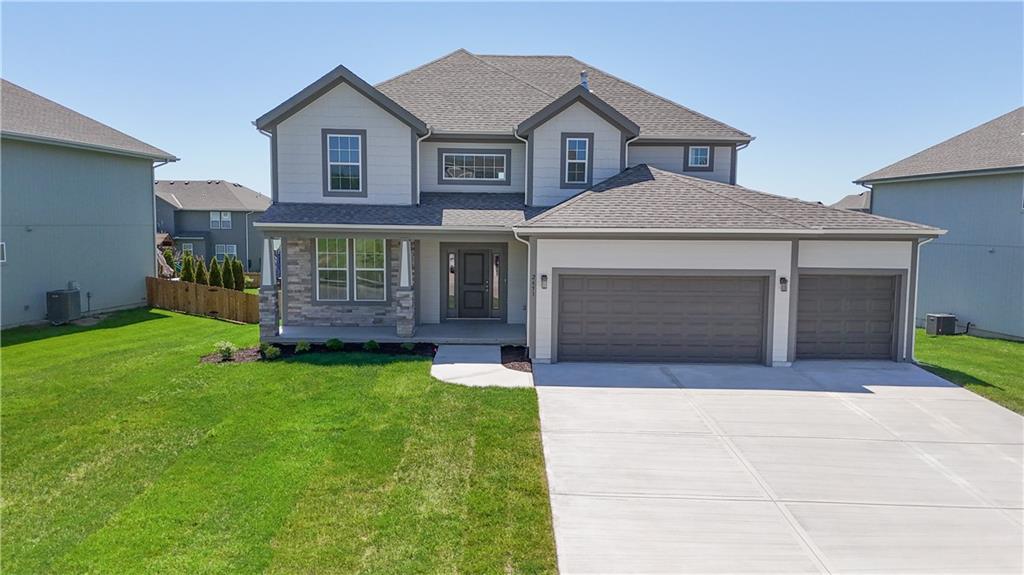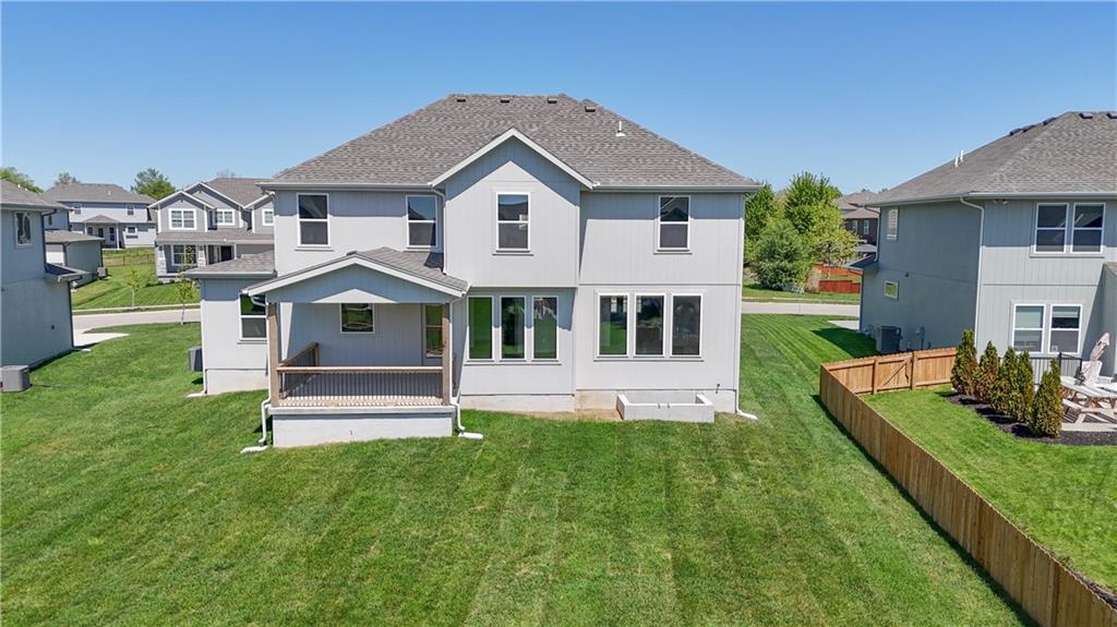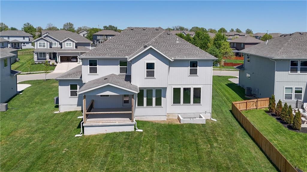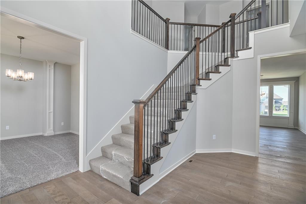Popular Harlow 5 | 5 Bedrooms | 4 Baths | 3-Car Garage | Prairie Farms This stunning 2-story Harlow 5 home offers 5 bedrooms, 4 baths, and a spacious 3-car garage in the highly sought-after Prairie Farms community. From the moment you enter, you’ll be impressed by the beautiful turned staircase and gleaming hardwood floors. The formal dining room features built-in cabinetry on both sides and flows seamlessly into a bright, open great room with a cozy fireplace and abundant natural light. The adjacent dining area and chef’s kitchen are an entertainer’s dream—highlighted by hardwood floors, granite countertops, a large center island, apron-front sink, painted custom cabinets with soft-close doors and drawers, upgraded hardware, stainless steel appliances, built-in microwave, and a generous walk-in pantry. A main-level bedroom with a closet offers flexibility as a guest suite, office, playroom, craft space, or more. Upstairs, the luxurious owner’s suite boasts a spa-like bathroom with double granite vanities, tile floors, a free-standing soaking tub, and a walk-in tiled shower. A spacious walk-in closet connects directly to the conveniently located laundry room. Two secondary bedrooms share a Jack & Jill bath, each with its own private vanity. A fourth upstairs bedroom features its own private bath and walk-in closet. Additional highlights include a huge unfinished basement with abundant storage potential, an in-ground sprinkler system, and more. Community amenities include a large swimming pool, cabana, playground, and walking trails. Plus, Prairie Farms is adjacent to the newly renovated Lake Olathe, offering paddleboarding, fishing, hiking, and more—making this a perfect place to call home! Photos are of actual home.