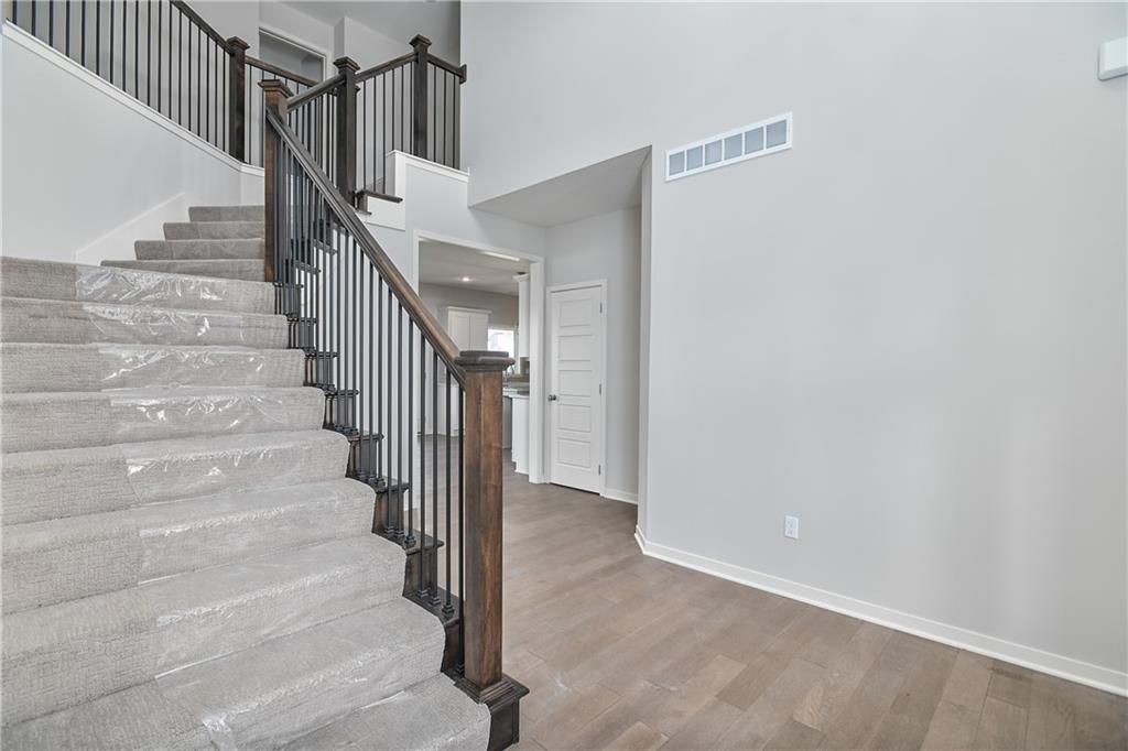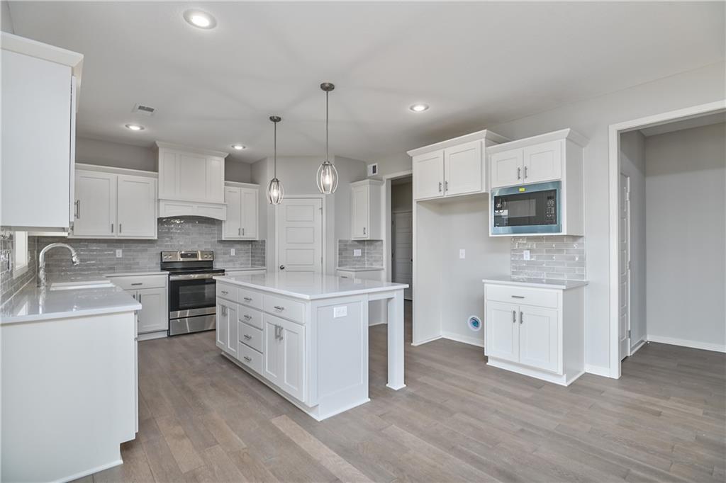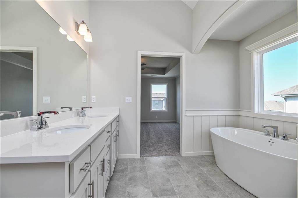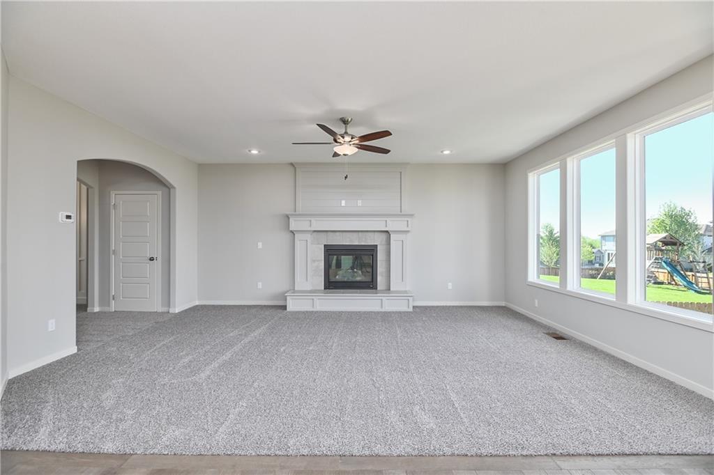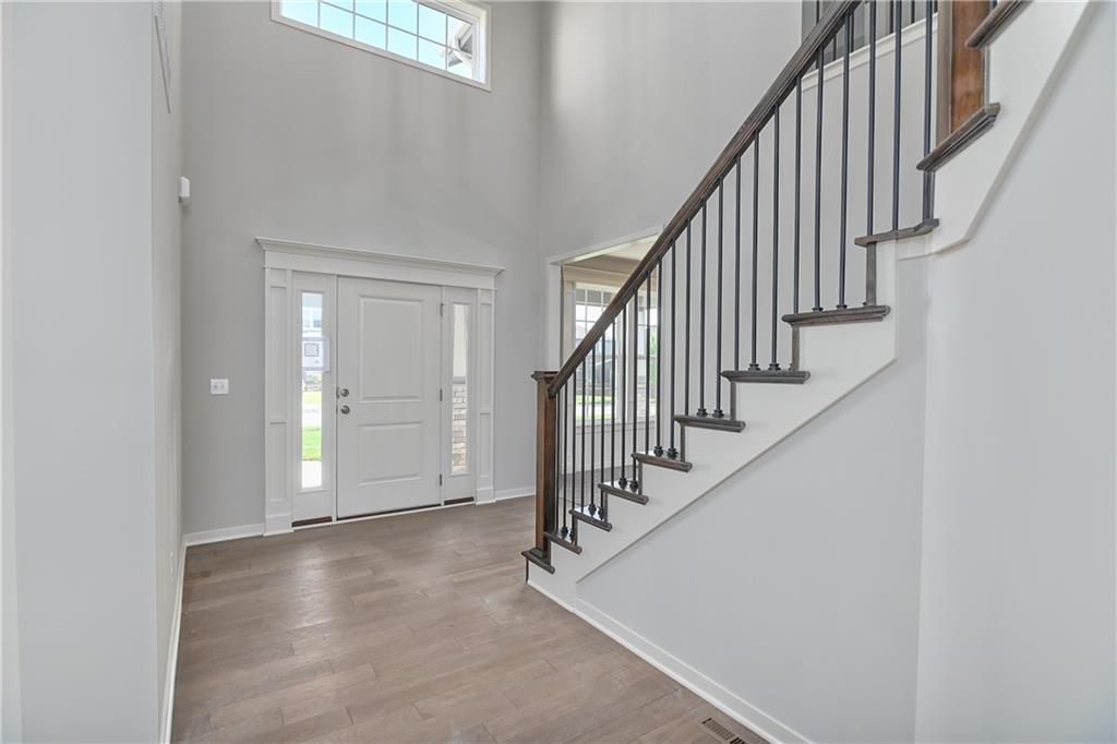 Popular Harlow 5 | 5 Bedrooms | 4 Baths | 3-Car Garage | Prairie Farms This stunning 2-story Harlow 5 home offers 5 bedrooms, 4 baths, and a spacious 3-car garage in the highly sought-after Prairie Farms community. From the moment you enter, you’ll be impressed by the beautiful turned staircase and gleaming hardwood floors. The formal dining room features built-in cabinetry on both sides and flows seamlessly into a bright, open great room with a cozy fireplace and abundant natural light. The adjacent dining area and chef’s kitchen are an entertainer’s dream—highlighted by hardwood floors, granite countertops, a large center island, apron-front sink, painted custom cabinets with soft-close doors and drawers, upgraded hardware, stainless steel appliances, built-in microwave, and a generous walk-in pantry. A main-level bedroom with a closet offers flexibility as a guest suite, office, playroom, craft space, or more. Upstairs, the luxurious owner’s suite boasts a spa-like bathroom with double granite vanities, tile floors, a free-standing soaking tub, and a walk-in tiled shower. A spacious walk-in closet connects directly to the conveniently located laundry room. Two secondary bedrooms share a Jack & Jill bath, each with its own private vanity. A fourth upstairs bedroom features its own private bath and walk-in closet. Additional highlights include a huge unfinished basement with abundant storage potential, an in-ground sprinkler system, and more. Community amenities include a large swimming pool, cabana, playground, and walking trails. Plus, Prairie Farms is adjacent to the newly renovated Lake Olathe, offering paddleboarding, fishing, hiking, and more—making this a perfect place to call home! Photos are of actual home.