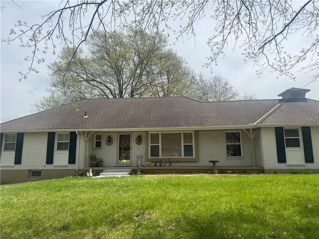 This property features a single-story design with a light-colored brick exterior and dark shutters
