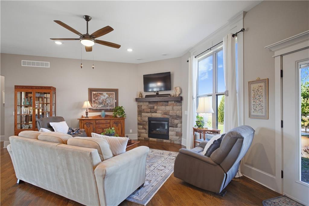 Former model home in highly desirable Greyhawke at the Lake! This spacious 4-bedroom, 3-bath residence offers an open and airy floor plan with tall 6-panel doors, large closets, and quality finishes throughout. The main level features three bedrooms, including a private primary suite with dual vanities, a jetted tub, a tiled glass walk-in shower, and a private water closet. Hardwood floors flow through the great room, dining area, and kitchen, and a gas fireplace anchors the living space perfect for both everyday living and entertaining. The finished daylight basement provides flexible space for recreation, guests, or hobbies. Step outside to enjoy the covered patio overlooking a beautifully landscaped corner lot that adjoins green space and includes an in ground sprinkler system. A security system and internal antenna streaming system are added bonuses. The three car attached garage offers plenty of room for vehicles, storage, or lake gear. Recent updates include a new roof and gutters for added peace of mind. Located just minutes from Smithville Lake and Paradise Pointe Golf Complex, with easy access to top-rated Smithville schools and Northland amenities, this home delivers space, comfort, and an unbeatable location.