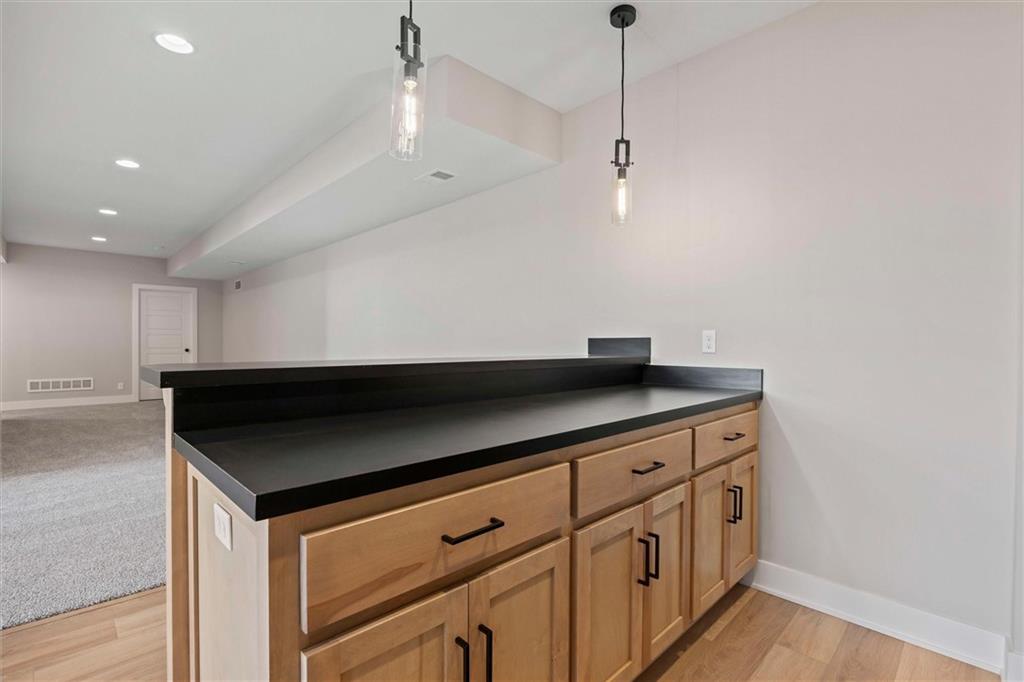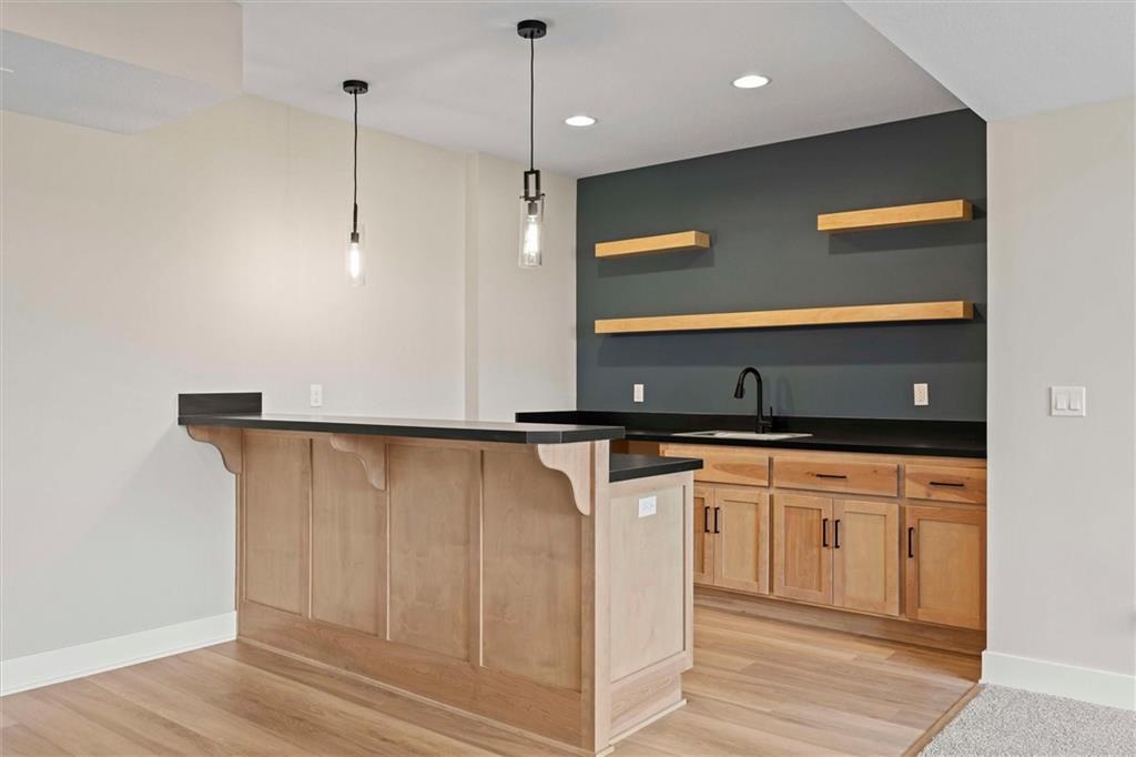 MOVE-IN READY - Discover the exceptional craftsmanship of Lamendola Custom Homes with The Aiden Expanded, located on Lot 99. This stunning 4-bedroom, 3-bathroom reverse-story home offers an impressive blend of style, comfort, and functionality. The main level features a beautifully designed kitchen, an inviting great room, a serene primary suite, a secondary bedroom that can double as an office, a convenient 3/4 bath, and a well-placed laundry room. The lower level expands your living space with two additional bedrooms, a full bathroom, a spacious family room, and an impressive bar complete with a large island—perfect for entertaining. Situated on a daylight lot with a covered deck, this home also includes an oversized garage with 8-foot garage doors for added convenience and versatility. Come experience the quality and elegance this home has to offer!