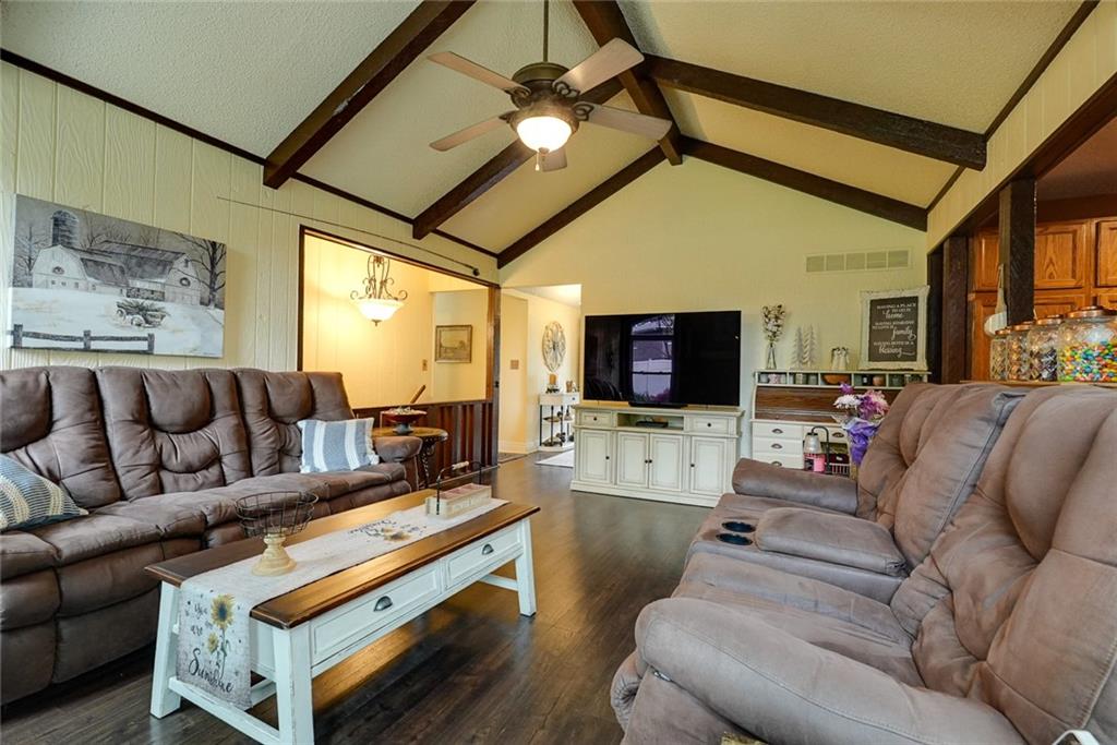 Vaulted ceiling with exposed wood beams and a ceiling fan