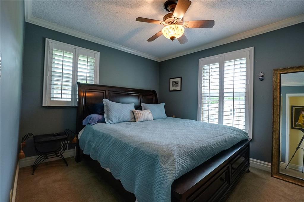 Bedroom with two windows featuring white plantation shutters, crown molding, a ceiling fan with light fixture, and neutral-toned carpeting