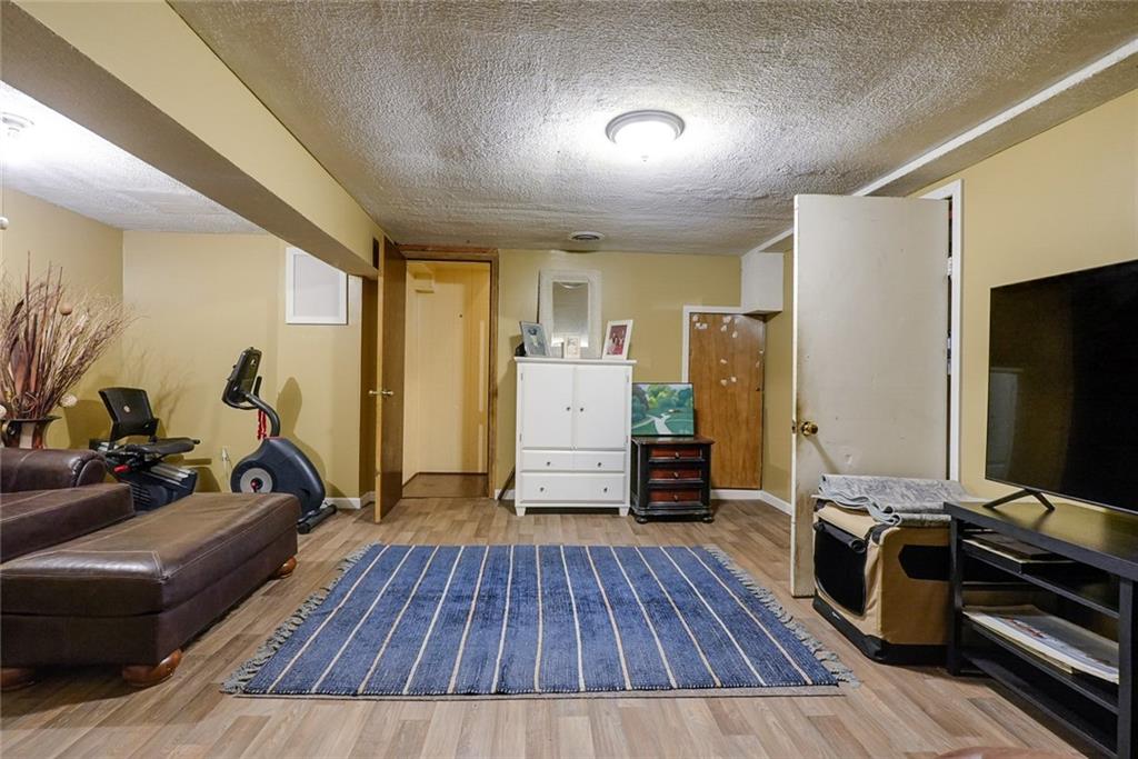 Finished lower level featuring wood-finish flooring, recessed lighting, and an exposed ceiling beam