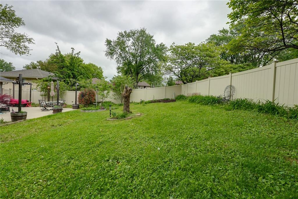 Spacious outdoor area featuring a concrete patio, verdant lawn, and mature trees