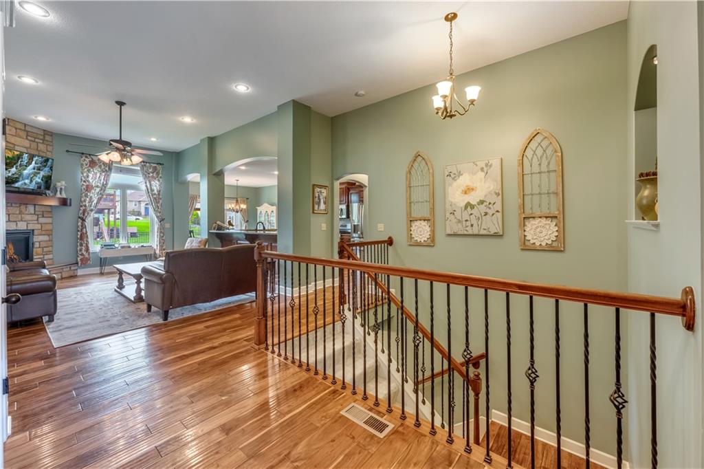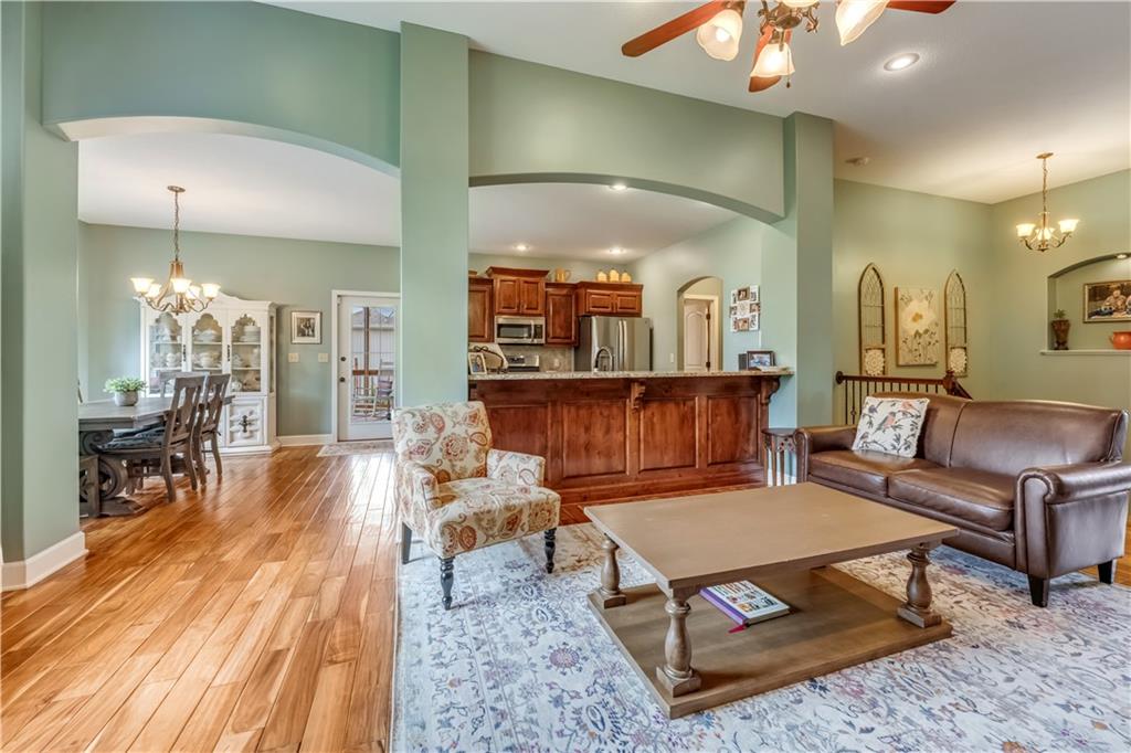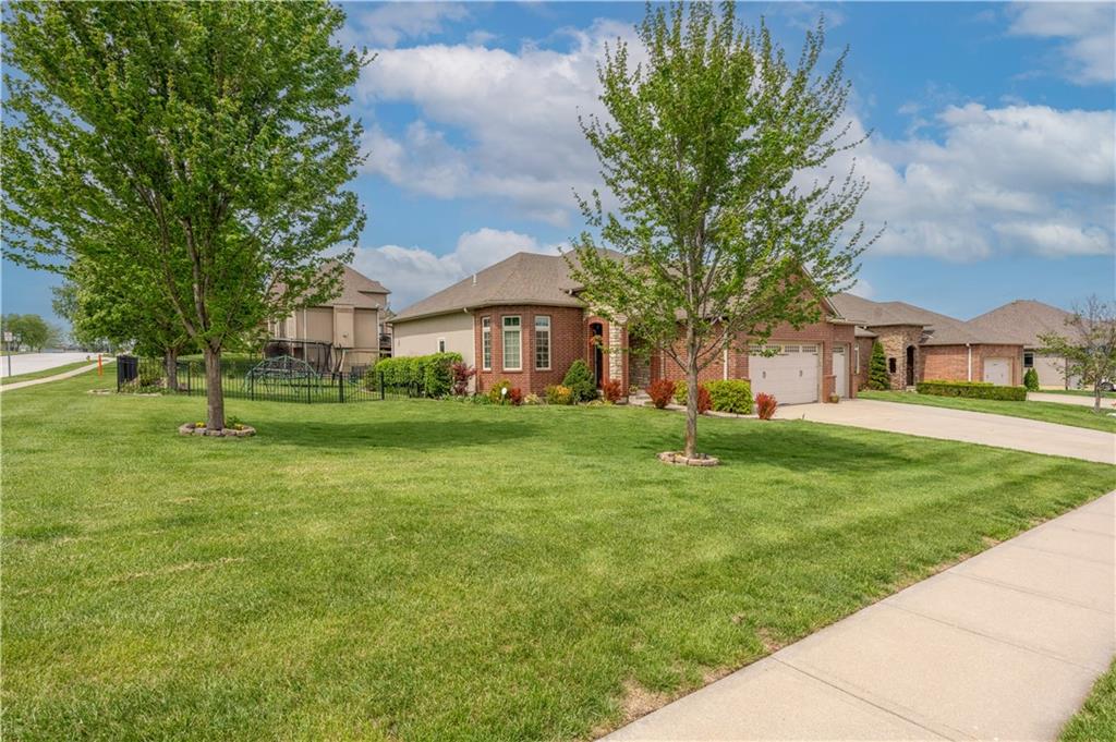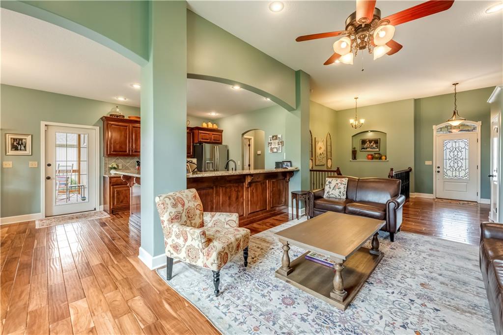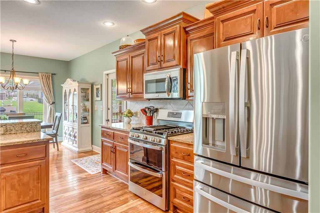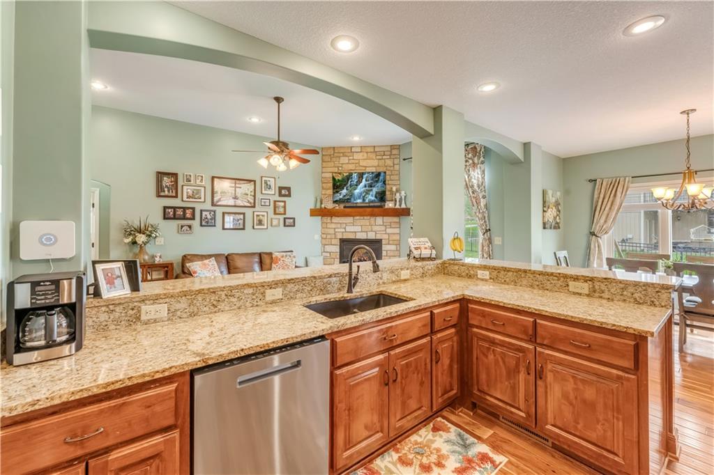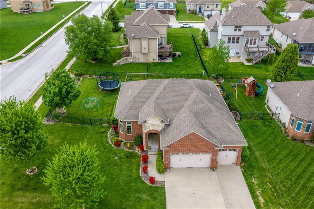 Your beautiful home is ready for you in the desirable Cayhill subdivision, known for holiday events, walkability, and commuting convenience to Whiteman AFB! This immaculate reverse ranch sits on a large corner lot with subdivision lake privileges, just minutes to shopping and restaurants in town. The welcoming front porch ushers you into warm hardwood hand-scraped floors and an open concept great room with tall ceilings. Enjoy the warmth of the gas fireplace with stone surround and still have connection to the Kitchen/Dining Room activities. Sellers have increased energy efficiency with window replacement in LR, DR, back secondary Bedroom, and hall Bathroom June 2025. Your large Kitchen has an abundance of custom wood cabinetry, granite counters, stainless steel appliances that all stay (Fridge, double oven, and dishwasher less than a year old!) and a dedicated pantry directly off the Kitchen. Main floor laundry is also nearby. The generous Primary Bedroom showcases a walk-in closet, newer carpet, and a beautifully updated on-suite Bathroom with new floor tile, newly tiled shower, new glass door, double vanity, and jetted tub. The two secondary Bedrooms have larger closets with storage systems and newer carpet with the hall Bathroom between. The lower level includes a full bar (drink fridge will stay) and service area off of the spacious Family Room, the 4th true Bedroom with a walk-in closet, another nonconforming room for many uses, and a 3rd full Bathroom. The 300 SF storage area includes a utility sink, storm shelter, NEW AC and furnace in 2025! Head out the patio door upstairs to the screened-in deck for relaxation without bugs! The basement patio leads up to the wide, newly stained back deck with a dedicated gas line for a firepit or grill. Play options abound with a swing-set and more in the fenced yard with in-ground sprinkler system. Come make new memories here!