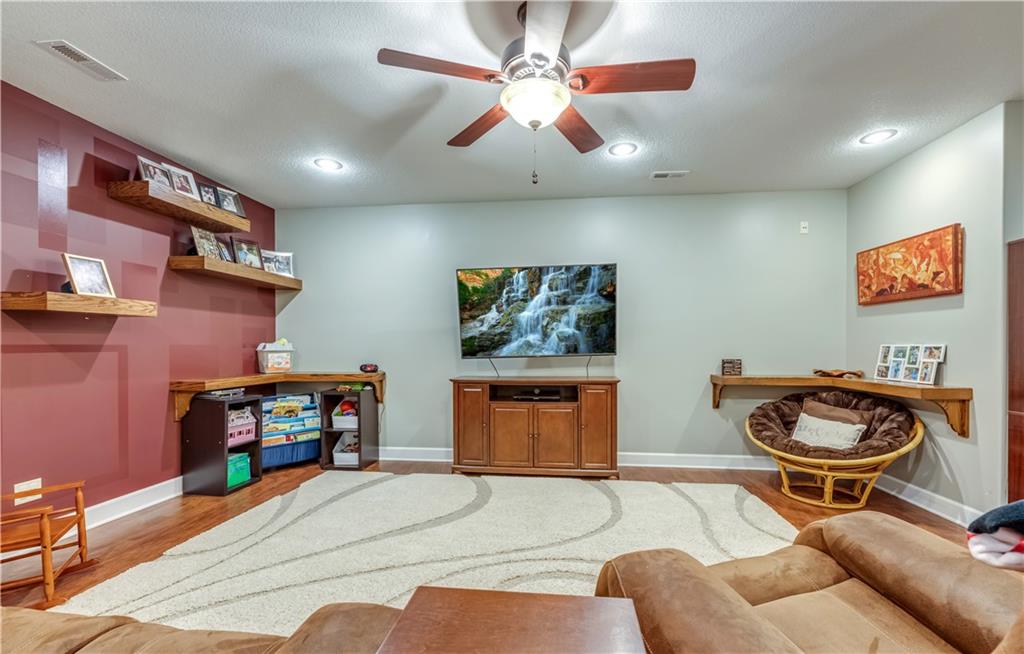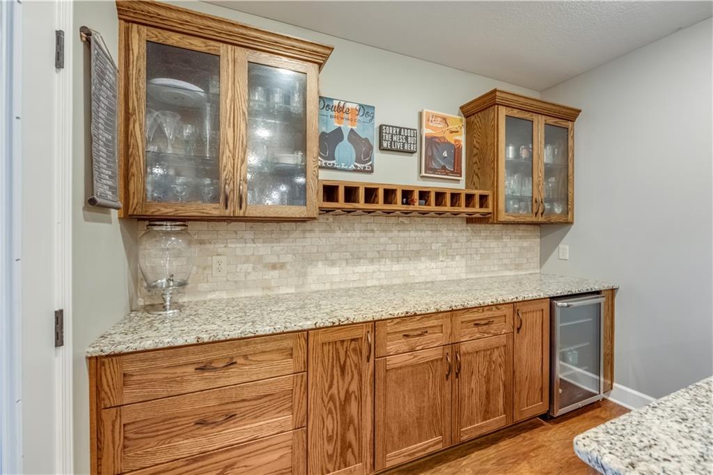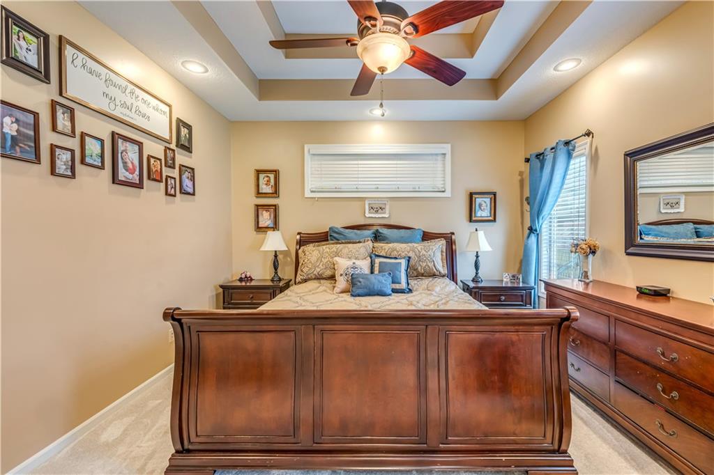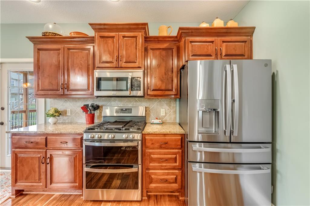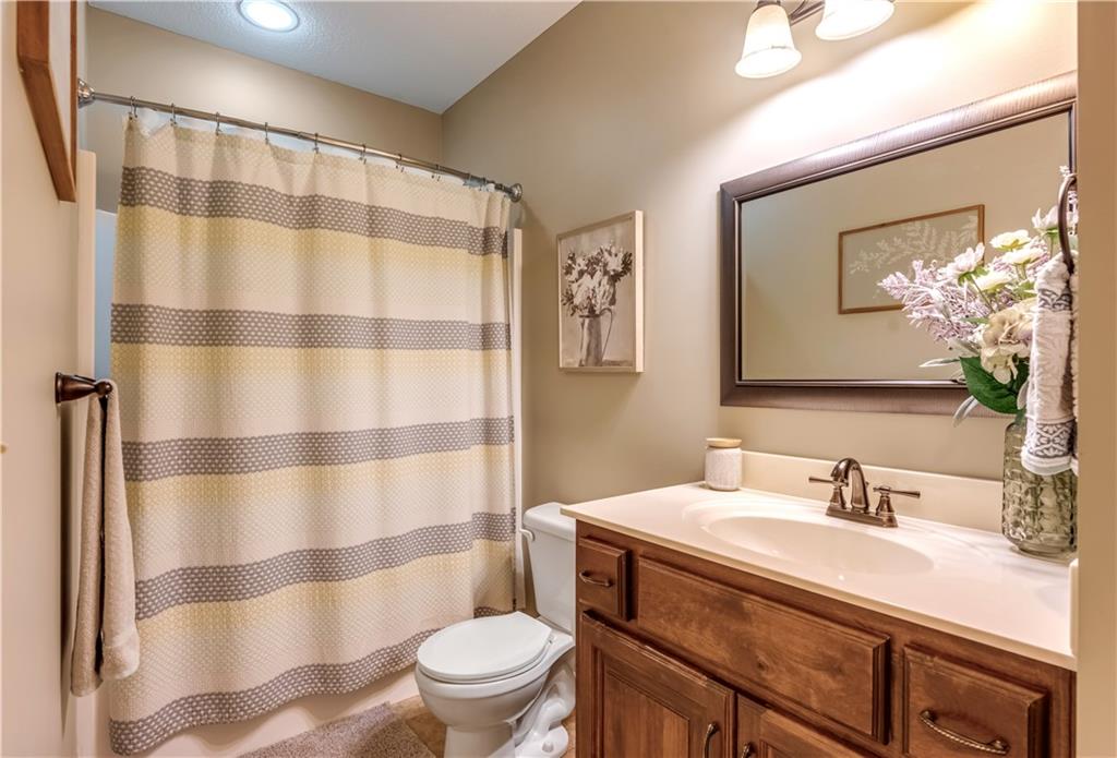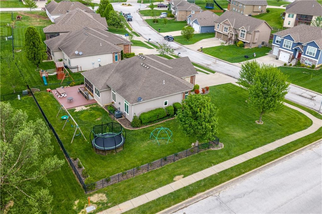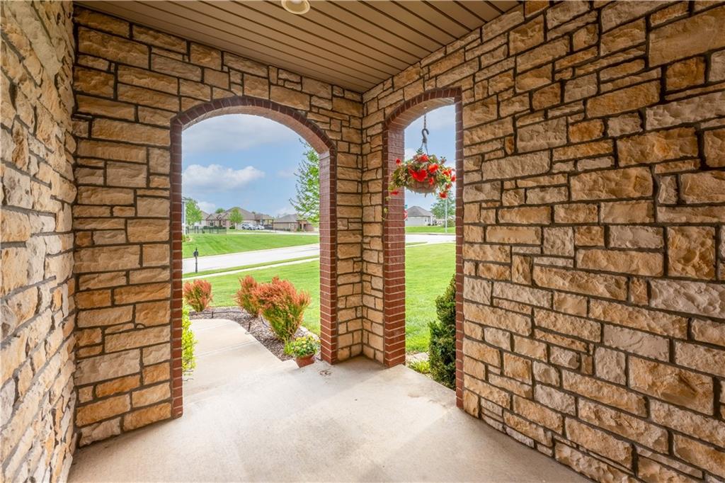 Your beautiful home is ready for you in the desirable Cayhill subdivision, known for holiday events, walkability, and commuting convenience to Whiteman AFB! This immaculate reverse ranch sits on a large corner lot with subdivision lake privileges, just minutes to shopping and restaurants in town. The welcoming front porch ushers you into warm hardwood hand-scraped floors and an open concept great room with tall ceilings. Enjoy the warmth of the gas fireplace with stone surround and still have connection to the Kitchen/Dining Room activities. Sellers have increased energy efficiency with window replacement in LR, DR, back secondary Bedroom, and hall Bathroom June 2025. Your large Kitchen has an abundance of custom wood cabinetry, granite counters, stainless steel appliances that all stay (Fridge, double oven, and dishwasher less than a year old!) and a dedicated pantry directly off the Kitchen. Main floor laundry is also nearby. The generous Primary Bedroom showcases a walk-in closet, newer carpet, and a beautifully updated on-suite Bathroom with new floor tile, newly tiled shower, new glass door, double vanity, and jetted tub. The two secondary Bedrooms have larger closets with storage systems and newer carpet with the hall Bathroom between. The lower level includes a full bar (drink fridge will stay) and service area off of the spacious Family Room, the 4th true Bedroom with a walk-in closet, another nonconforming room for many uses, and a 3rd full Bathroom. The 300 SF storage area includes a utility sink, storm shelter, NEW AC and furnace in 2025! Head out the patio door upstairs to the screened-in deck for relaxation without bugs! The basement patio leads up to the wide, newly stained back deck with a dedicated gas line for a firepit or grill. Play options abound with a swing-set and more in the fenced yard with in-ground sprinkler system. Come make new memories here!