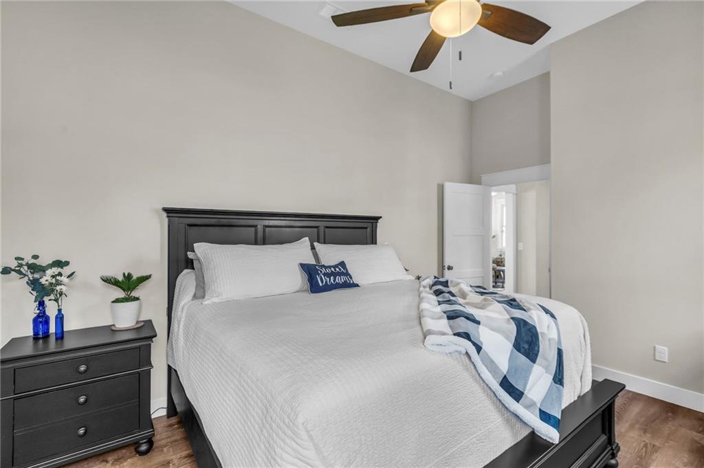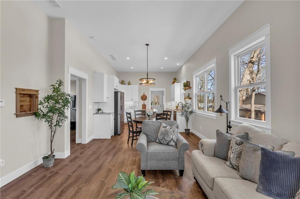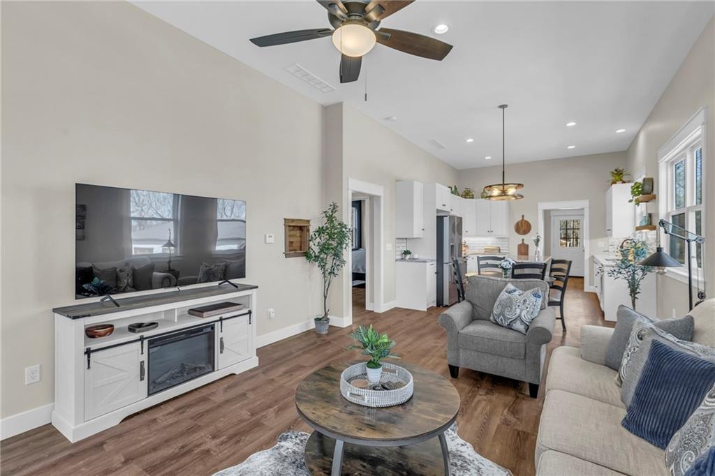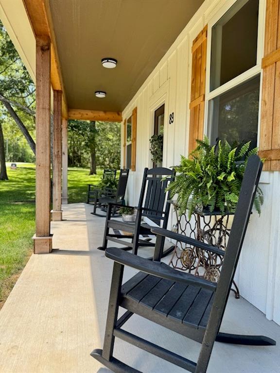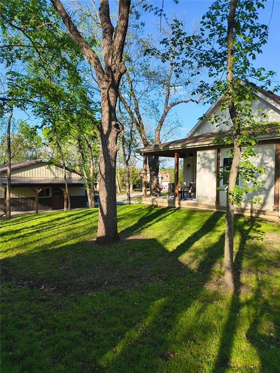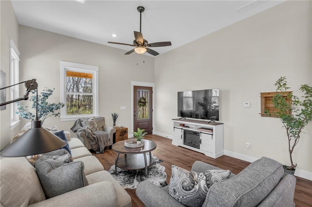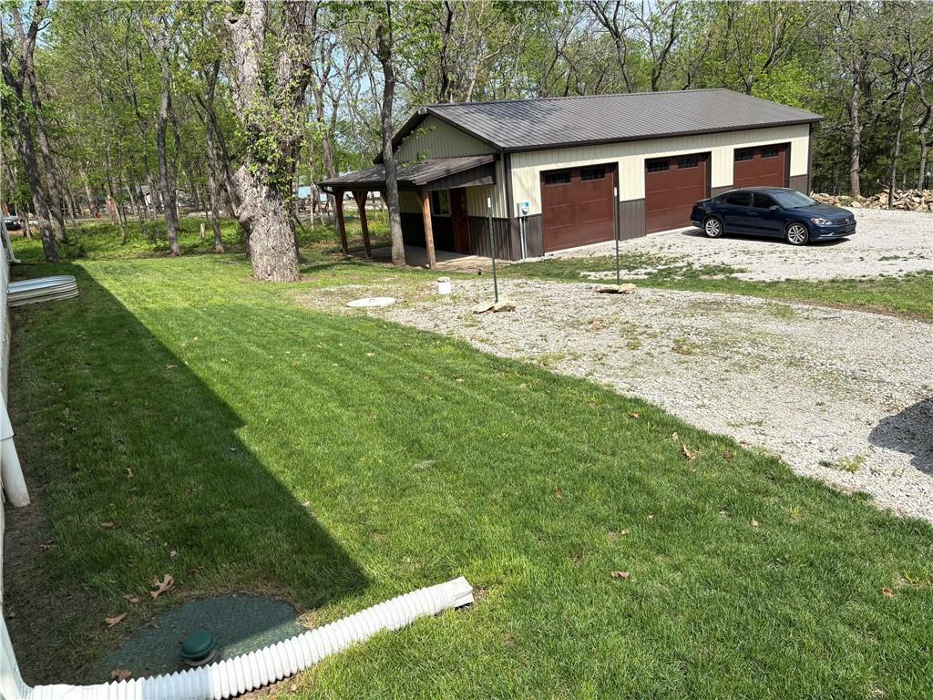 Step into a world of modern luxury and thoughtful design in this stunning two-bedroom, two-bathroom sanctuary, with a private office in back, with its own dedicated entrance, perfect for an at-home business. An inviting front porch welcomes you into a bright, airy open floor plan defined by soaring 11-foot ceilings and elegant, durable luxury vinyl plank flooring that flows seamlessly throughout. The gourmet kitchen serves as a contemporary culinary hub, boasting tall cabinetry with soft-close hardware, sleek quartz countertops, and premium stainless-steel appliances. Retreat to the tranquil master suite, highlighted by a stylish accent wall and a spa-like ensuite featuring a beautifully tiled shower, double vanities, and a generous walk-in closet. Practicality meets comfort with a conveniently located laundry room and an on-demand water heater for instant warmth. Beyond the main living areas, you will find a lovely covered back deck that overlooks a serene wooded backdrop. The property includes the adjacent lot at 93 Enchanted Lane and a large outbuilding equipped with three 10-foot overhead doors, concrete floors, electricity, and a built-in storm shelter, providing the perfect space for hobbies or enjoying the local wildlife from the shade of the overhang. Mechanically sound with 200-amp service, city sewer, and plumbing ready for future rural water connection. There is an option to purchase the home without the building and the extra lot. This home is just a 3 minute walk from the "Big Lake," with access to swimming, and lots of lake fun! Residents also enjoy a wealth of community amenities, from golf courses and swimming pools to hiking trails and a clubhouse. This is an incredible opportunity to embrace a move-in-ready lifestyle that perfectly balances quiet lakeside solitude with exciting recreational opportunities.