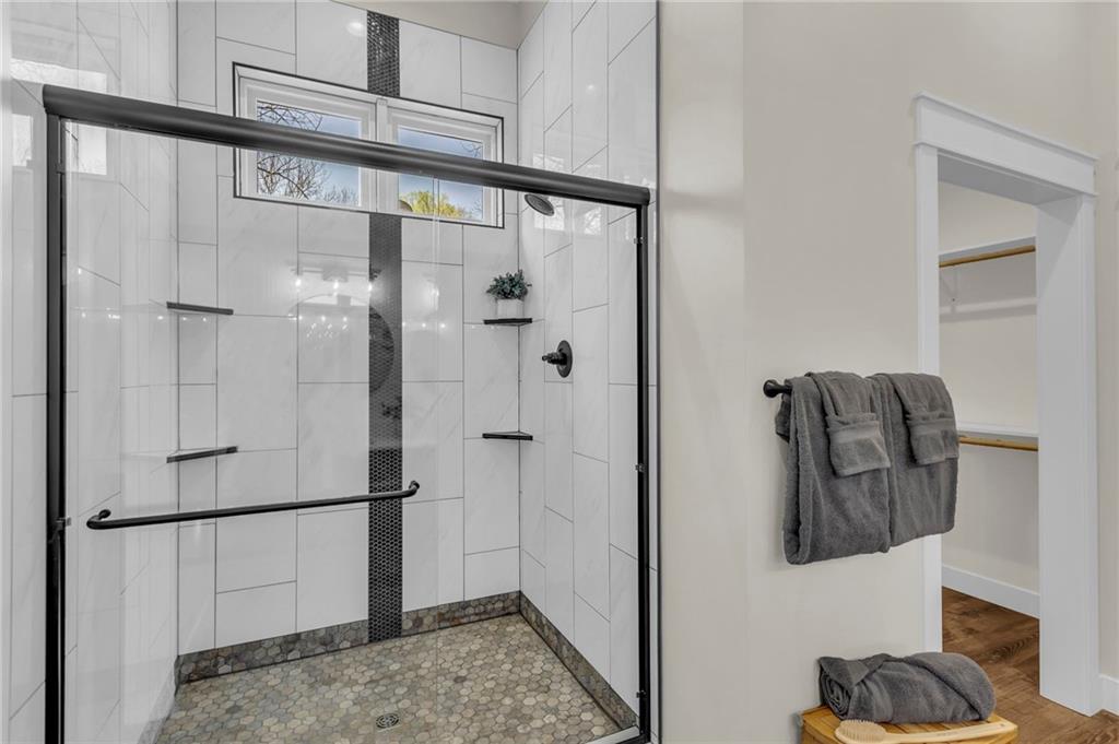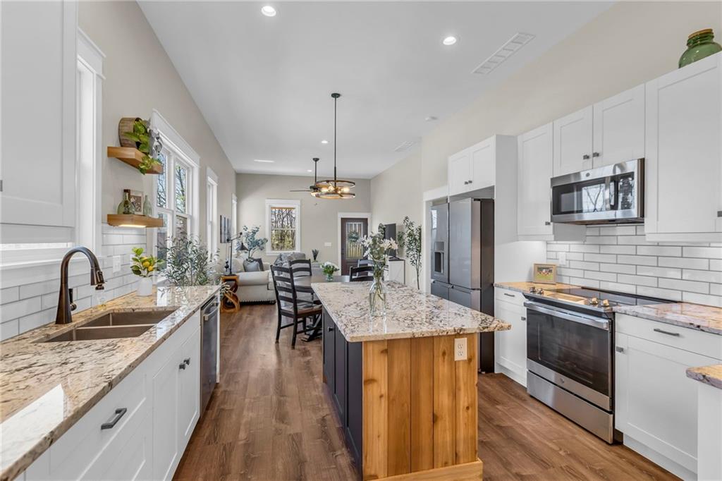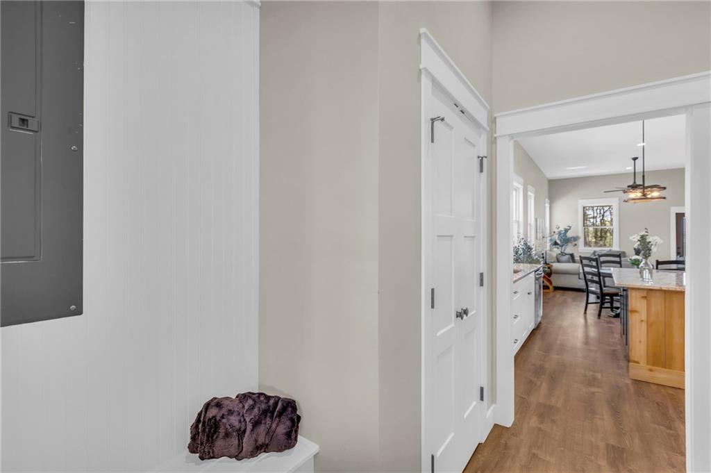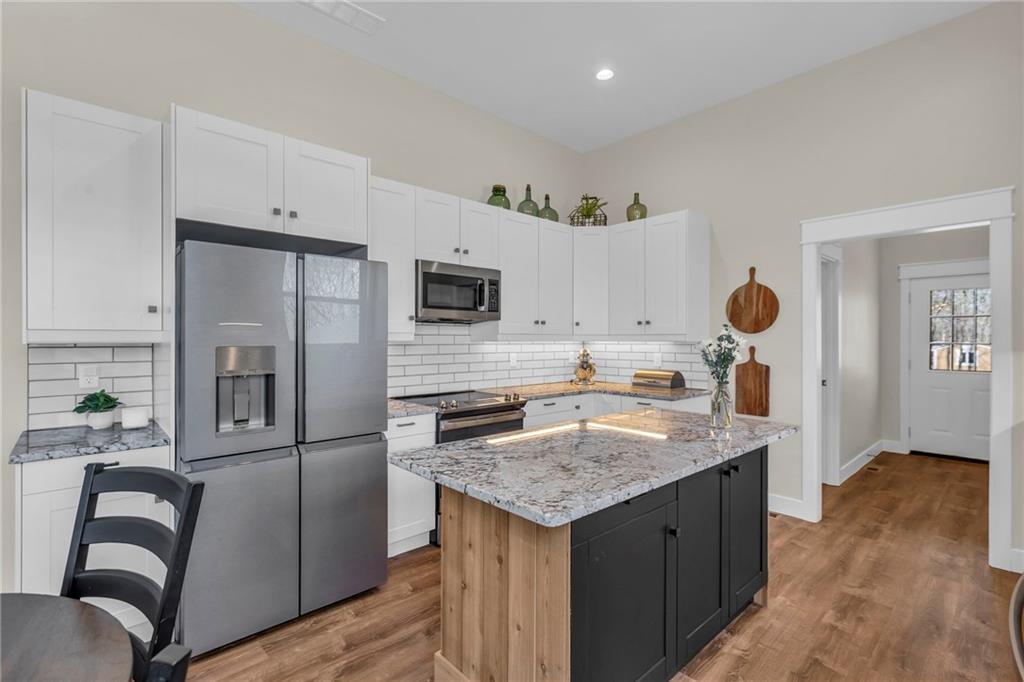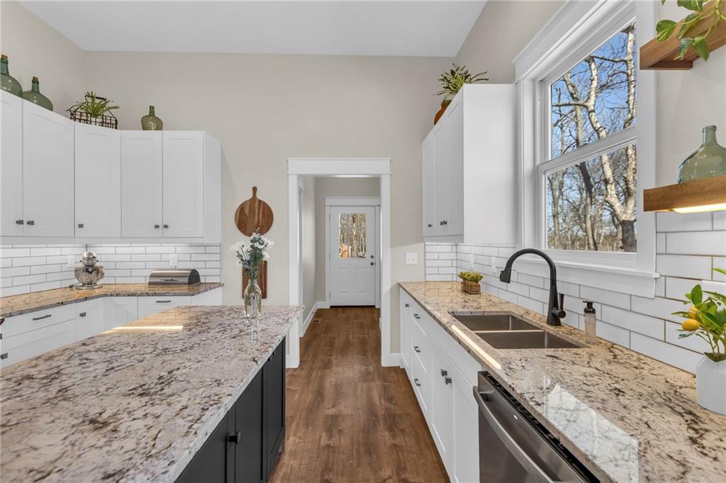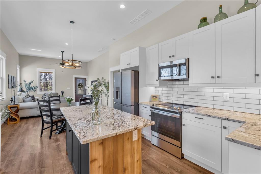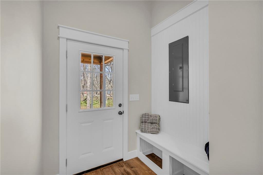 Step into a world of modern luxury and thoughtful design in this stunning two-bedroom, two-bathroom sanctuary, with a private office in back, with its own dedicated entrance, perfect for an at-home business. An inviting front porch welcomes you into a bright, airy open floor plan defined by soaring 11-foot ceilings and elegant, durable luxury vinyl plank flooring that flows seamlessly throughout. The gourmet kitchen serves as a contemporary culinary hub, boasting tall cabinetry with soft-close hardware, sleek quartz countertops, and premium stainless-steel appliances. Retreat to the tranquil master suite, highlighted by a stylish accent wall and a spa-like ensuite featuring a beautifully tiled shower, double vanities, and a generous walk-in closet. Practicality meets comfort with a conveniently located laundry room and an on-demand water heater for instant warmth. Beyond the main living areas, you will find a lovely covered back deck that overlooks a serene wooded backdrop. The property includes the adjacent lot at 93 Enchanted Lane and a large outbuilding equipped with three 10-foot overhead doors, concrete floors, electricity, and a built-in storm shelter, providing the perfect space for hobbies or enjoying the local wildlife from the shade of the overhang. Mechanically sound with 200-amp service, city sewer, and plumbing ready for future rural water connection. There is an option to purchase the home without the building and the extra lot. This home is just a 3 minute walk from the "Big Lake," with access to swimming, and lots of lake fun! Residents also enjoy a wealth of community amenities, from golf courses and swimming pools to hiking trails and a clubhouse. This is an incredible opportunity to embrace a move-in-ready lifestyle that perfectly balances quiet lakeside solitude with exciting recreational opportunities.