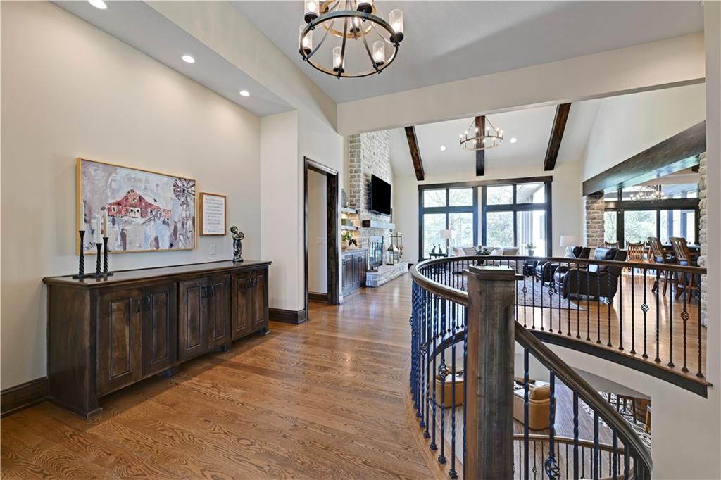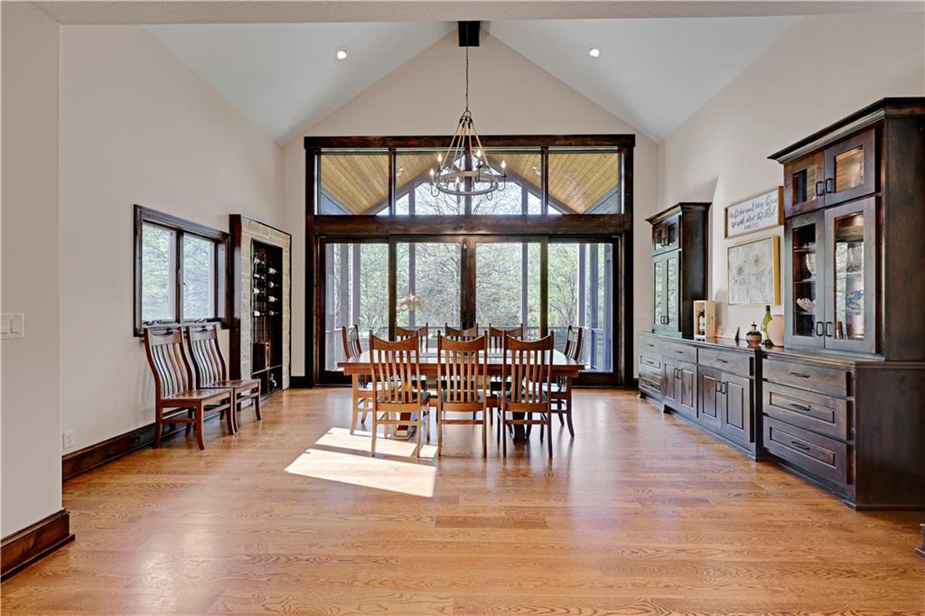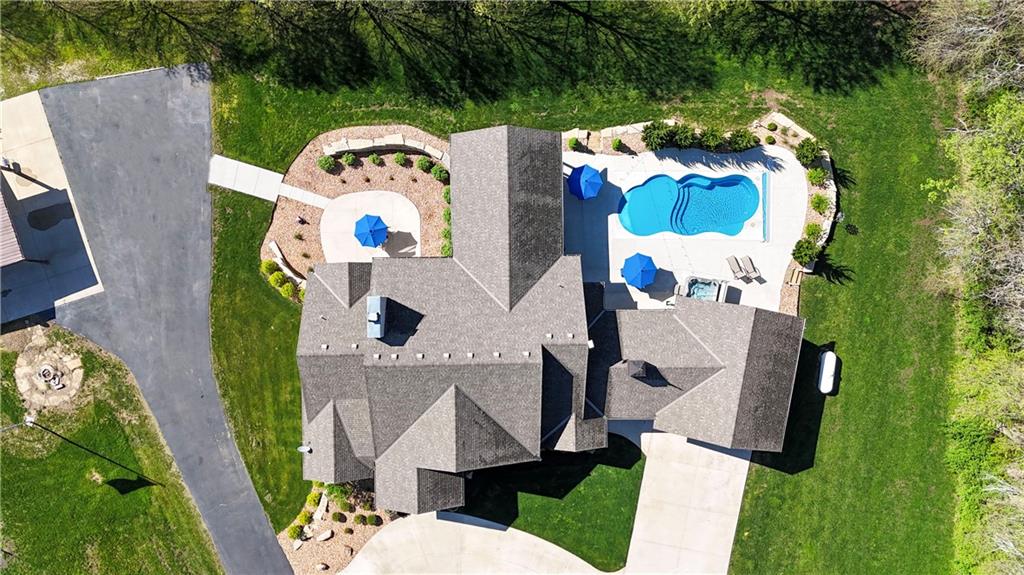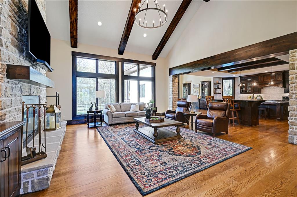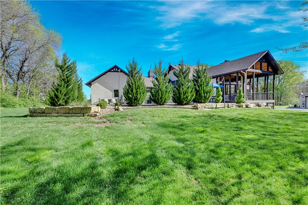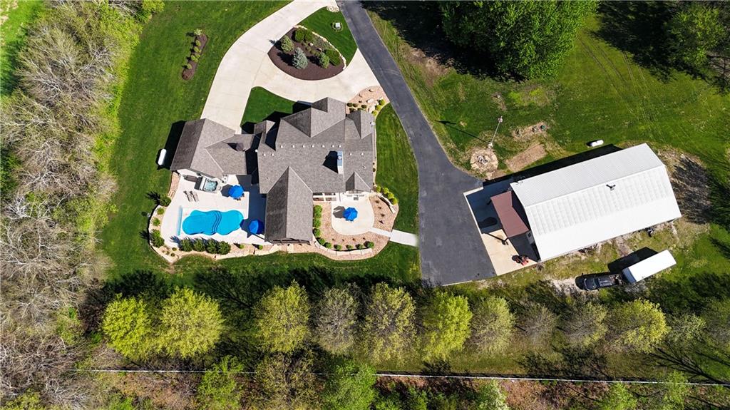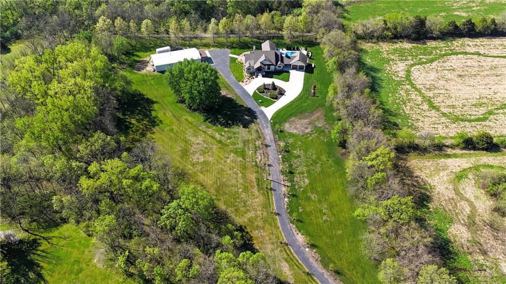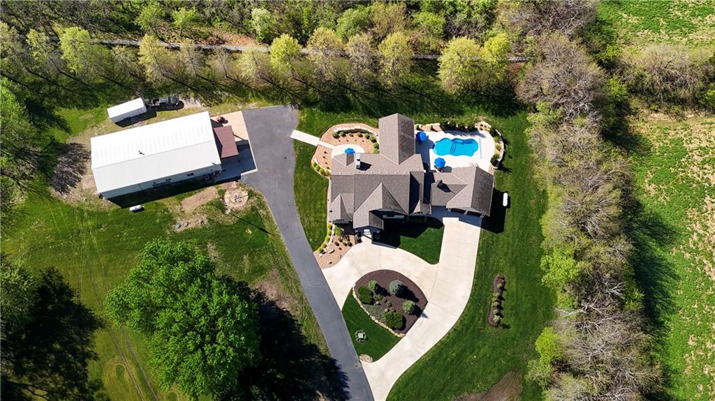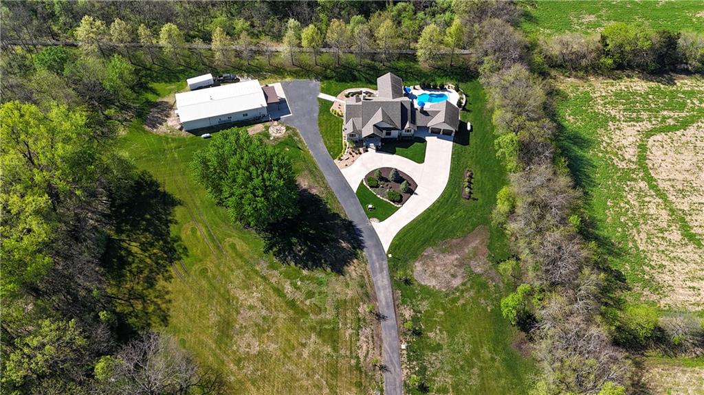 Welcome to this stunning Bruce Rieke custom built reverse 1.5-story estate, perfectly situated on nearly 8 acres of picturesque land. Thoughtfully designed with both luxury and functionality in mind, this home offers an exceptional blend of refined interior spaces and resort-style outdoor living. The main level features a chef’s designer kitchen with high-end finishes and ample space for entertaining, flowing seamlessly into a breathtaking great room highlighted by soaring vaulted ceilings and striking wood beams. The primary suite is a true retreat, complete with a cozy fireplace and a spa-like atmosphere. A dedicated office with an attached full bath provides flexibility for work or guest accommodations. The finished lower level is ideal for entertaining or multi-generational living, boasting a spacious family/media room, multiple seating areas, a wet bar/kitchenette, two additional bedrooms, and two full bathrooms. Step outside to your private oasis, where you’ll find an incredible outdoor living area featuring a fully equipped outdoor kitchen, an in-ground pool, a covered deck, and an expansive patio—perfect for relaxing or hosting gatherings. An additional outbuilding adds versatility and storage options to this already impressive property. This rare offering combines privacy, luxury, and space—creating the perfect place to call home.