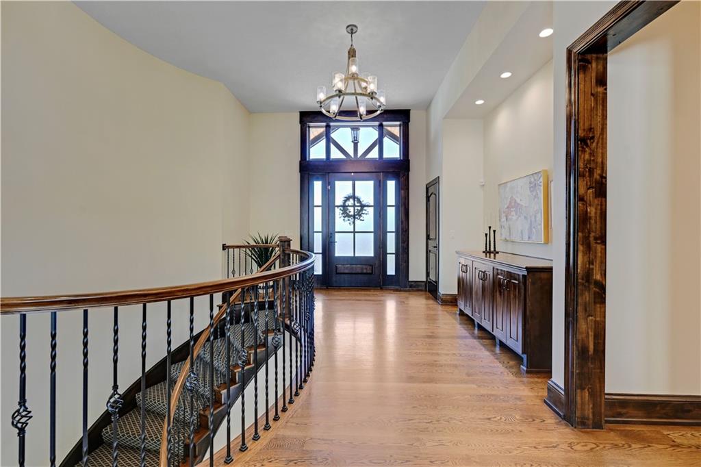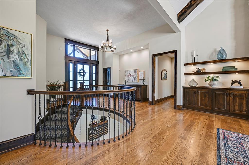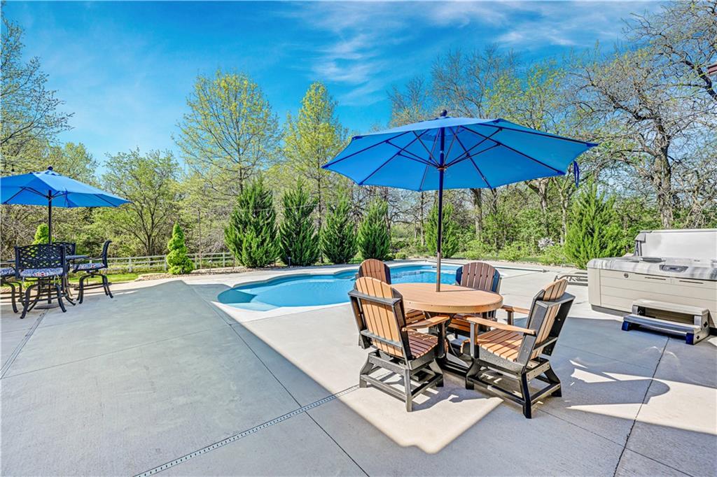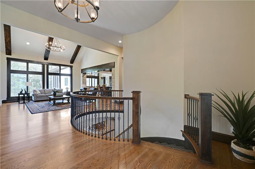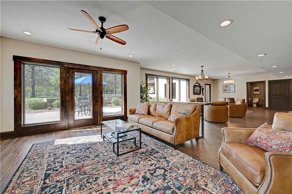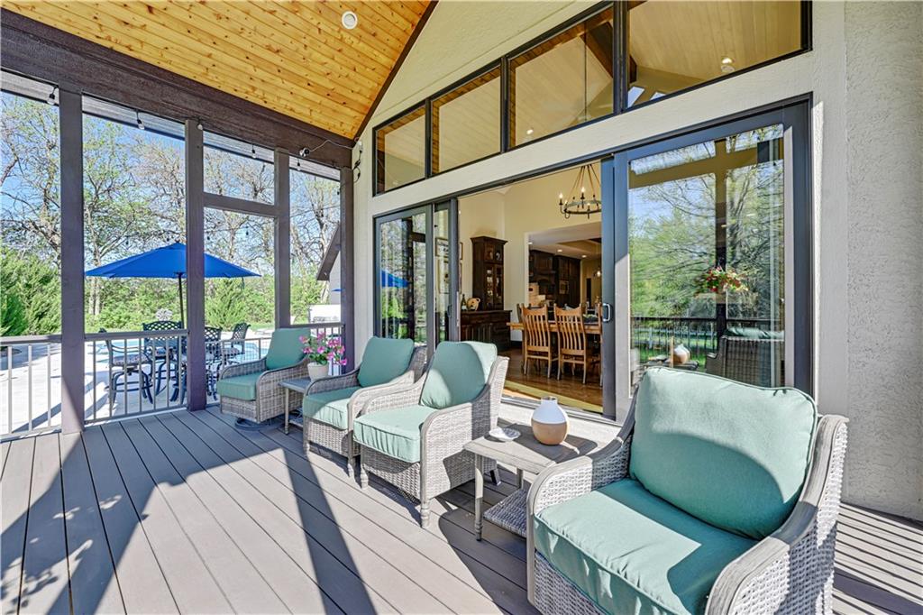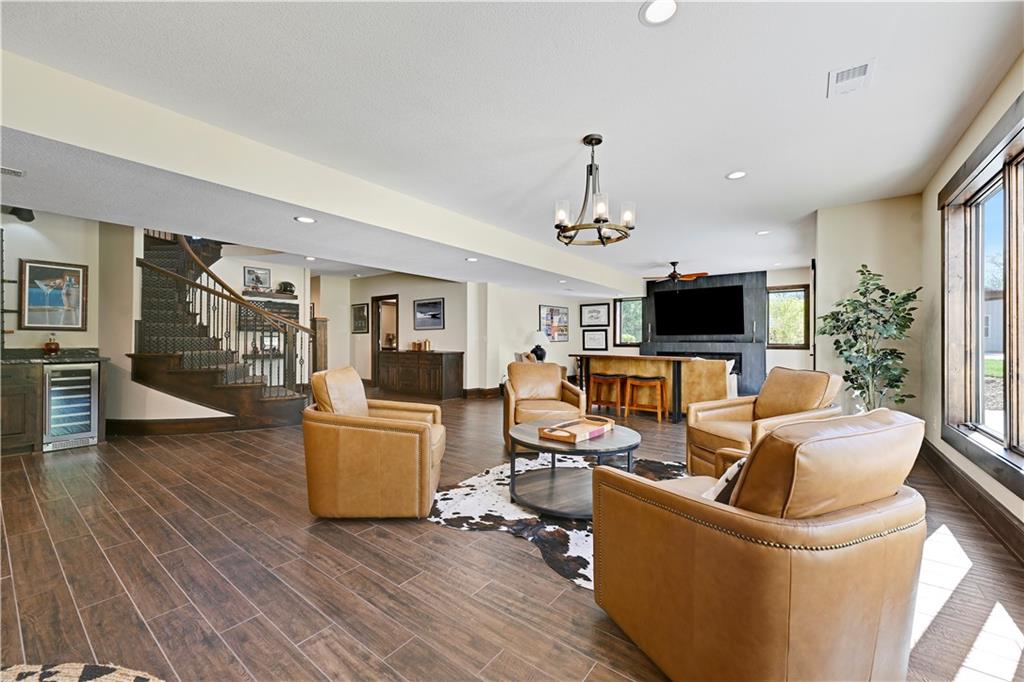 Welcome to this stunning Bruce Rieke custom built reverse 1.5-story estate, perfectly situated on nearly 8 acres of picturesque land. Thoughtfully designed with both luxury and functionality in mind, this home offers an exceptional blend of refined interior spaces and resort-style outdoor living. The main level features a chef’s designer kitchen with high-end finishes and ample space for entertaining, flowing seamlessly into a breathtaking great room highlighted by soaring vaulted ceilings and striking wood beams. The primary suite is a true retreat, complete with a cozy fireplace and a spa-like atmosphere. A dedicated office with an attached full bath provides flexibility for work or guest accommodations. The finished lower level is ideal for entertaining or multi-generational living, boasting a spacious family/media room, multiple seating areas, a wet bar/kitchenette, two additional bedrooms, and two full bathrooms. Step outside to your private oasis, where you’ll find an incredible outdoor living area featuring a fully equipped outdoor kitchen, an in-ground pool, a covered deck, and an expansive patio—perfect for relaxing or hosting gatherings. An additional outbuilding adds versatility and storage options to this already impressive property. This rare offering combines privacy, luxury, and space—creating the perfect place to call home.