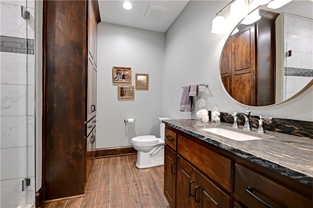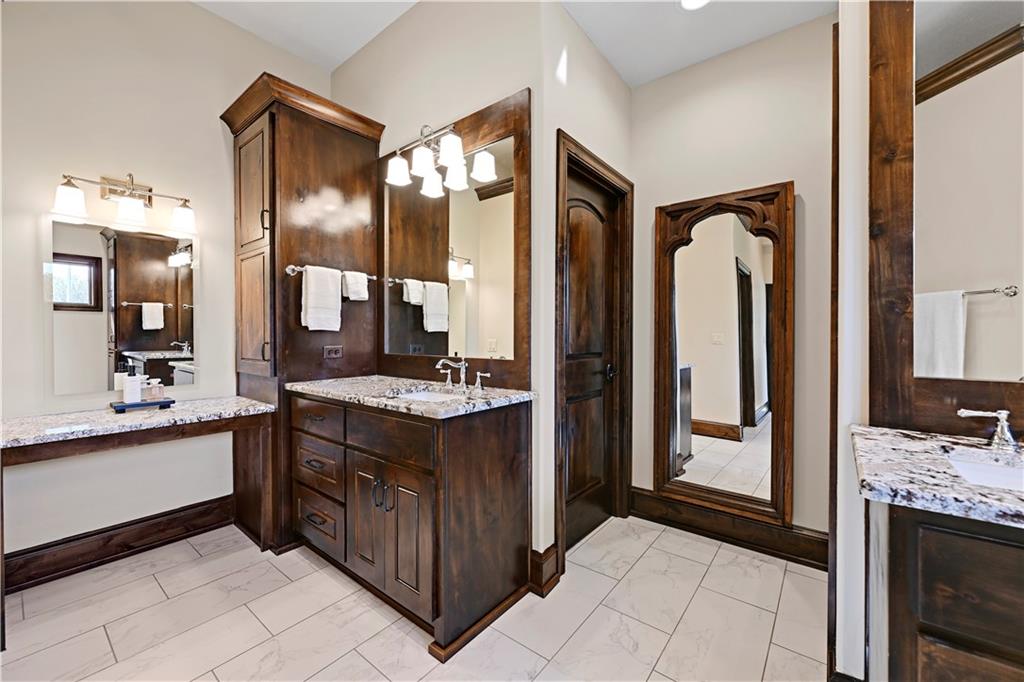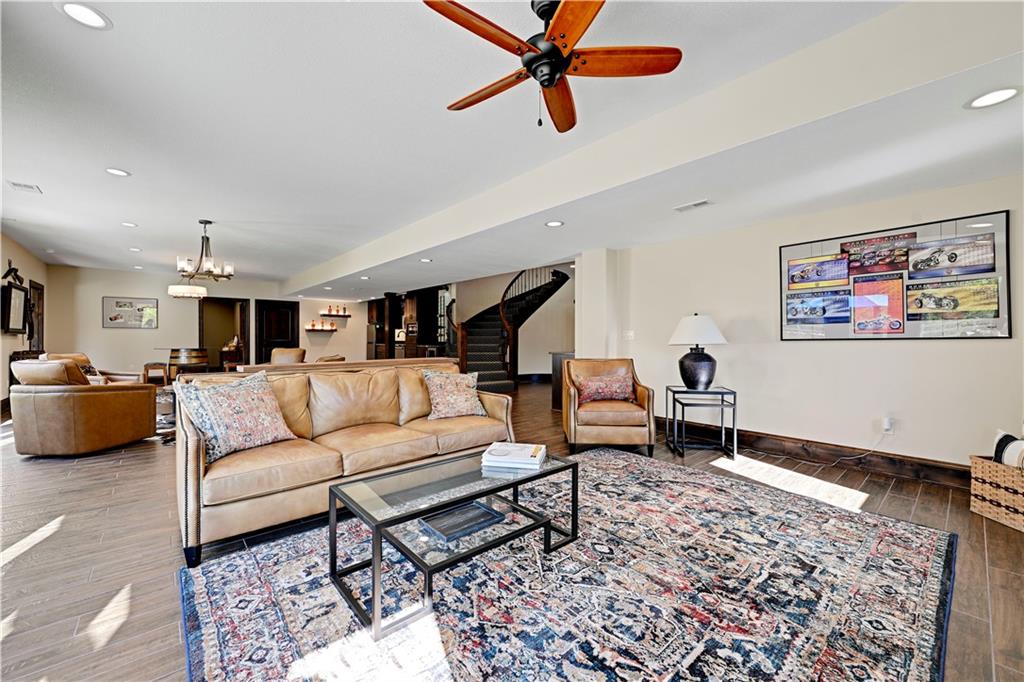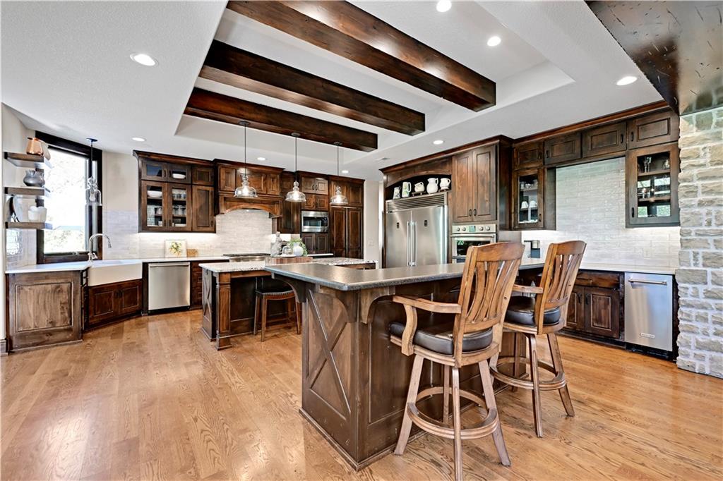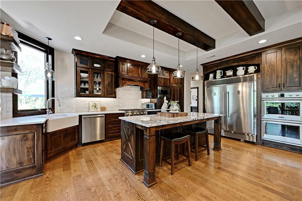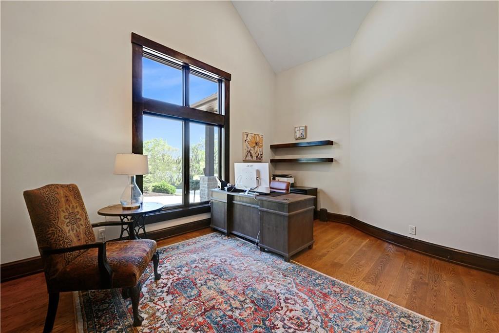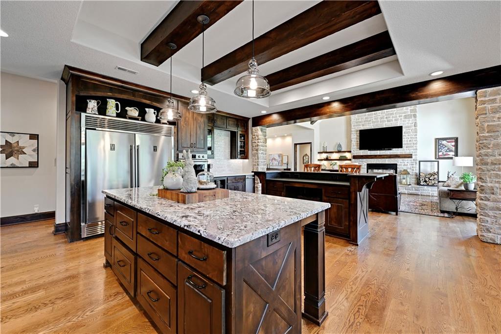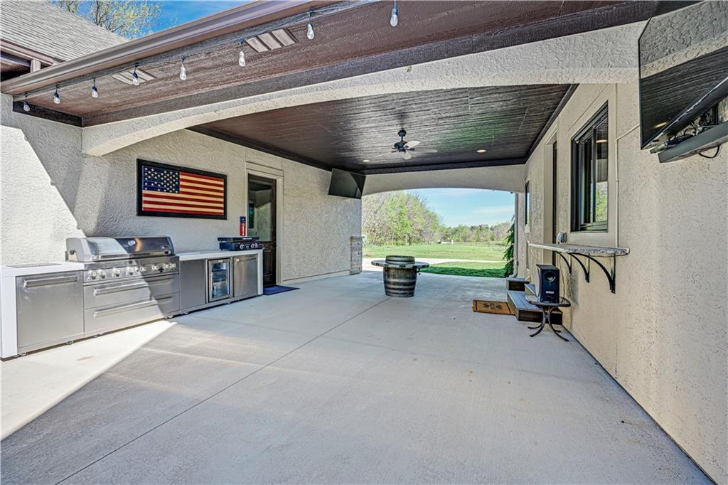 Welcome to this stunning Bruce Rieke custom built reverse 1.5-story estate, perfectly situated on nearly 8 acres of picturesque land. Thoughtfully designed with both luxury and functionality in mind, this home offers an exceptional blend of refined interior spaces and resort-style outdoor living. The main level features a chef’s designer kitchen with high-end finishes and ample space for entertaining, flowing seamlessly into a breathtaking great room highlighted by soaring vaulted ceilings and striking wood beams. The primary suite is a true retreat, complete with a cozy fireplace and a spa-like atmosphere. A dedicated office with an attached full bath provides flexibility for work or guest accommodations. The finished lower level is ideal for entertaining or multi-generational living, boasting a spacious family/media room, multiple seating areas, a wet bar/kitchenette, two additional bedrooms, and two full bathrooms. Step outside to your private oasis, where you’ll find an incredible outdoor living area featuring a fully equipped outdoor kitchen, an in-ground pool, a covered deck, and an expansive patio—perfect for relaxing or hosting gatherings. An additional outbuilding adds versatility and storage options to this already impressive property. This rare offering combines privacy, luxury, and space—creating the perfect place to call home.